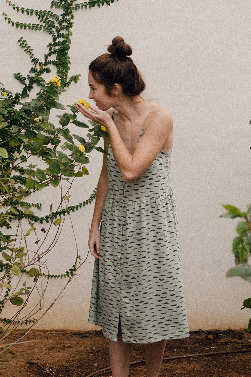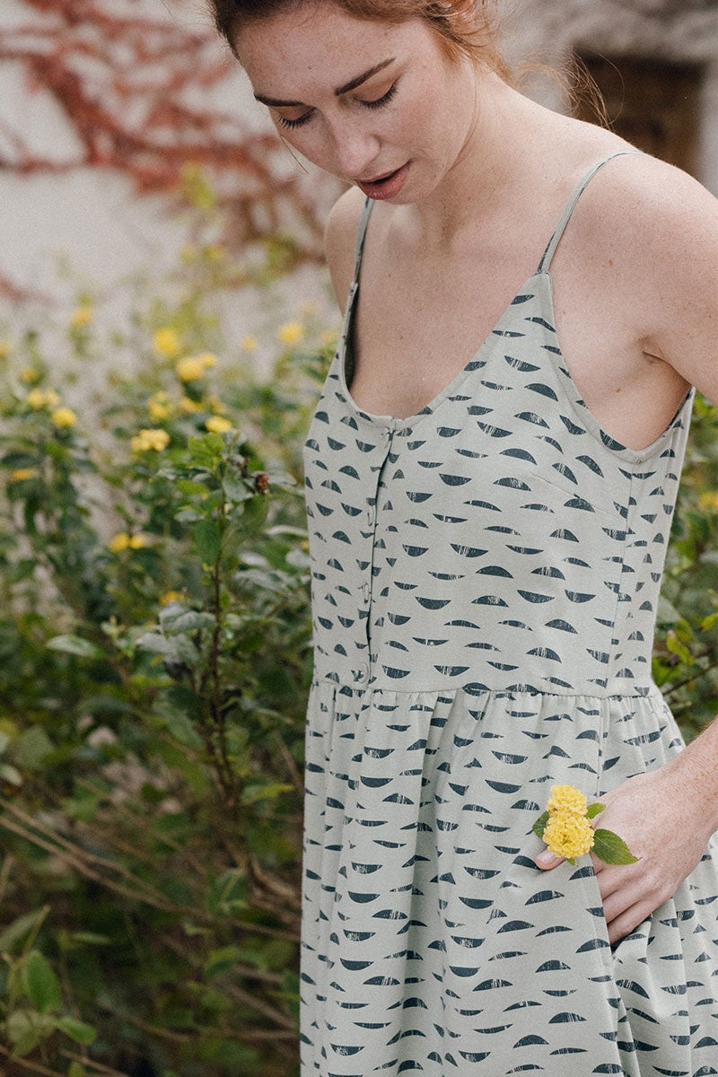 Elma is an oversize knit dress. It has adjustable thin straps and a slit with beautiful functional buttons. It also has practical pockets on the sides. Loose-fitting silhouette, choose your size depending on whether you like to go more or less tight. It is a versatile garment that you can wear with a T-shirt underneath during the off-season or you can also wear it without anything during the hottest days of the summer. The emerald green water reflections print, from the Aqua collection, inspired by one of life’s essential elements, gives the garment a unique and special touch.