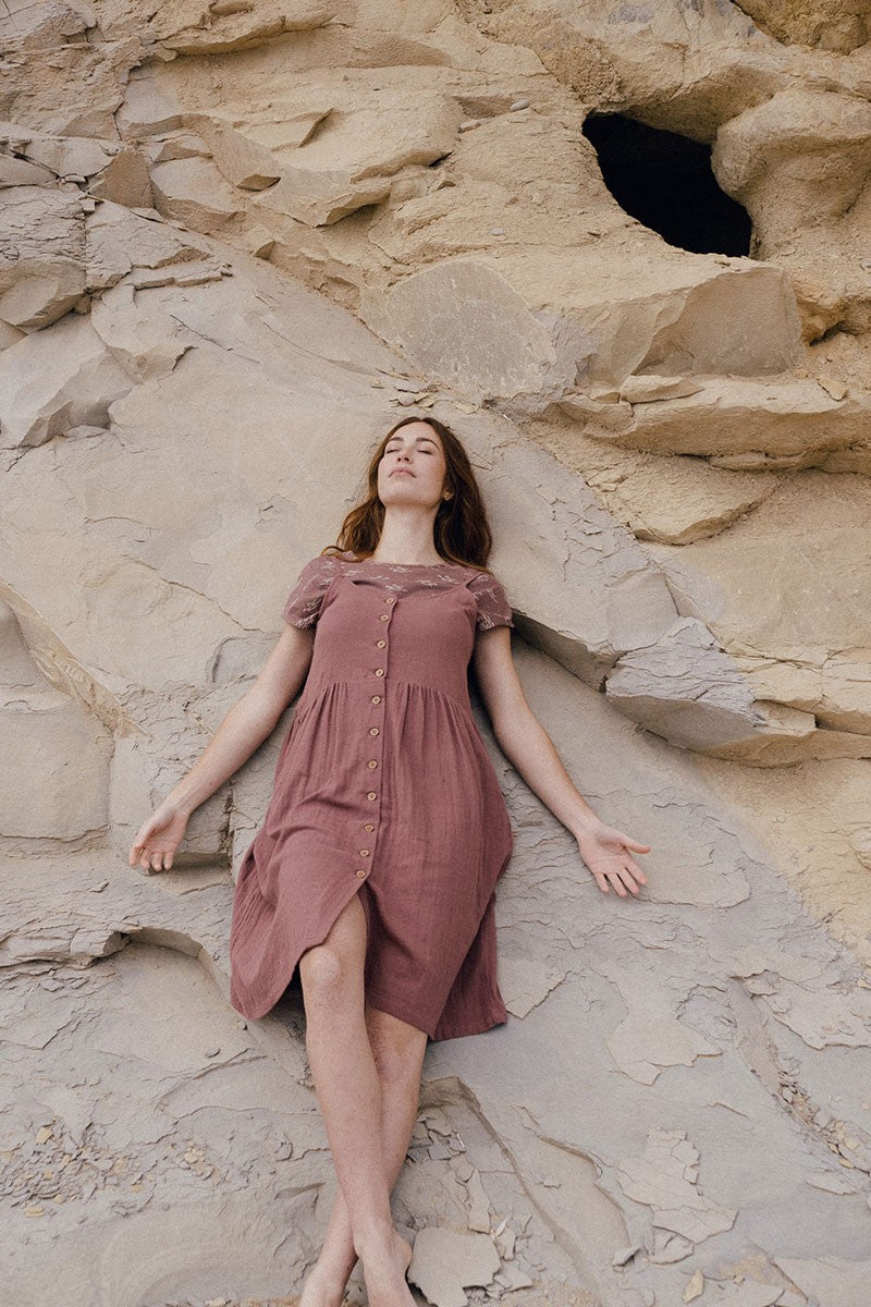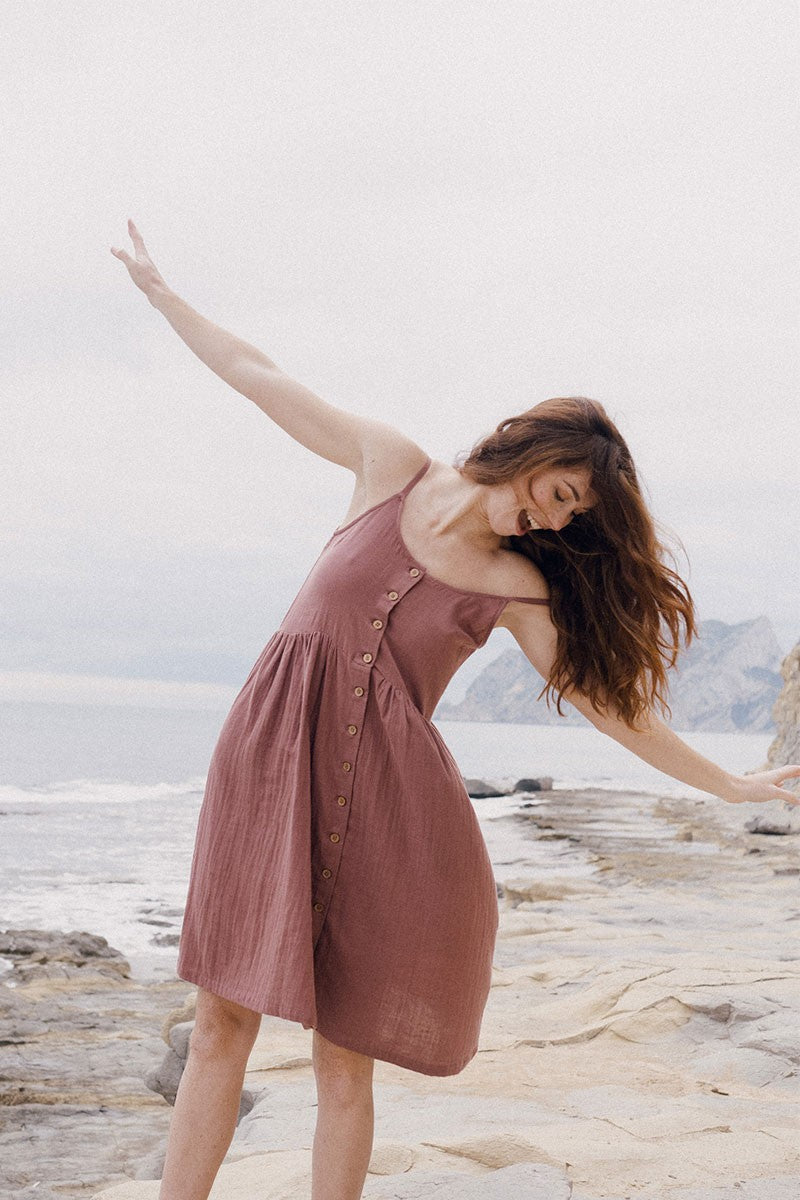Elma is an oversize knit dress with adjustable straps. It has a slit with beautiful functional buttons and has practical pockets on the sides. It is a loose-fitting silhouette model, choose your size depending on whether you like to go more or less tight, as it is a relaxed model. A versatile garment that you can wear with a T-shirt underneath during the mid-season months or without it during the hottest days of summer. A basic garment in mauve color perfect to combine with a wide range of garments. It is made of muslin fabric, making it very soft and pleasant to the touch.