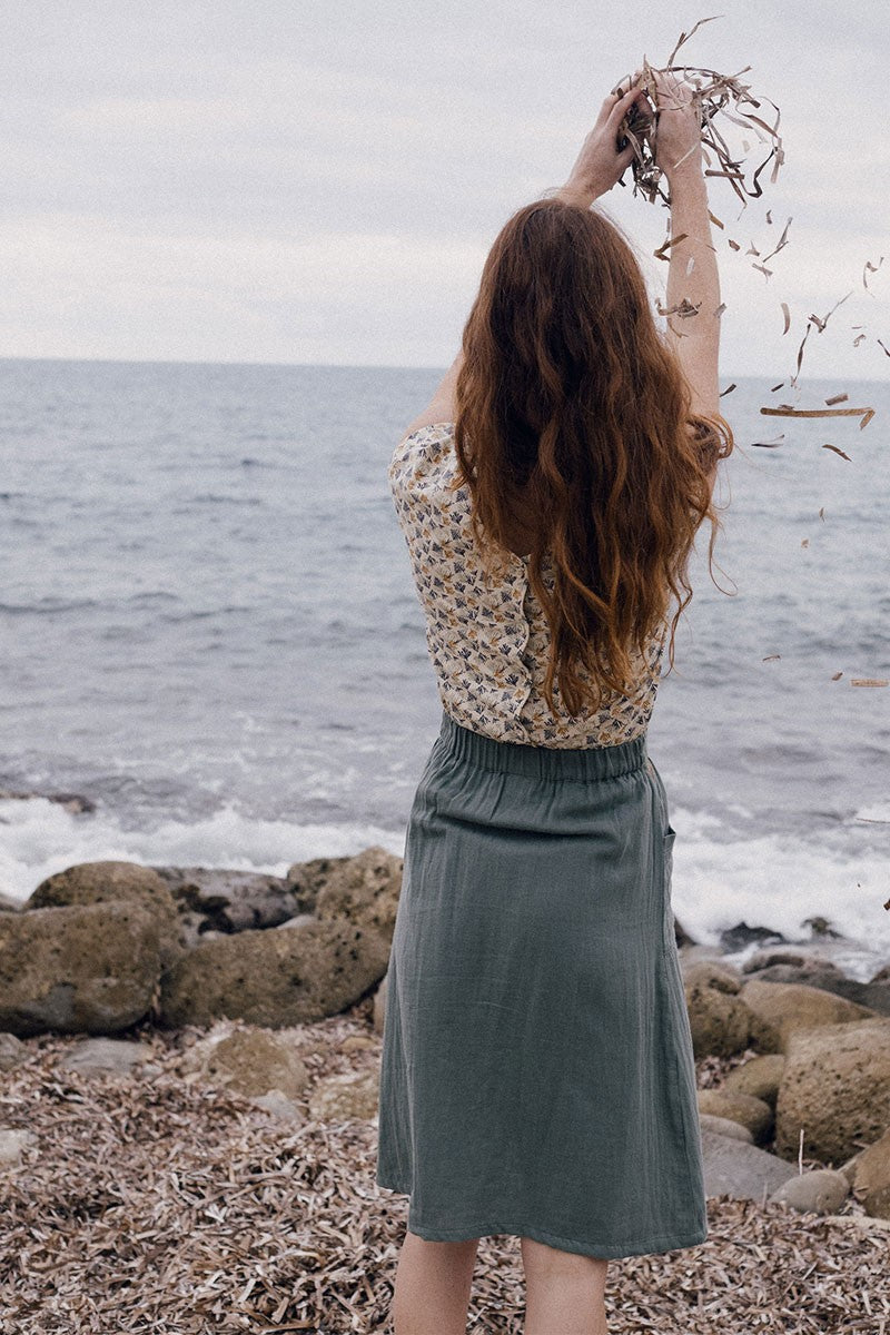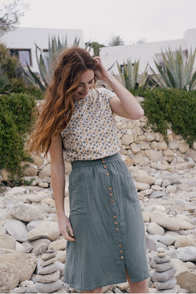 Emma is a knitted midi skirt with pockets and slit with beautiful functional buttons. It has a back elastic to better adapt to your silhouette. A soft and comfortable garment that you can wear all year round. A timeless green basic that you can combine with the Elaine T-shirt in the same color to get a spectacular outfit. It is made of muslin fabric, which is very soft and pleasant to the touch.
