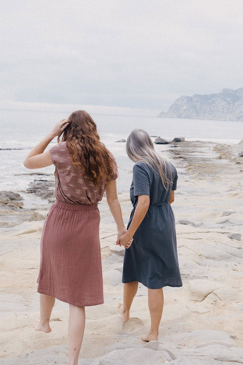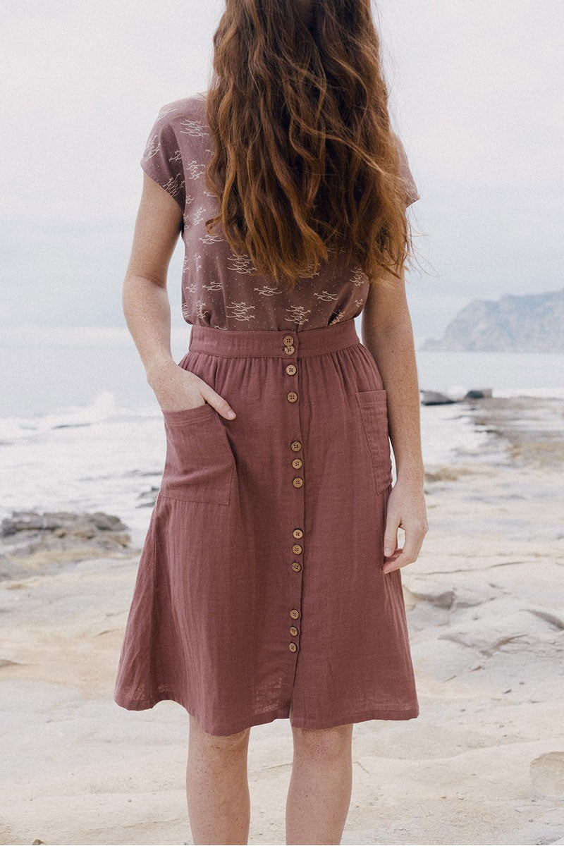 Emma is a knitted midi skirt with pockets and slit with beautiful functional buttons. It has a back elastic to better adapt to your silhouette. a soft and comfortable garment that you can wear all year round. A timeless mauve basic that you can combine with the Elaine T-shirt in the same color to get a spectacular outfit. It is made of muslin fabric, which is very soft and pleasant to the touch.