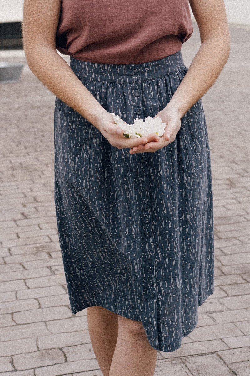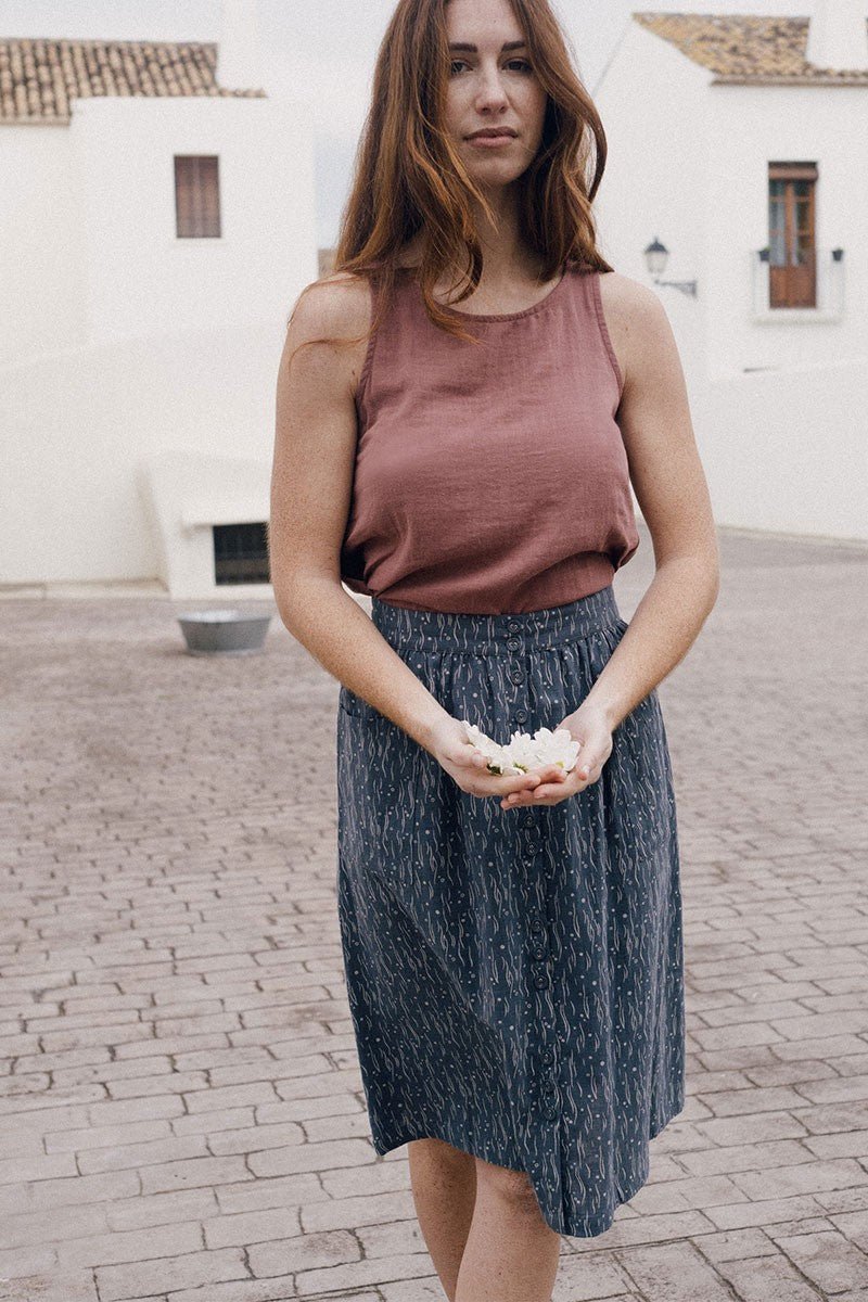 Emma is a knitted midi skirt with pockets and slit with beautiful functional buttons. It has a back elastic to better adapt to your silhouette. A comfortable garment that you can wear from spring to autumn. An elegant, soft and flowing garment. The sea mist print in blue from the Aqua collection, inspired by one of the essential life elements, gives it that unique and special touch. It is made of a fabric similar to linen, fresh and very pleasant to the touch. Wear it with the Eneida Top to get the complete look.