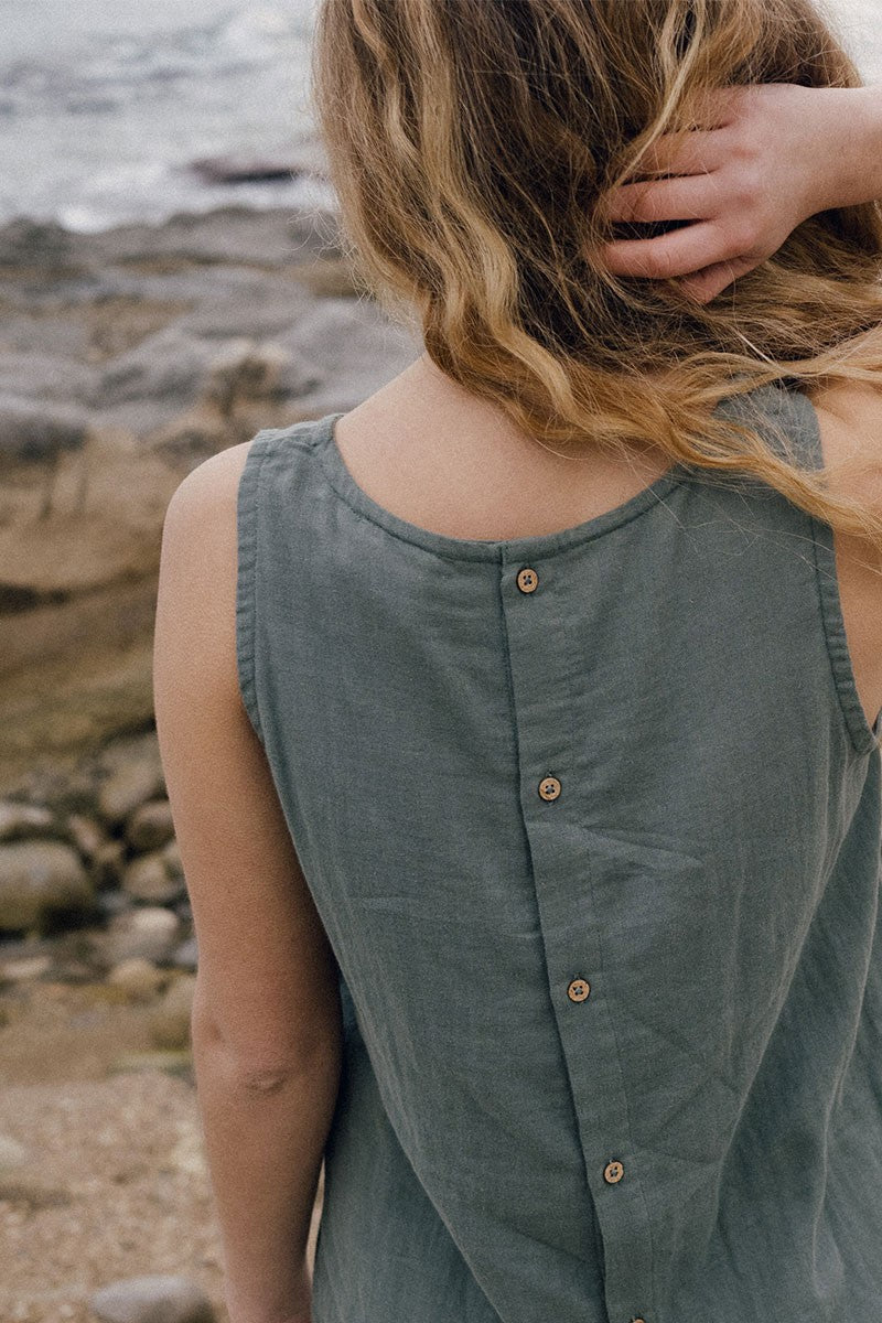 Eneida is a muslin tank top with a slit and beautiful functional coconut buttons on the back. It is an evasé silhouette garment, loose and very cool for the hottest…