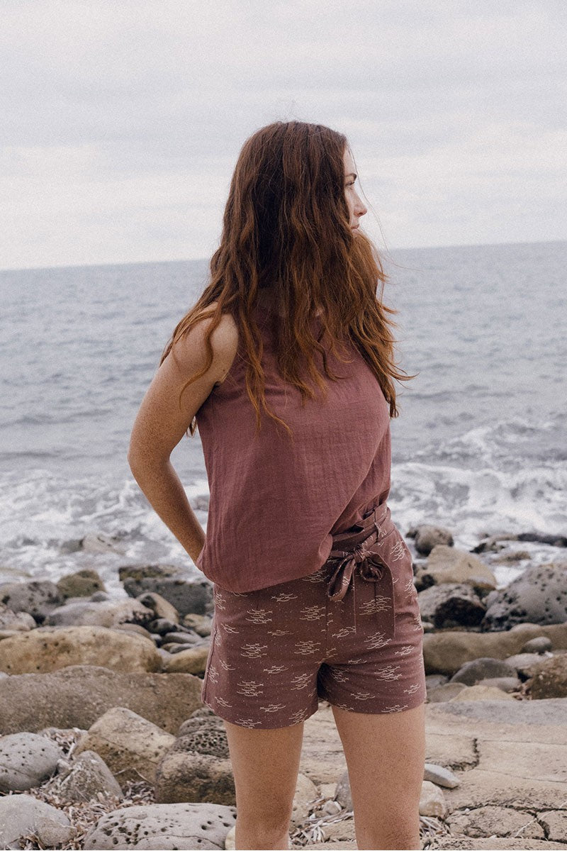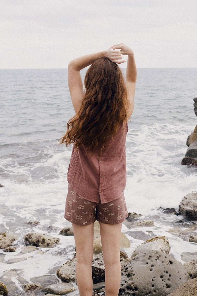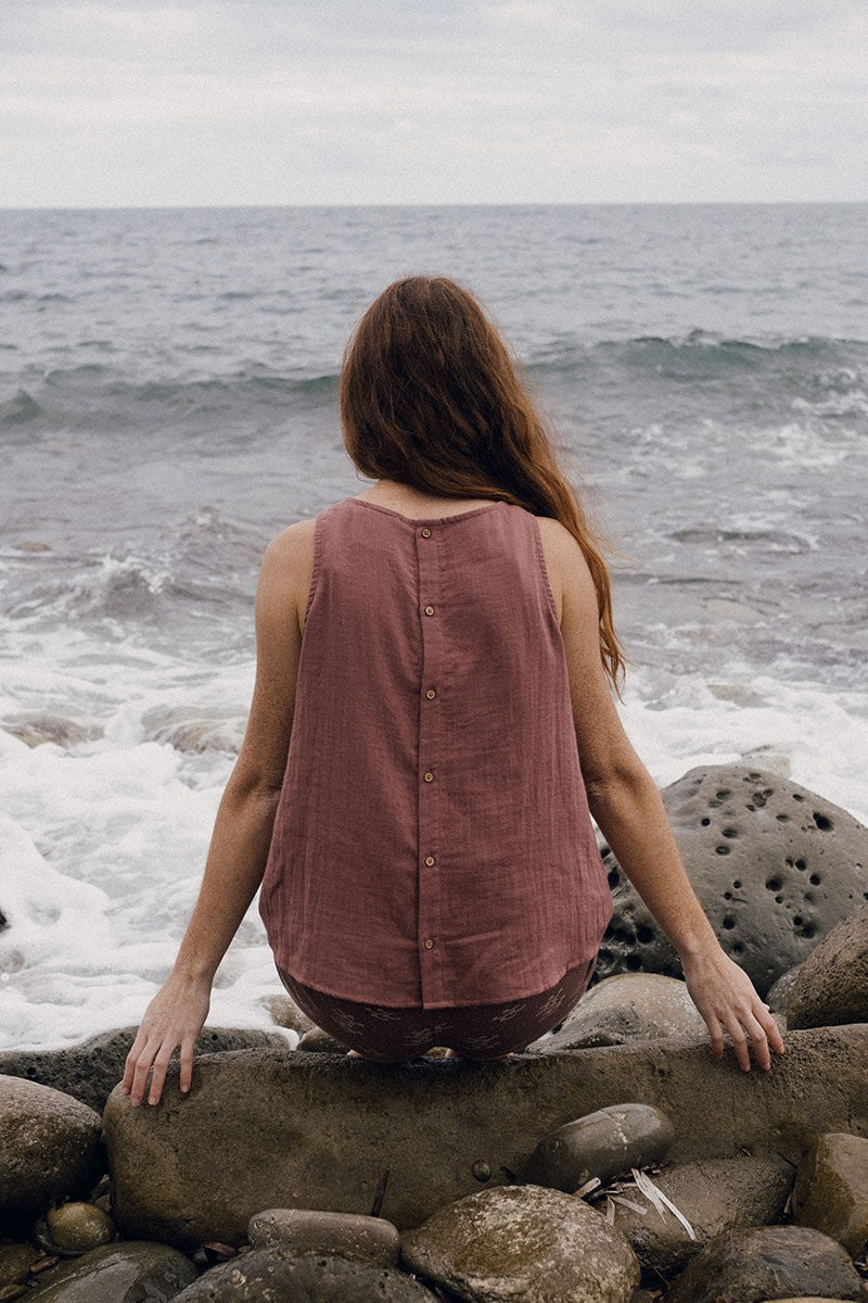 Eneida is a muslin tank top with a slit and beautiful functional coconut buttons on the back. It is an evasé silhouette garment, loose and very fresh for the hottest days, soft and very pleasant to the touch. A timeless basic in mauve easy to combine with an infinite number of garments. It is made of muslin fabric, making it very smooth and nice to the touch.