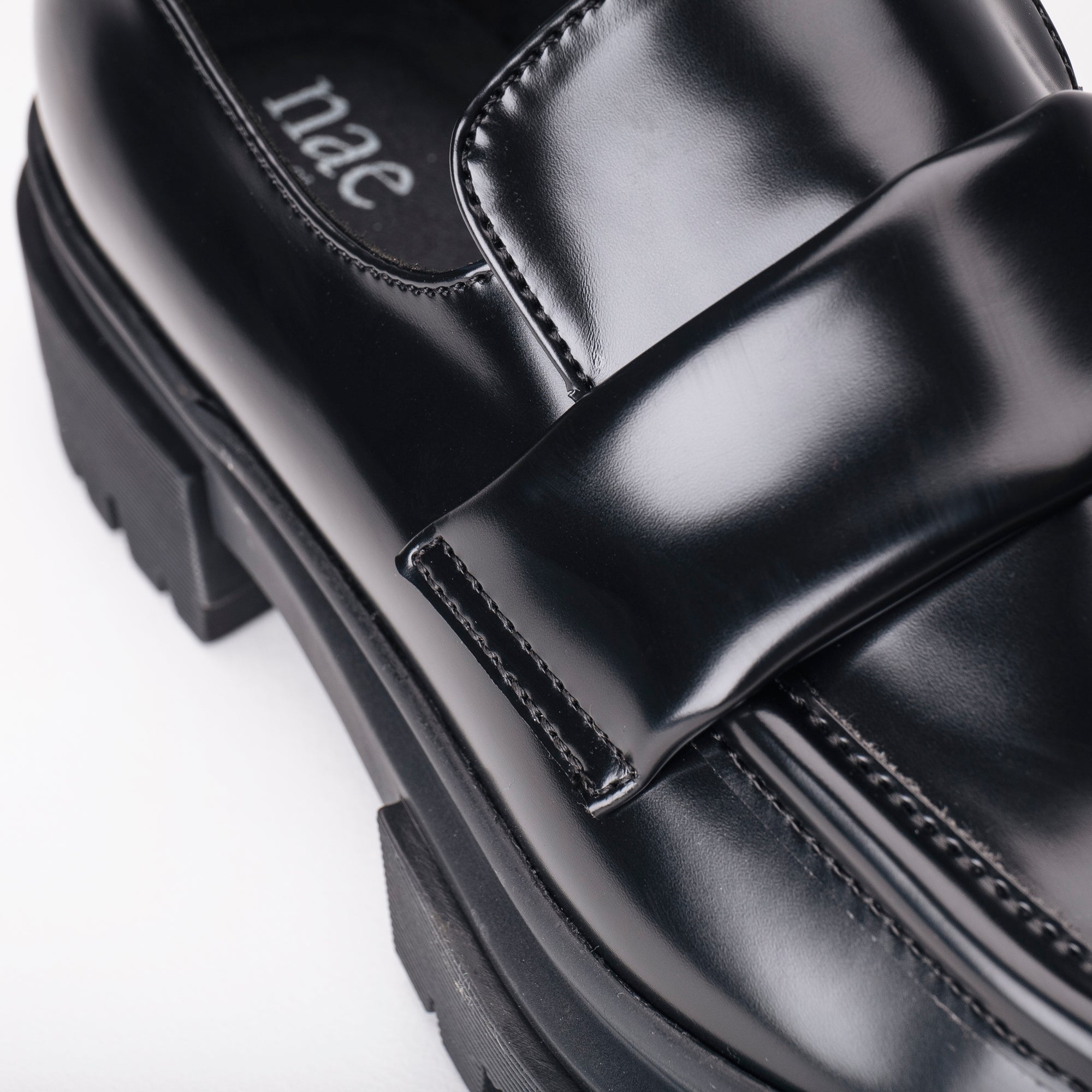 Shop online Esel Black, the vegan loafers with a decorative strap on the foot top made of high quality vegan leather: a sustainable, water resistant, light, durable and cruelty free material. A timeless style with a solid pattern and a well traced figure with a cheeky touch from the indented chunky soles that make for a modern and innovative model with a wonderful balance between flashy and sofisticated. They have a welt stitch around the shoes for a better resistance.
