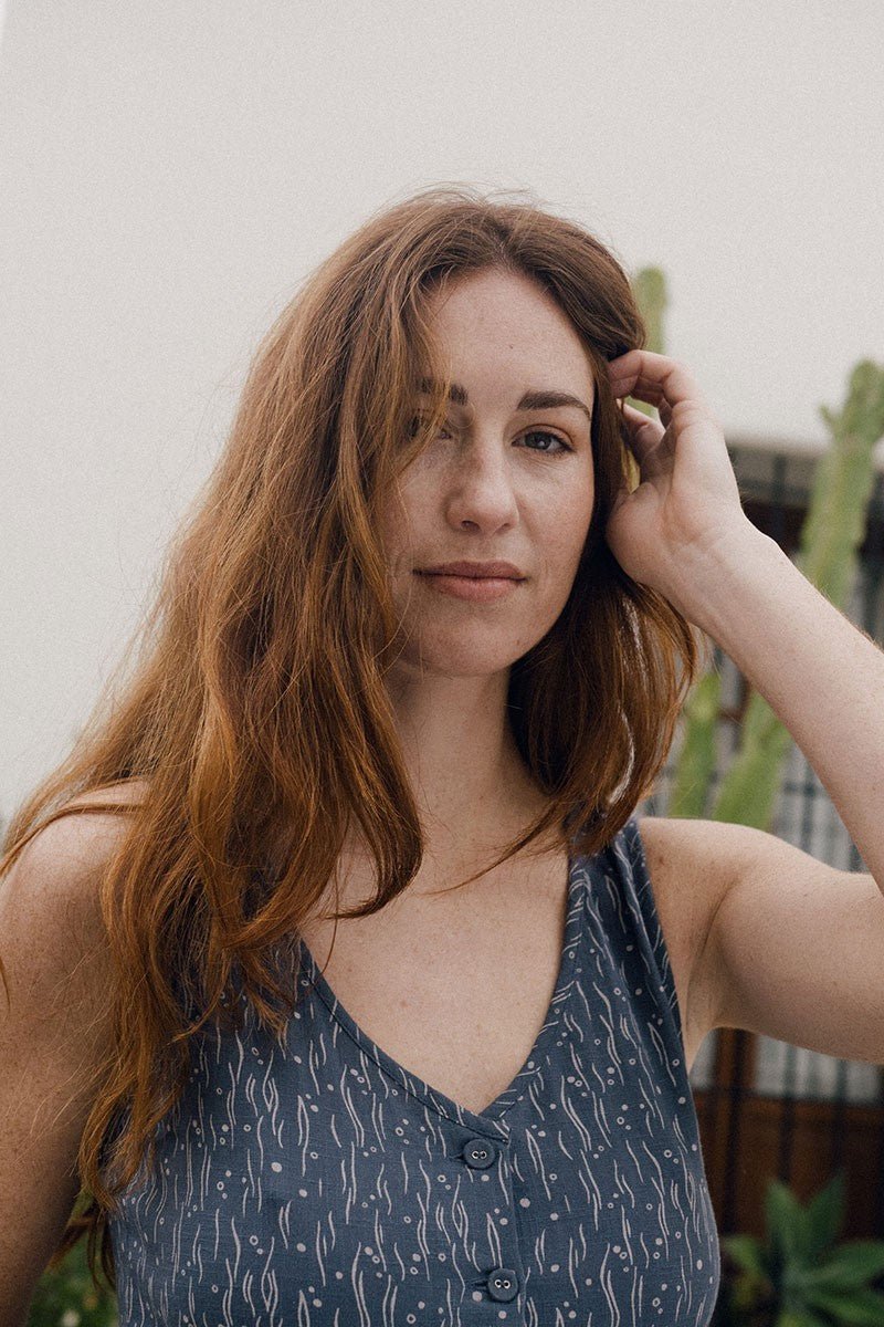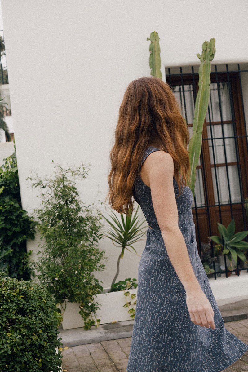 Eva is a midi length knit dress with straps. It has a front slit with functional buttons and a nice back neckline that adjusts with a bow. It has a flared skirt and practical pockets. A tight-fitting dress that stylizes the silhouette, very comfortable and elegant at the same time.The sea mist print in blue from the Aqua collection, inspired by one of the essential elements for life, gives that unique and special touch to the garment. It is made of a fabric with a texture evoking linen, it is cool and very pleasant to the touch.