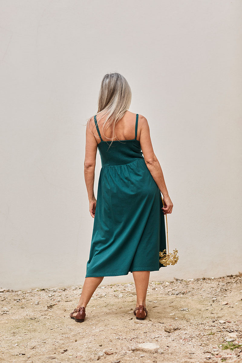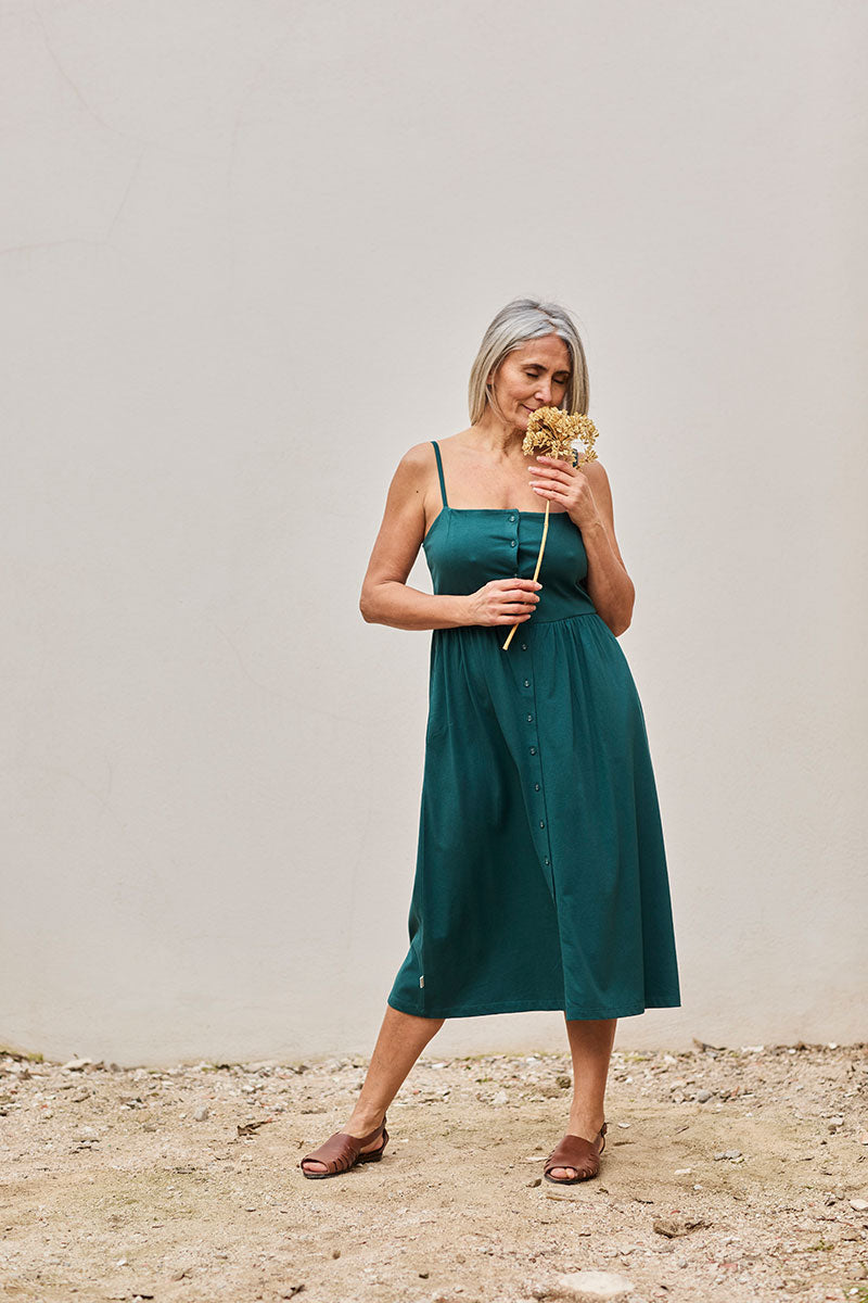 Fabia is an organic cotton knit dress with adjustable straps and smocking on the upper back. It is midi length, has a slit with functional buttons, and practical side pockets. A basic ORIGIN in teal that you won’t get tired of wearing. Additionally, it is made free of toxins and is hypoallergenic. SILHOUETTE/FIT: This model has a fitted silhouette. Sarah is 1.81m tall and wears size S.