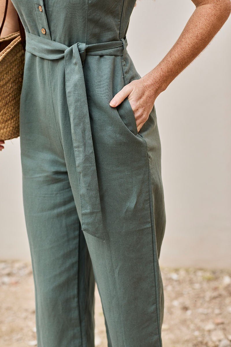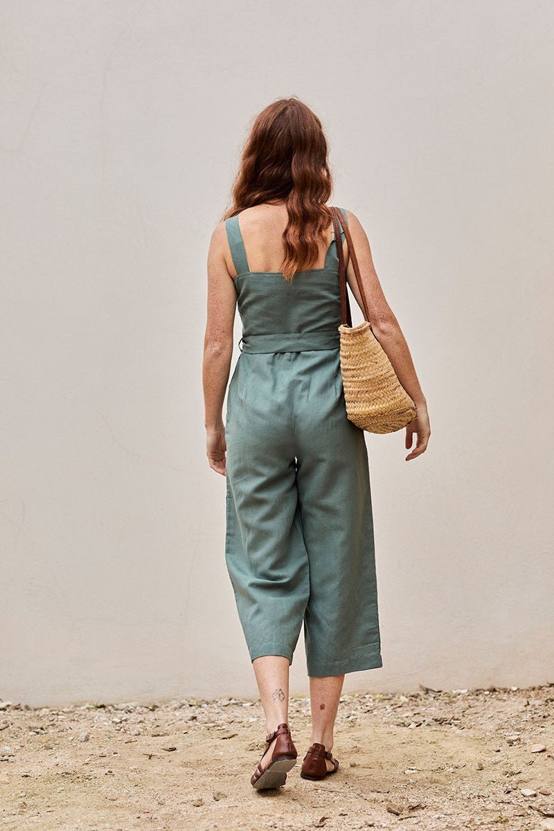 Fancy is a linen jumpsuit with long trousers and straps. It has a zip on the side and a slit with functional coconut buttons at the top. It comes with an additional drawstring belt to allow you to adjust it to your waist. This model has a semi-fitted silhouette and practical pockets on the sides. An ORIGIN basic in aquamarine blue. The linen fabric with which it is made is fresh and breathable, it also has antibacterial properties and protects the skin from ultraviolet rays. It is toxic free and hypoallergenic.
