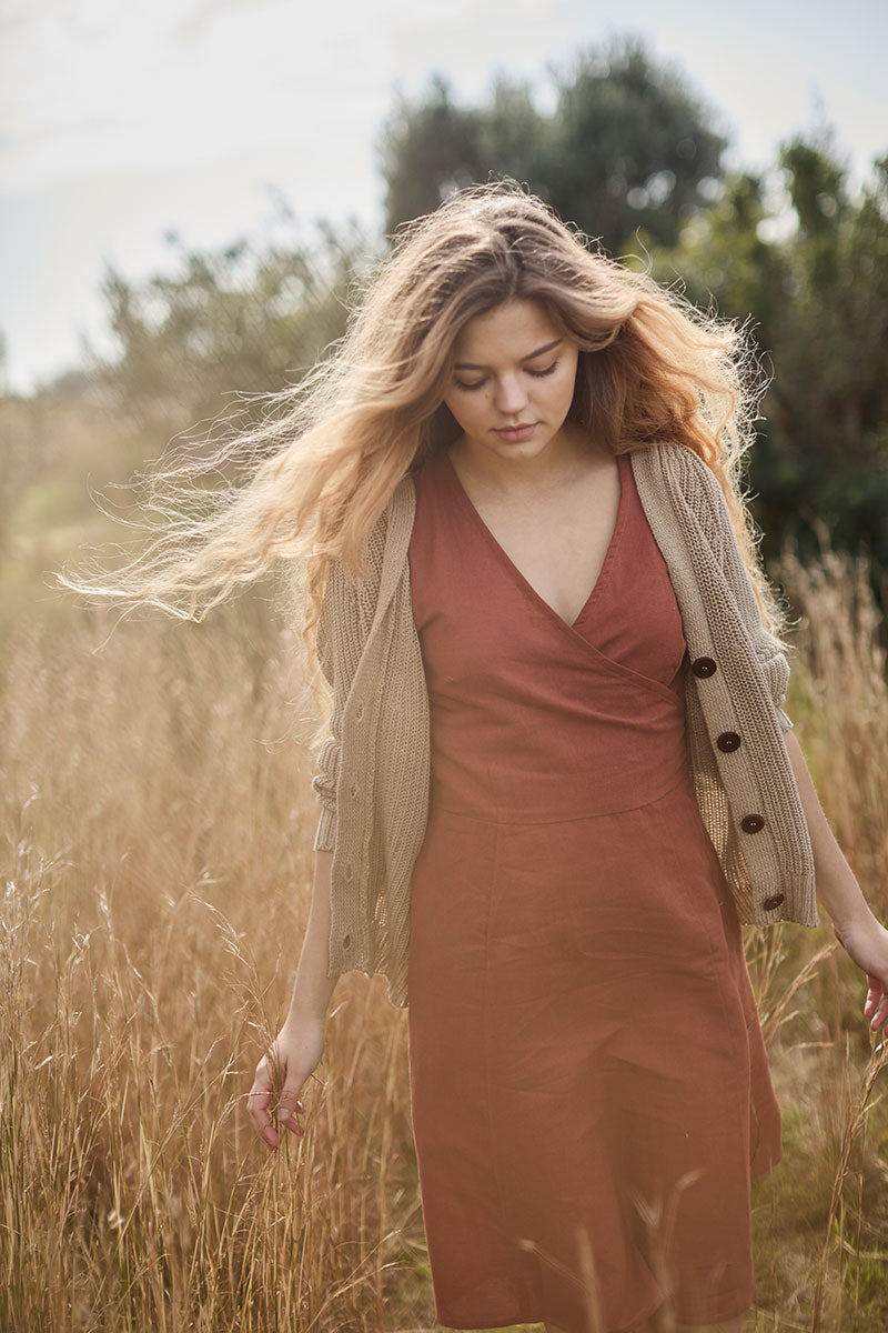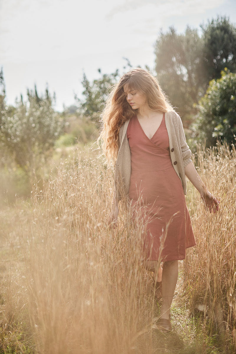 Febe is an empire-cut linen dress. It has straps and a slit with beautiful functional coconut buttons on the top. This model is comfortable and very practical since it is reversible. You can wear the buttons in the front or the back. Two garments in one! A basic ORIGIN in red rooibos color. The linen fabric with which it is made is fresh and breathable, and it also has antibacterial properties and protects the skin from ultraviolet rays. It is free of toxins and is hypoallergenic. SILHOUETTE/FIT: This model has a loose-fitting silhouette.