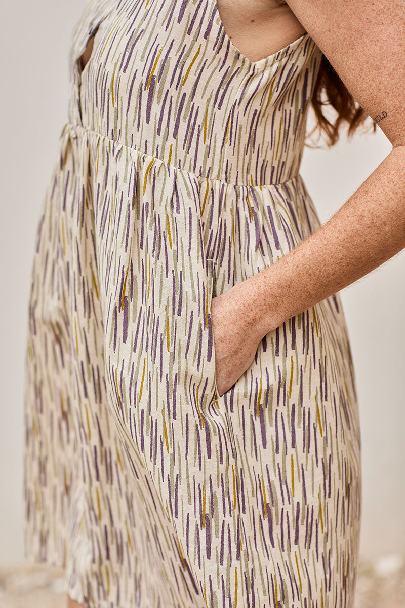 Febe is an empire-cut linen dress. It has straps and a slit with beautiful functional coconut buttons on the top. This model is comfortable and very practical since it is reversible. You can wear the buttons in the front or the back. Two garments in one! The beige jungle print, from the Kudumbam collection, which means family in Hindi, inspired by the fundamental motive that drives us at Tiralahilacha, gives this garment a unique and special touch. The linen fabric with which it is made is fresh and breathable, and it also has antibacterial properties and protects the skin from ultraviolet rays. It is made free of toxins and is hypoallergenic. SILHOUETTE/FIT: This model has a loose-fitting silhouette.