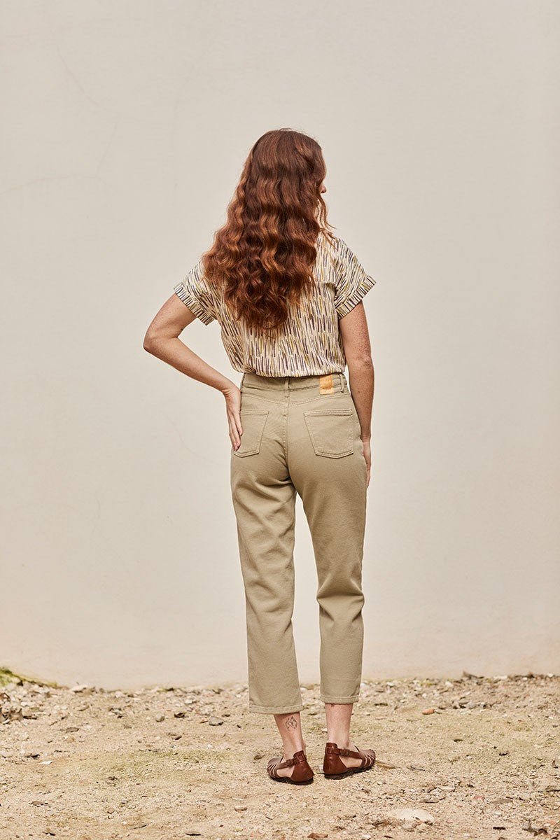 Finna is a pair of cotton twill trousers. It has a straight cut and a high waist with pockets on the sides and back. These sustainable jeans are a totally versatile piece. The momfit style silhouette is timeless and flattering – the classic jeans for a lifetime! Its dry green colour can be combined with an infinite number of garments. These limited edition trousers are produced locally, very close to home, using local cotton. Moreover, they are made using renewable energies from nut shells, and low-impact and water-saving finishing methods. Km 0 production made in Spain.