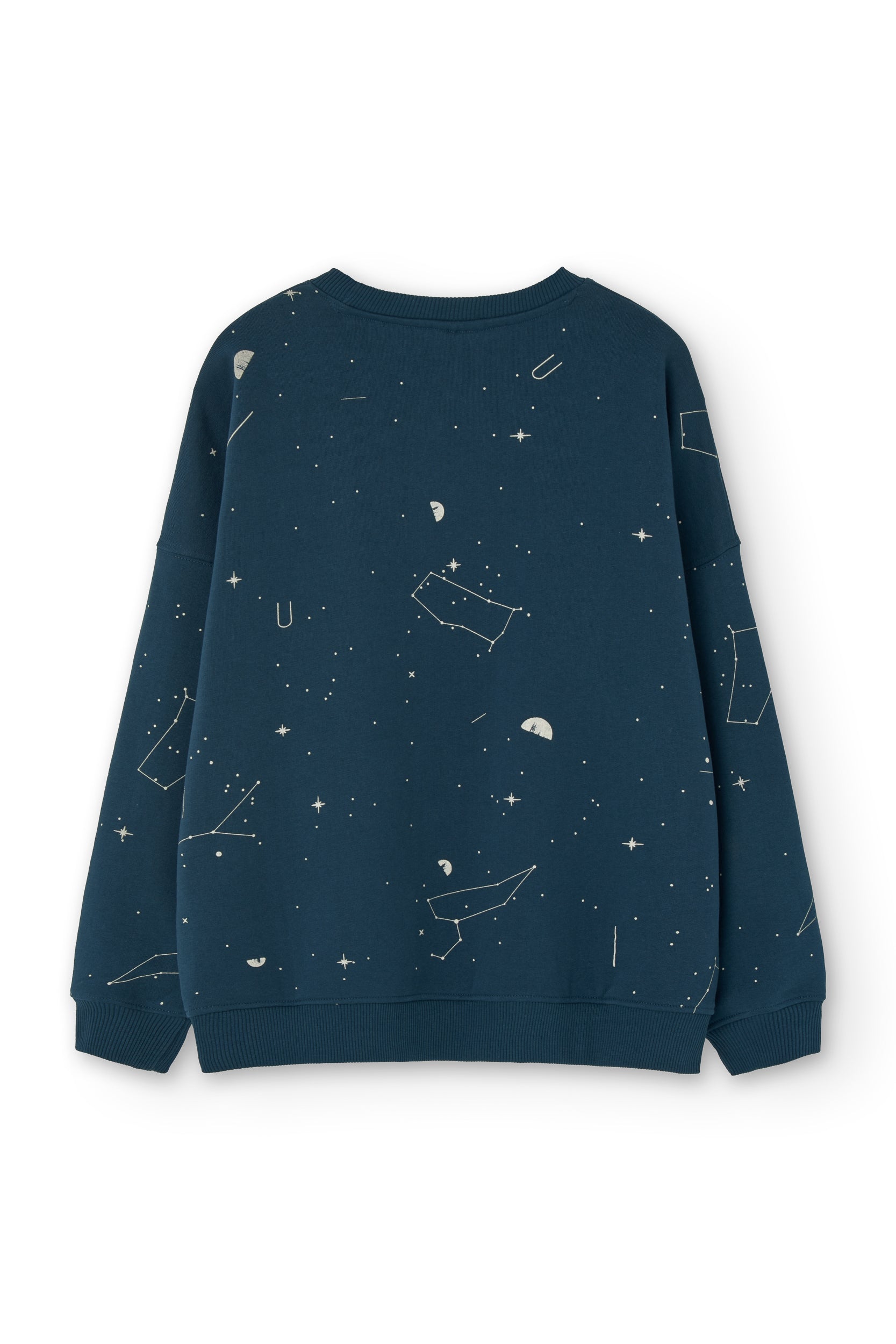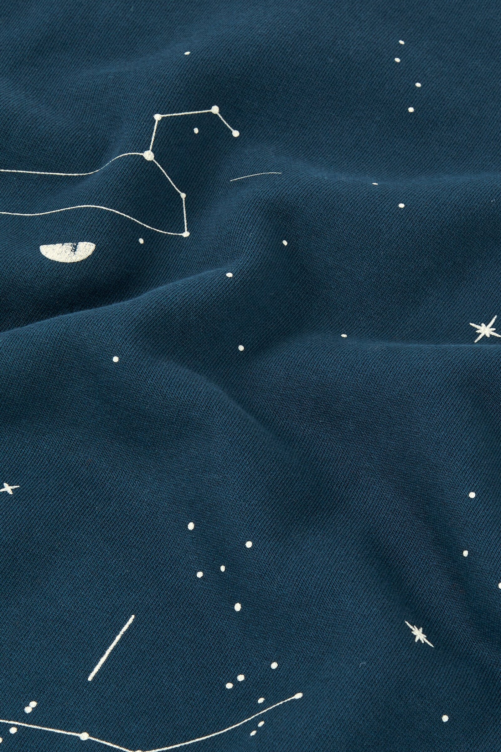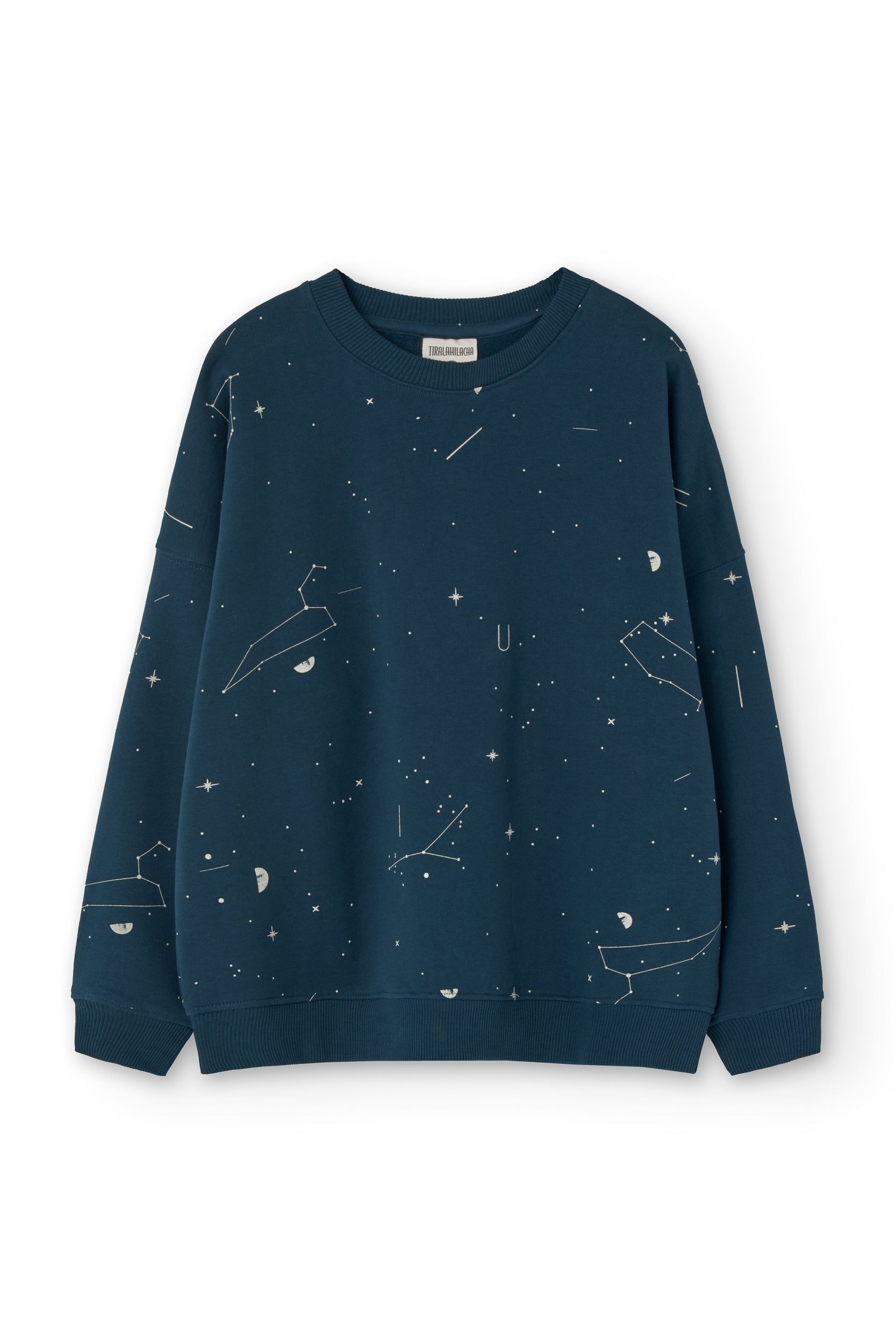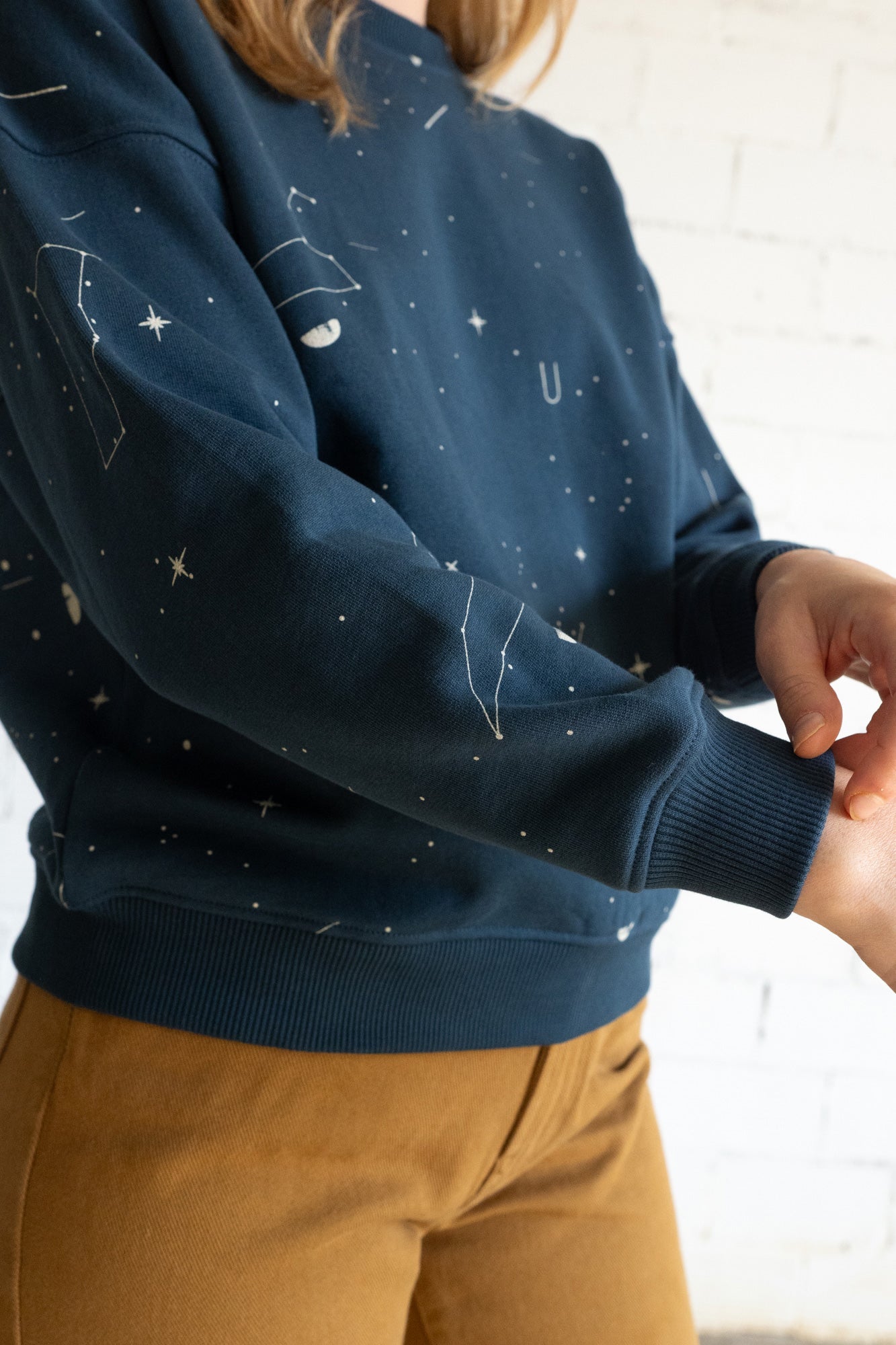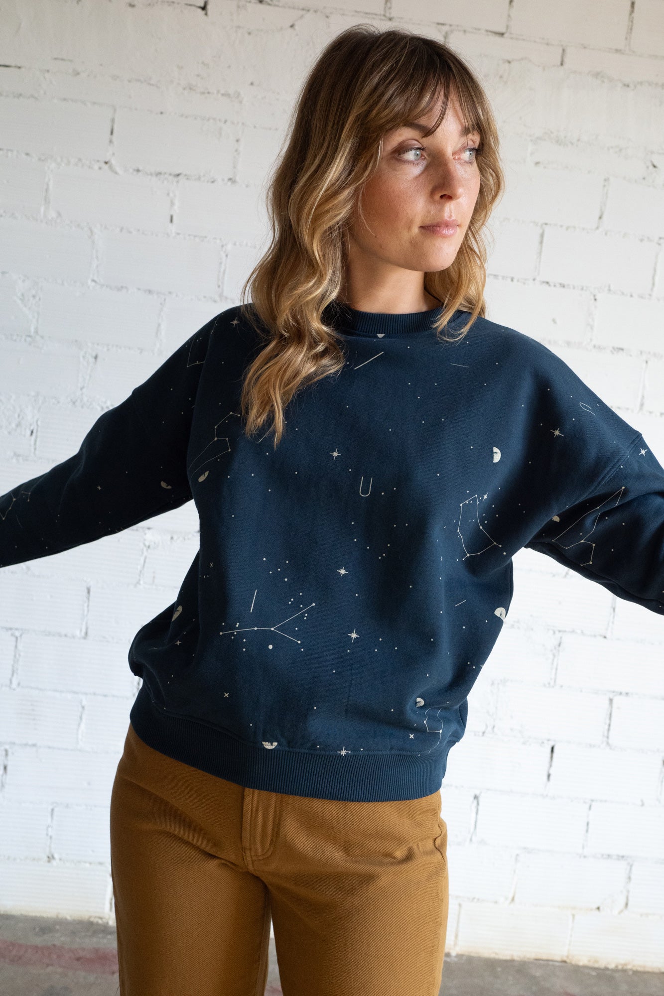 Gabriela is an organic cotton brushed sweatshirt with long sleeves. It is a relax, casual and comfy style. It has dropped shoulders and a round neckline with ribbed trim. A very cosy and warm garment for cold days that matches perfectly with the new Gueda Denim trousers. The midnight blue constellation print, from the AURA collection, conveys strength and light and gives a special and exclusive touch to the garment. This garment feels very soft and pleasant against the skin. All our garments are made free of toxins and are hypoallergenic.
