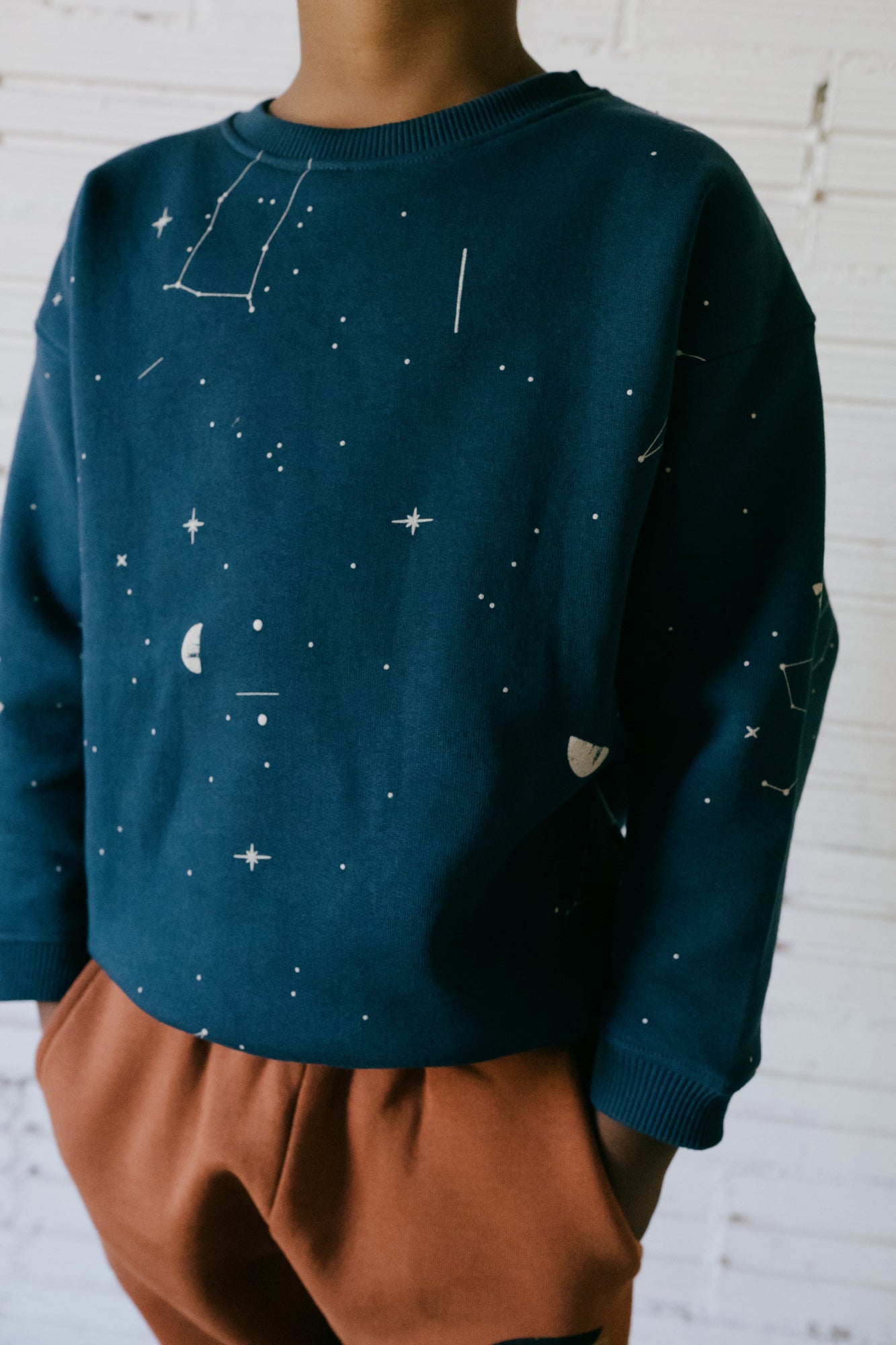 Gaby is a very soft and warm fleece sweatshirt with drop sleeves. This model has an oversized silhouette so your little one can enjoy it over time. Perfect for the mid-season months and ideal combined with Galatea leggings or Galina pant. Undoubtedly, a very comfortable garment that your little one won’t stop wearing. The midnight blue constellation print, from the AURA collection, conveys strength and light and gives a special and exclusive touch to the garment. All our garments are made free of toxins and are hypoallergenic for the soft and delicate skin of your little ones.