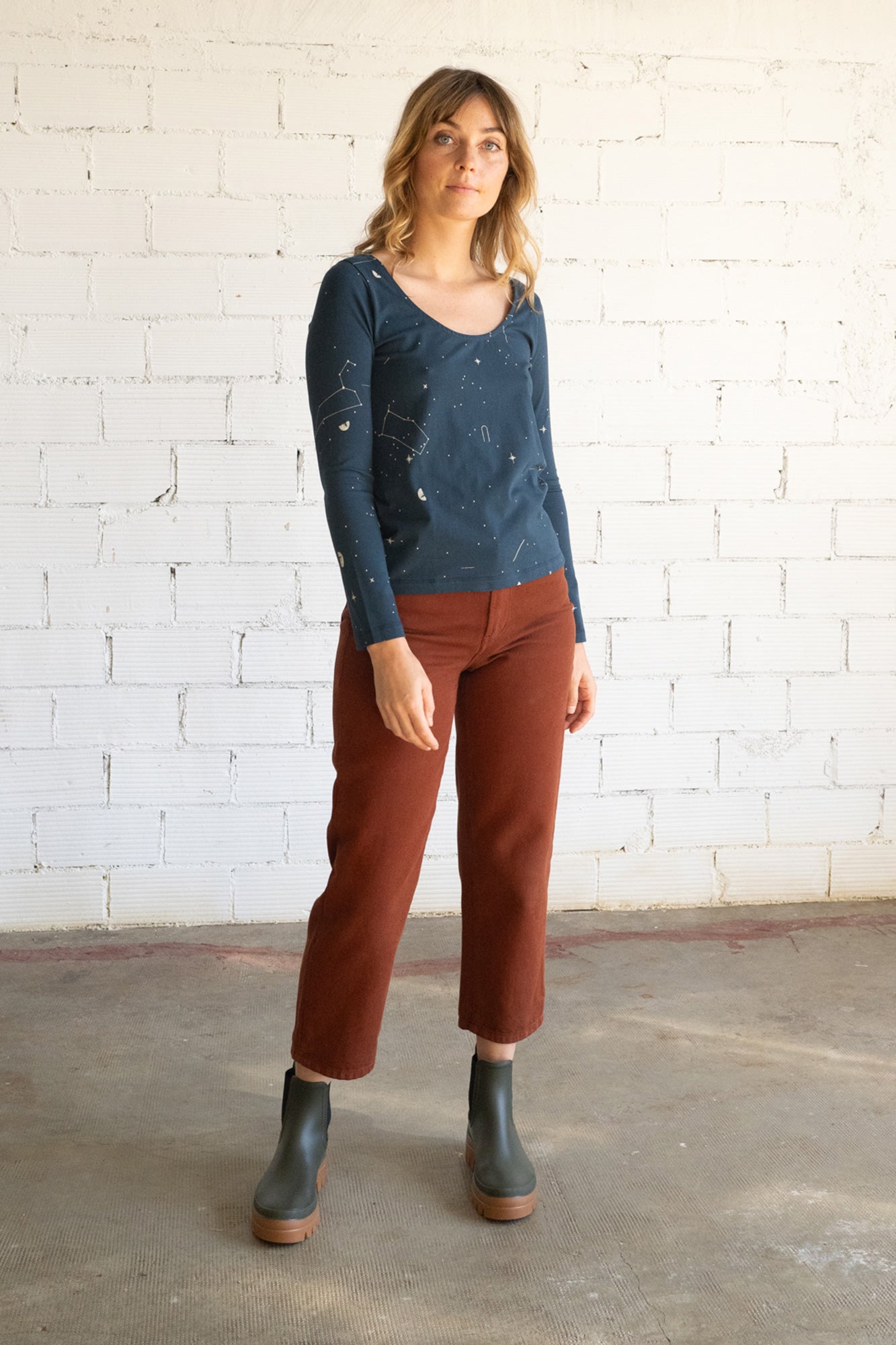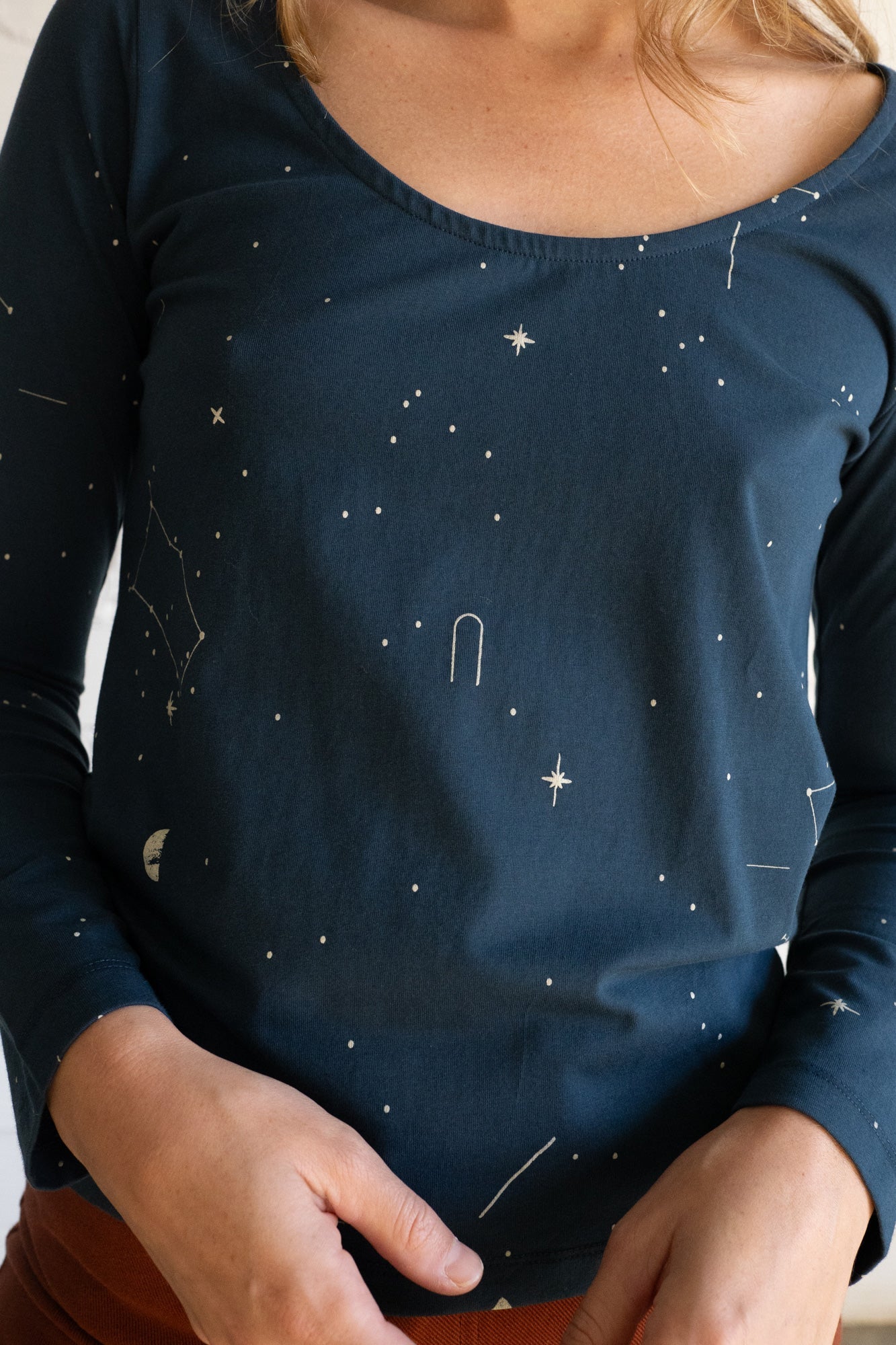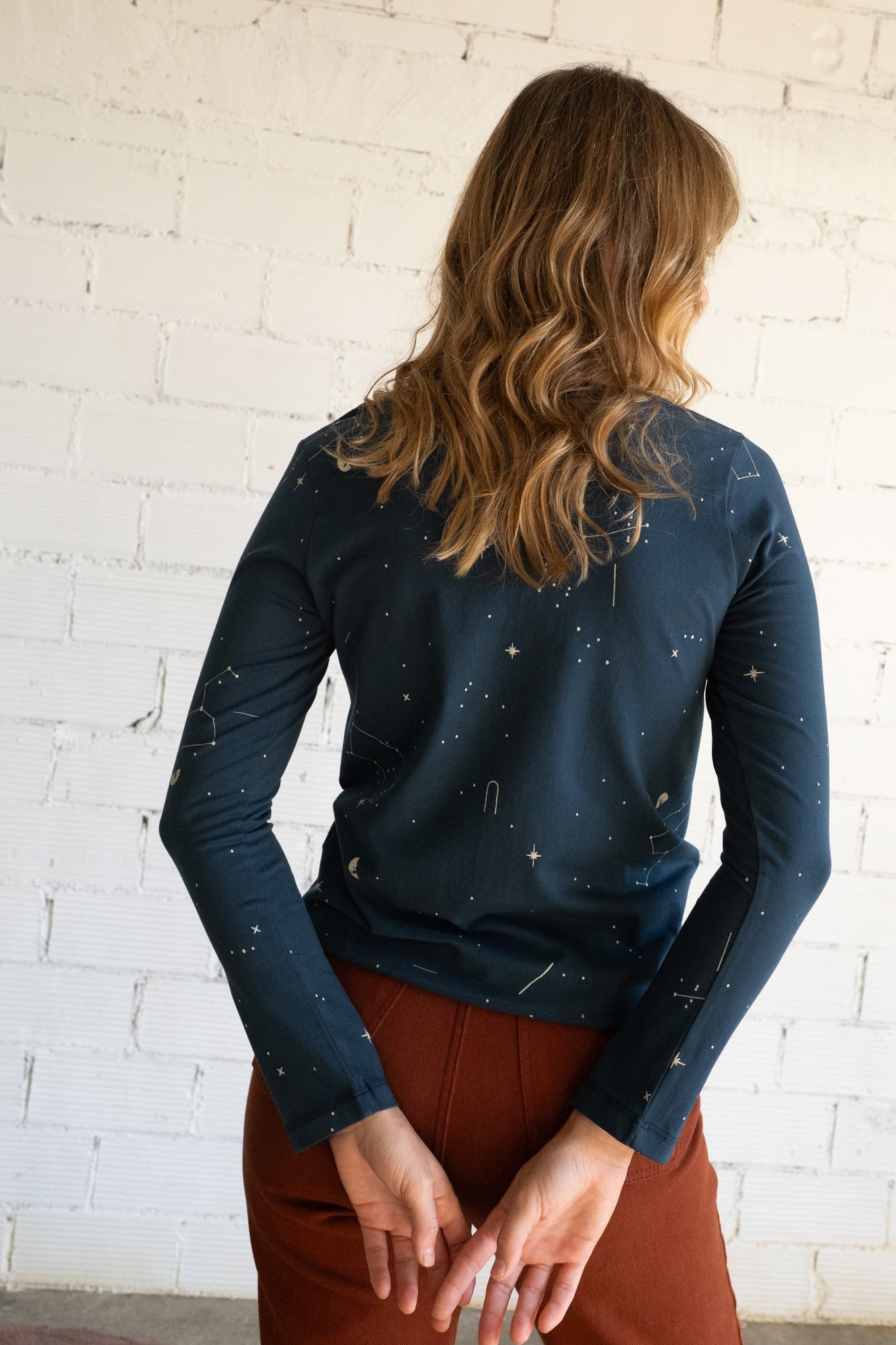 Gaia is a long-sleeved knitted T-shirt with a basic cut and round neckline. A comfortable and versatile garment that you can wear with an infinite number of combinations. Fantastic with the GLORIA trousers in beige. Definitely a very original basic for your sustainable wardrobe! The midnight blue constellation print from the AURA collection transmits strength and light and gives a special and exclusive touch to the garment. This garment has a very soft and pleasant touch on the skin. All our garments are made free of toxins and are hypoallergenic.