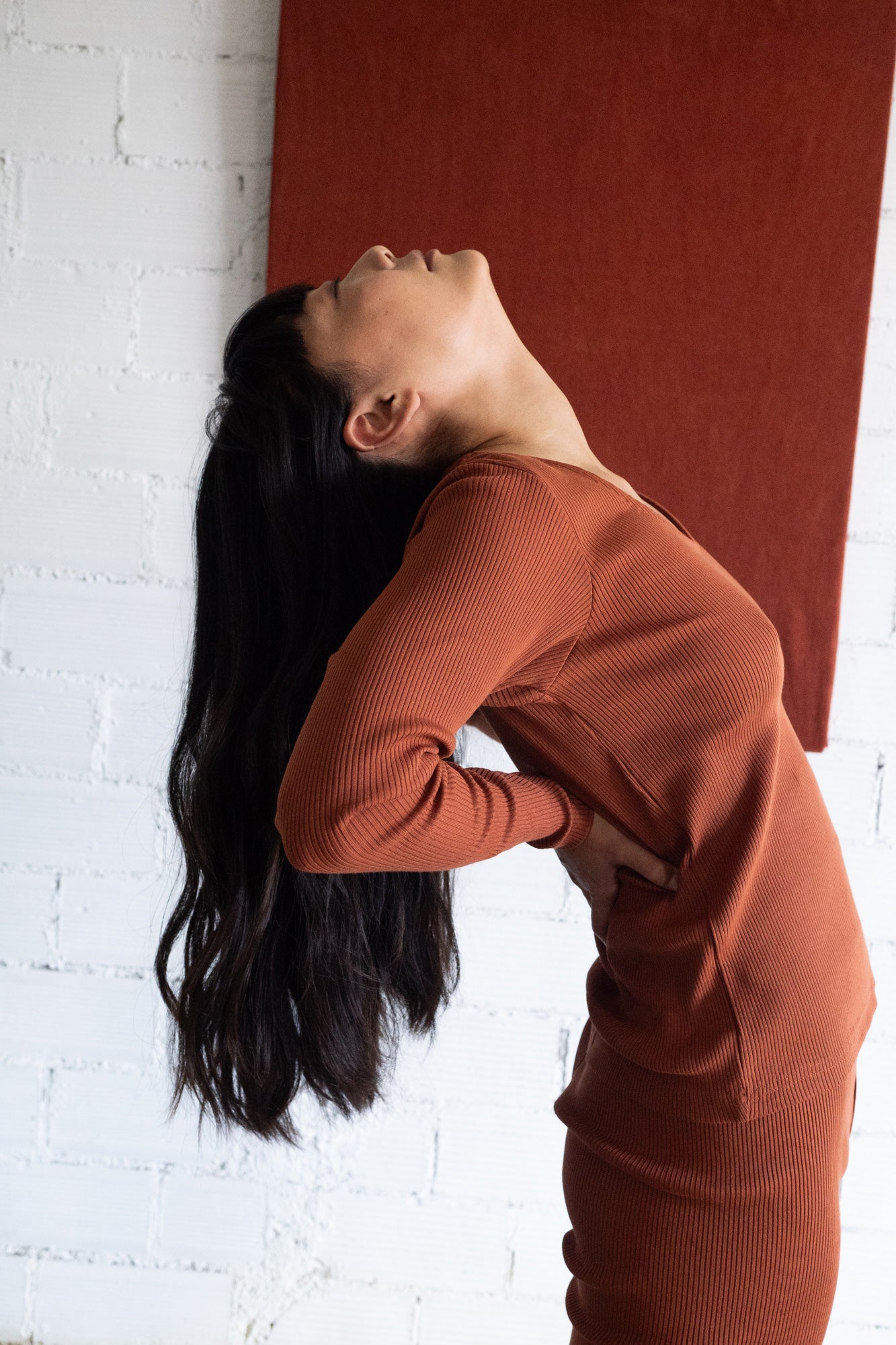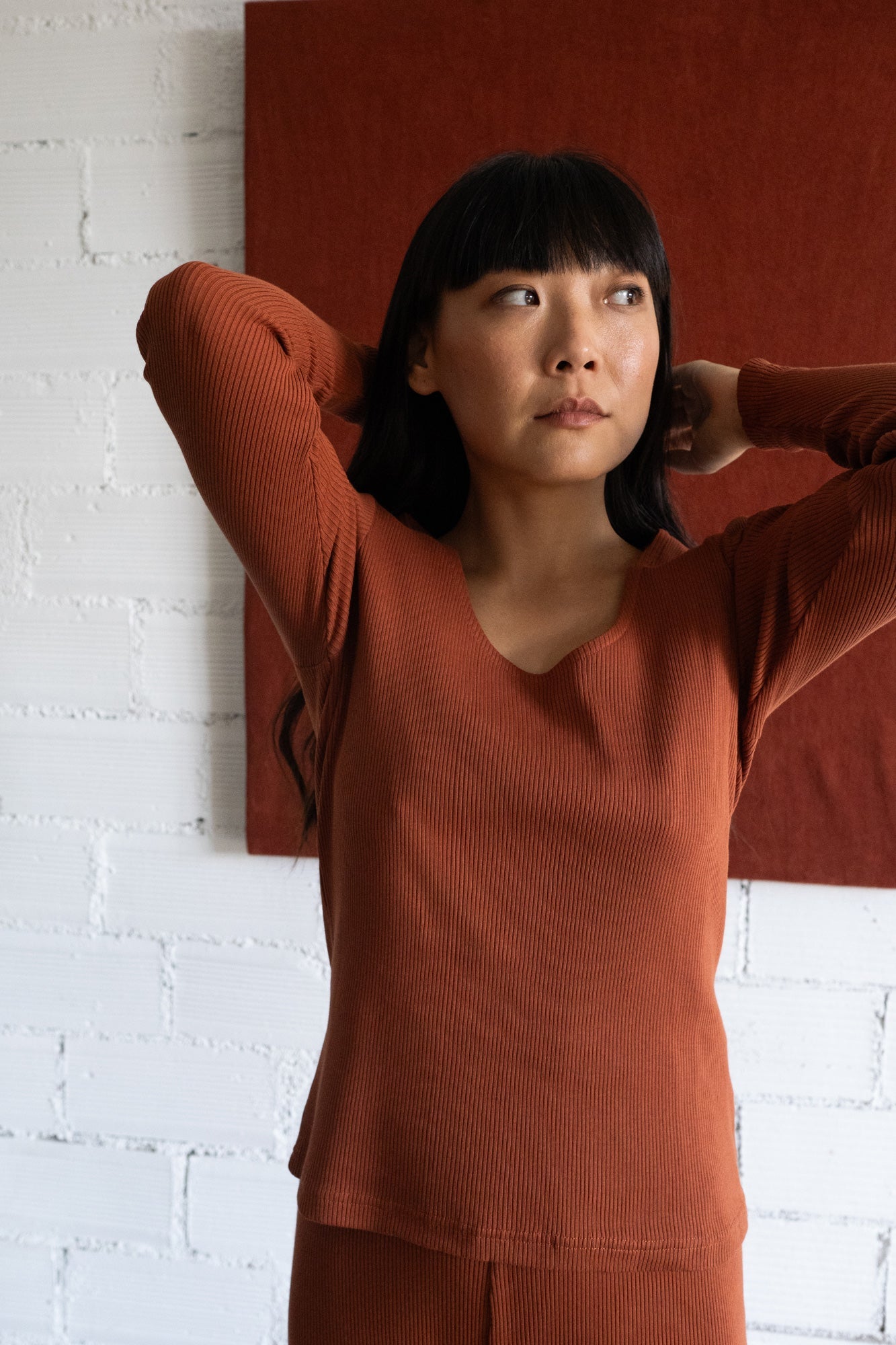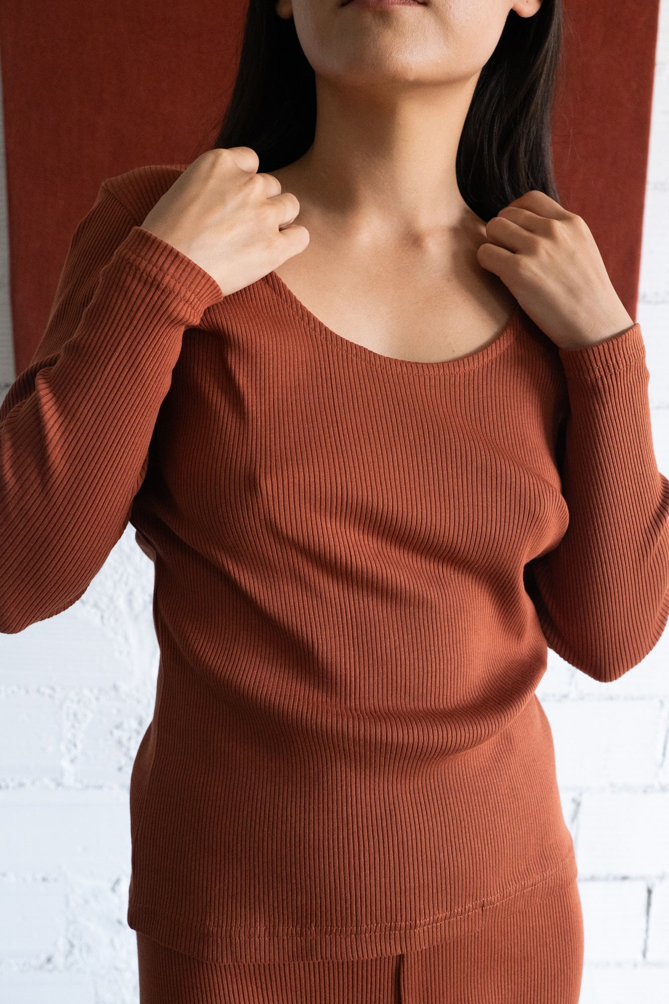 Gaia is a long-sleeved ribbed knit T-shirt with a basic cut and round neckline. A comfortable and versatile garment that you can wear with an infinite number of combinations. Fantastic with the Gloria trousers in beige. Definitely a very original basic for your sustainable wardrobe! Its Origin Mars red colour, from the AURA collection, conveys strength and light and gives a special and exclusive touch to the garment. This garment has a very soft and pleasant touch on the skin. All our garments are made free of toxins and are hypoallergenic.