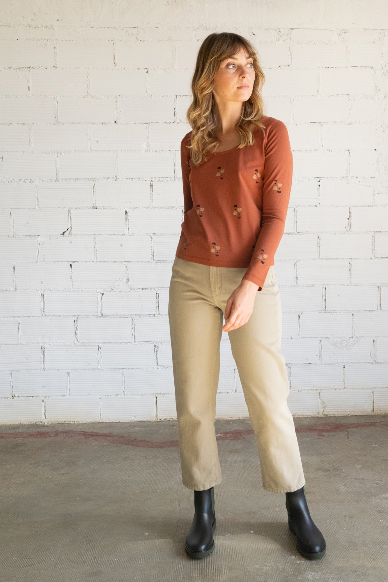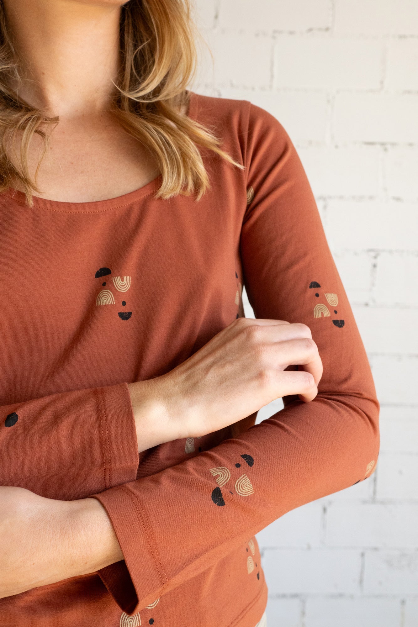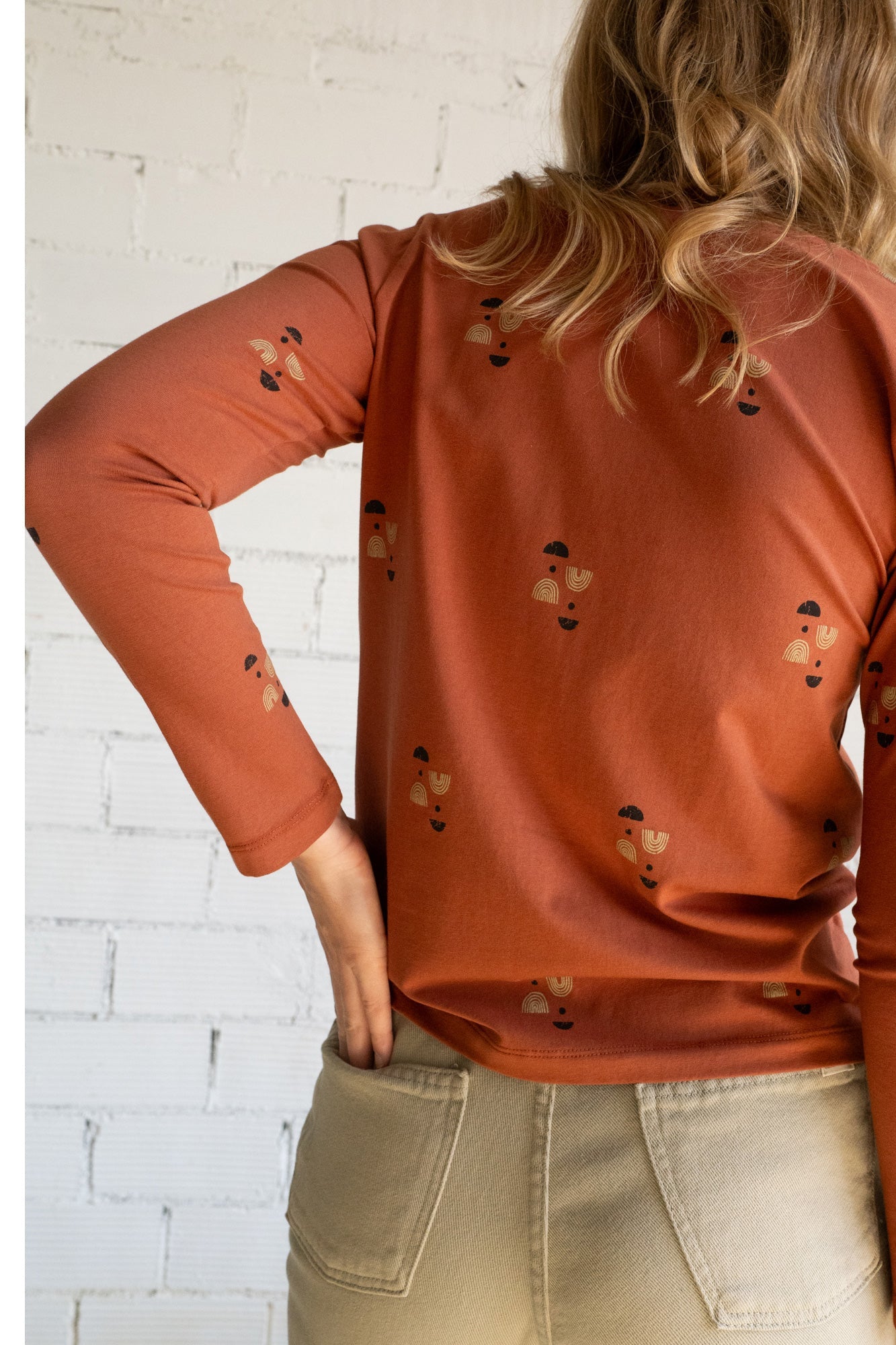 Gaia is a long-sleeved knitted T-shirt with a basic cut and round neckline. A comfortable and versatile garment that you can wear with an infinite number of combinations. Fantastic with the GLORIA trousers in beige. Definitely a very original basic for your sustainable wardrobe! The twilight print in Mars red from the AURA collection transmits strength and light and gives a special and exclusive touch to the garment. This garment has a very soft and pleasant touch on the skin. All our garments are made free of toxins and are hypoallergenic.