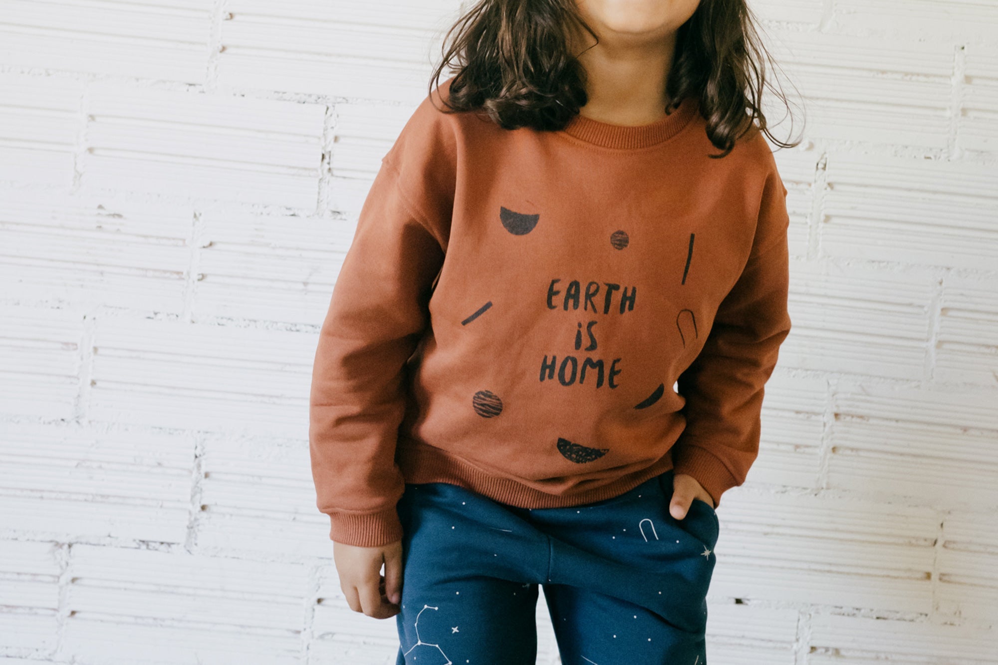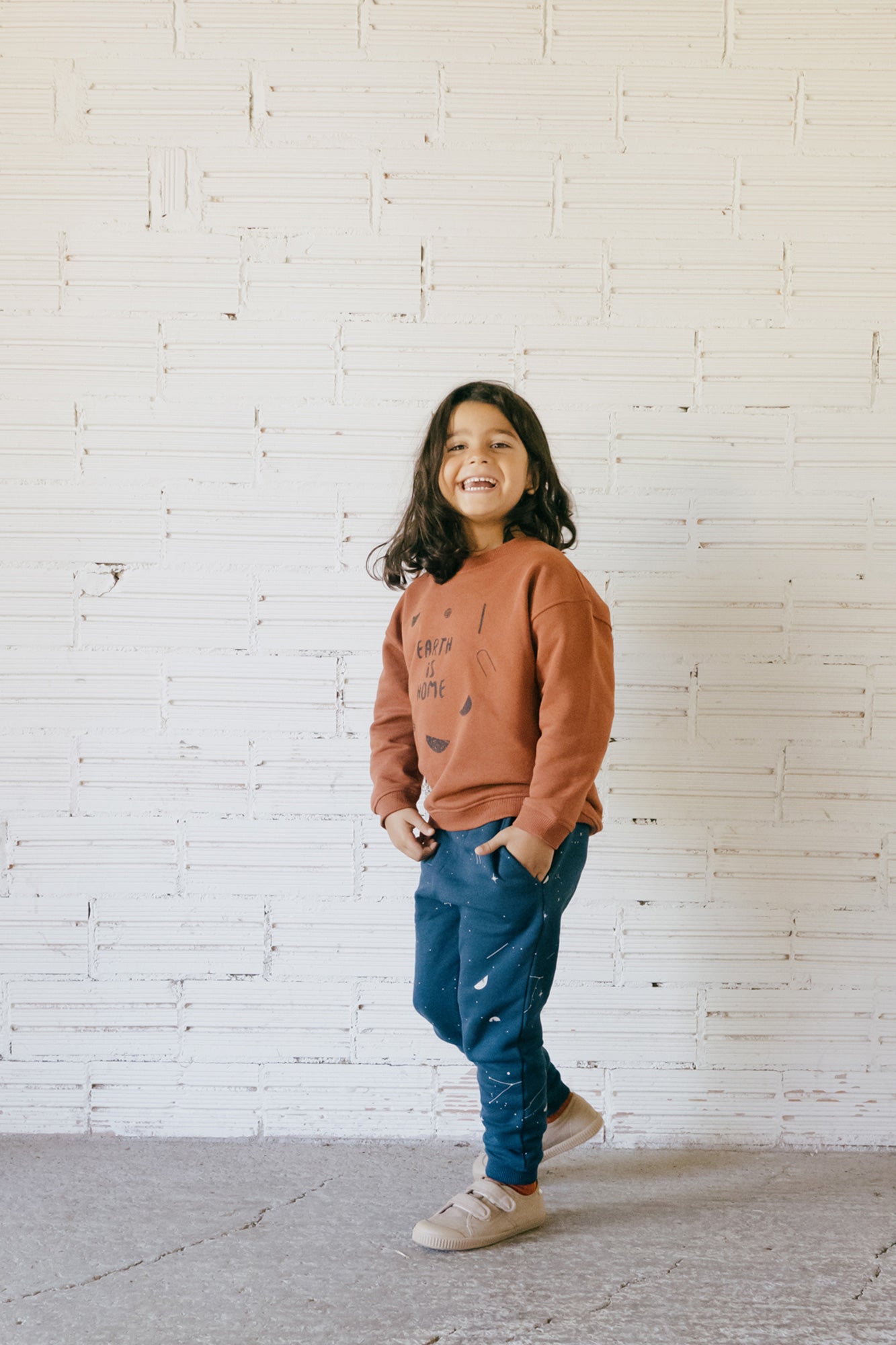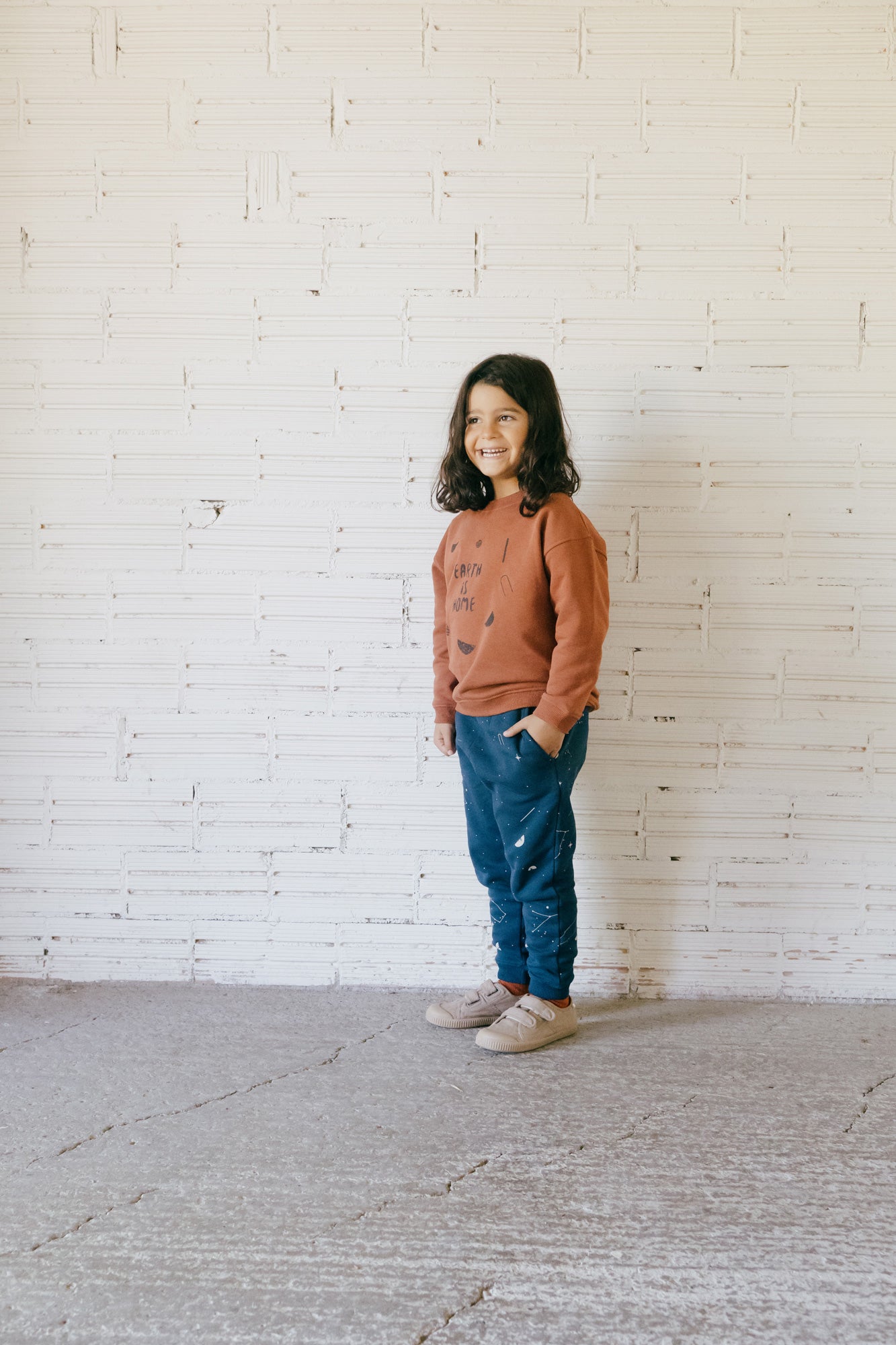 Galina is a very warm fleece long pant with pockets on the sides and elastic at the waist for a better fit. It is a very comfortable and versatile loose-fitting garment. You can combine it with the Gayle T-shirt or the Guna sweatshirt to get the complete tracksuit. The midnight blue constellation print, from the AURA collection, conveys strength and light and gives a special and exclusive touch to the garment. All our garments are made free of toxins and are hypoallergenic for the soft and delicate skin of your little ones.