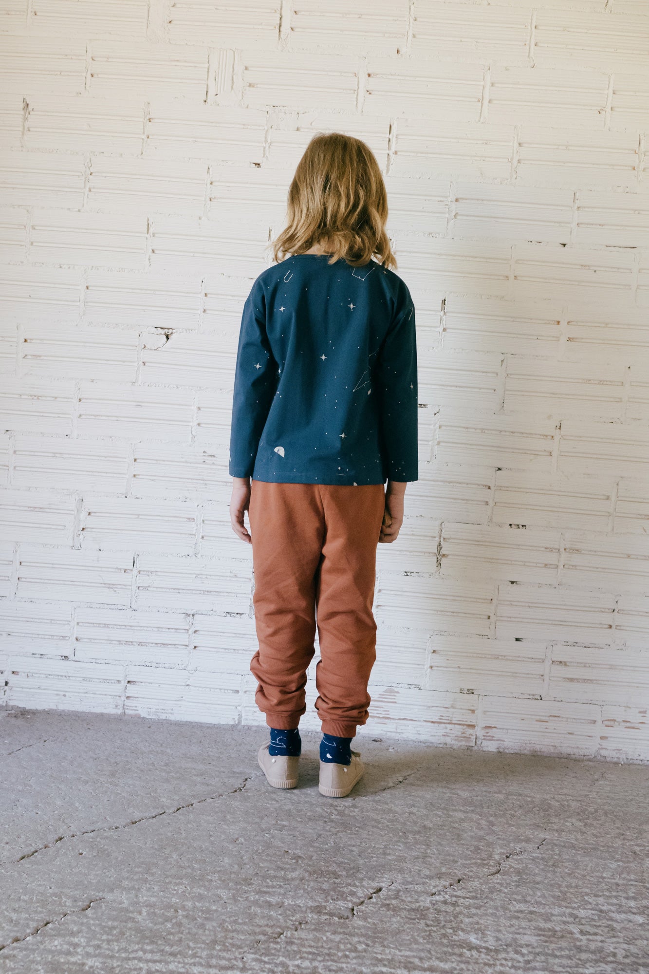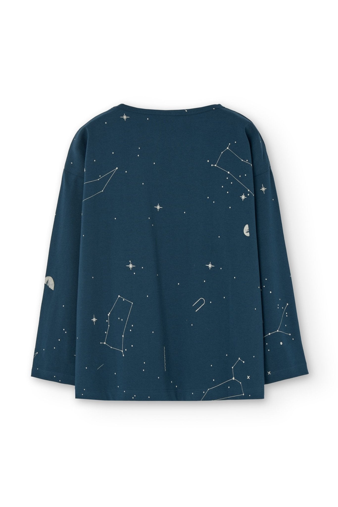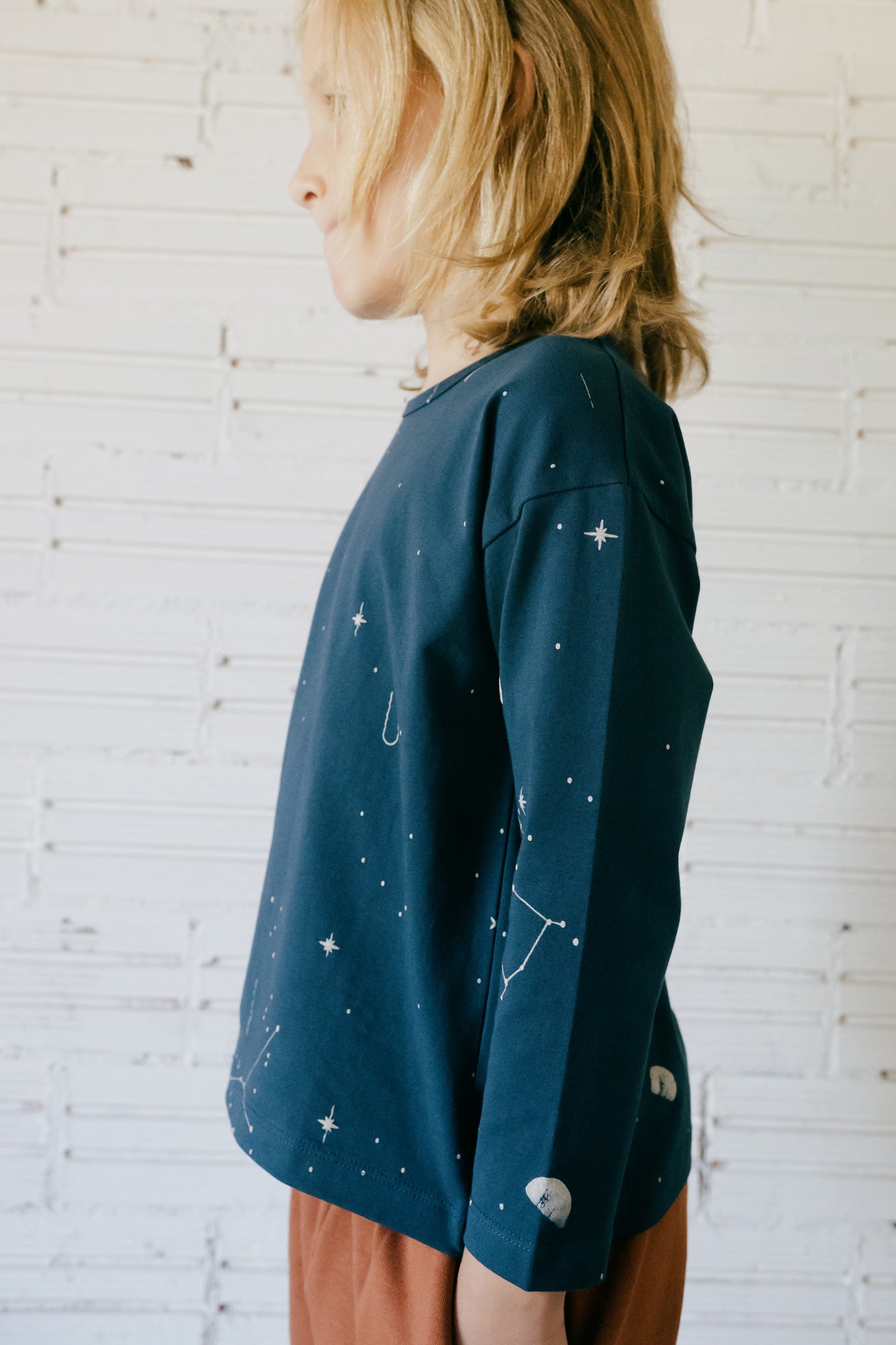 Gayle is an oversized T-shirt in organic cotton fabric with drop shoulder and long sleeves. This model has a loose-fitting silhouette to allow your little one to wear it for longer. The midnight blue constellation print, from the AURA collection, conveys strength and light and gives a special and exclusive touch to the garment. This T-shirt feels very soft and pleasant against the skin. All our garments are toxic-free and hypoallergenic.