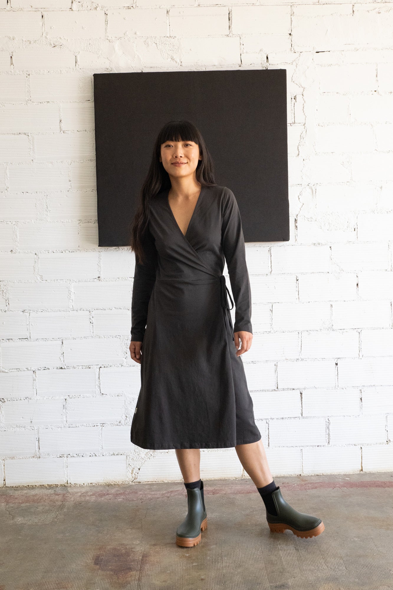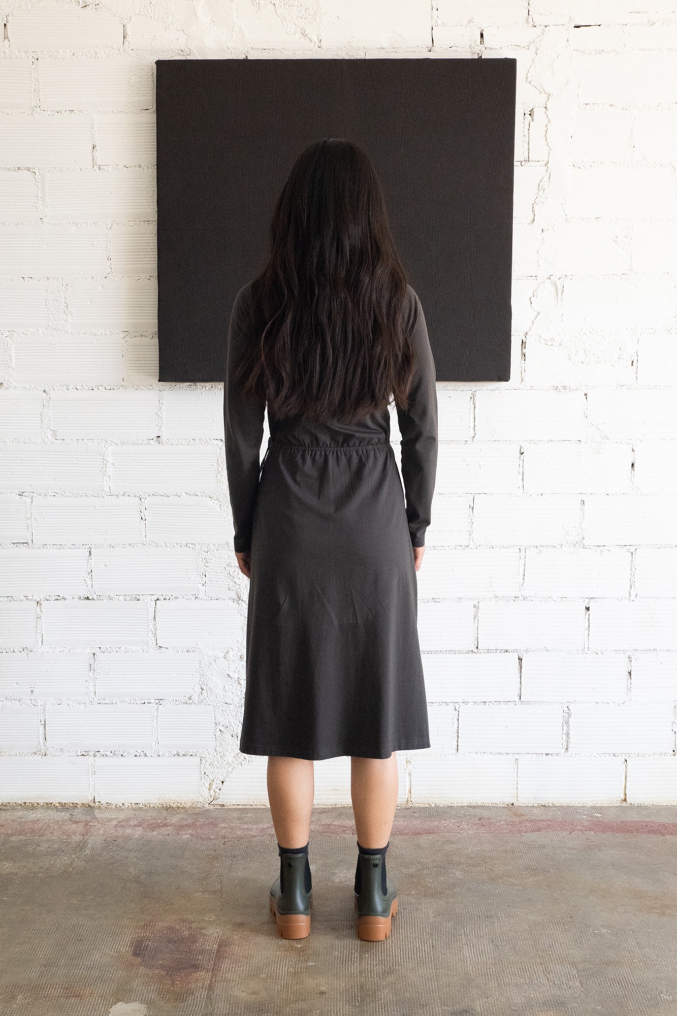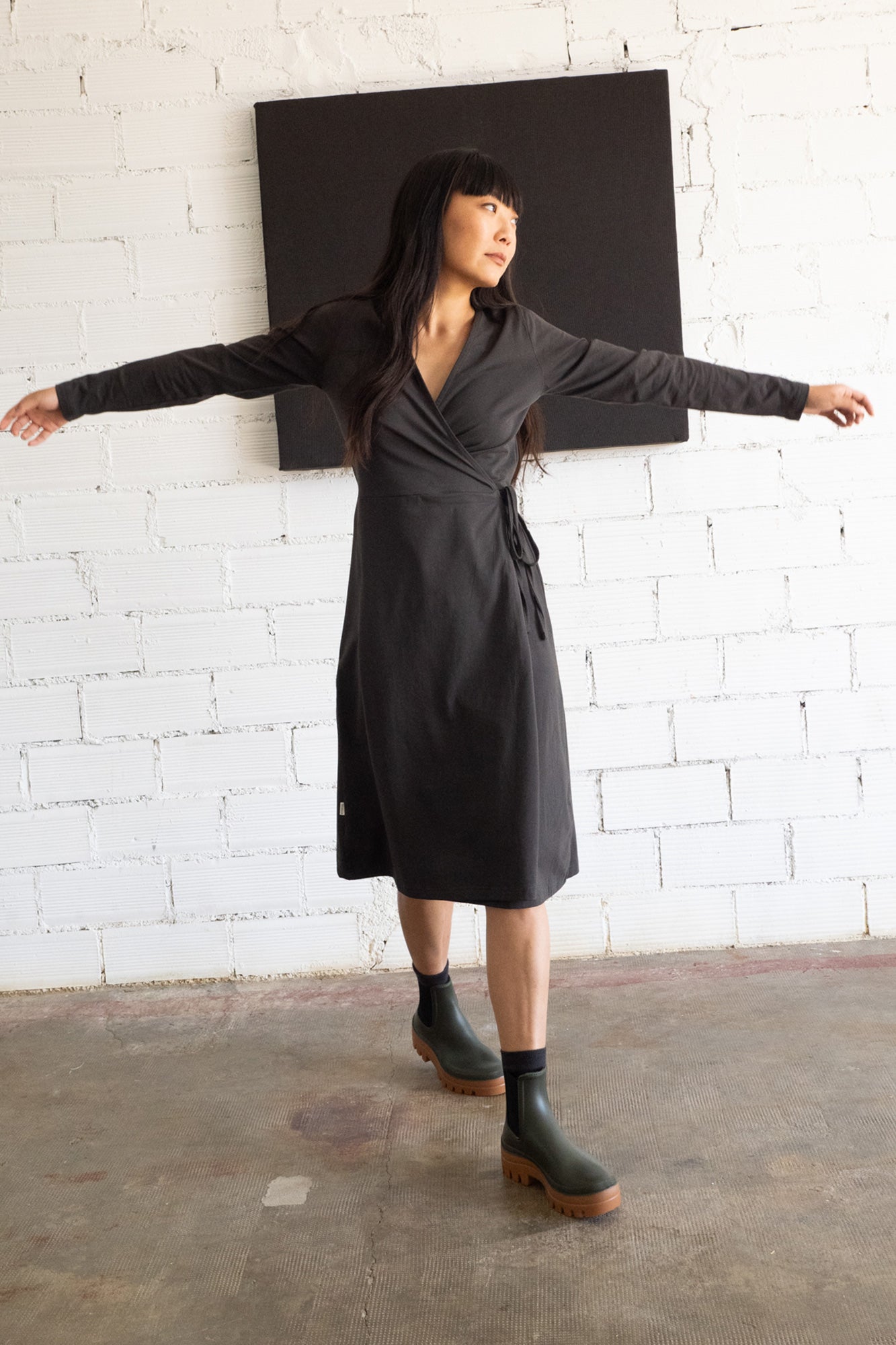 Gemma is a crossover long-sleeved dress in organic cotton jersey. Its tailored cut enhances any silhouette and adds a touch of femininity. You can adjust it to your waist size thanks to a loop on the inside and a belt. Certainly a timeless, versatile and very comfortable garment that you will wear on any occasion! Combine your look with the Gonda pocket jacket in ethereal beige. The eclipse black Origin color, from the AURA collection, conveys strength and light and gives a special and elegant touch to the garment. This garment has a very soft and pleasant feel on the skin. All our garments are toxic-free and hypoallergenic.