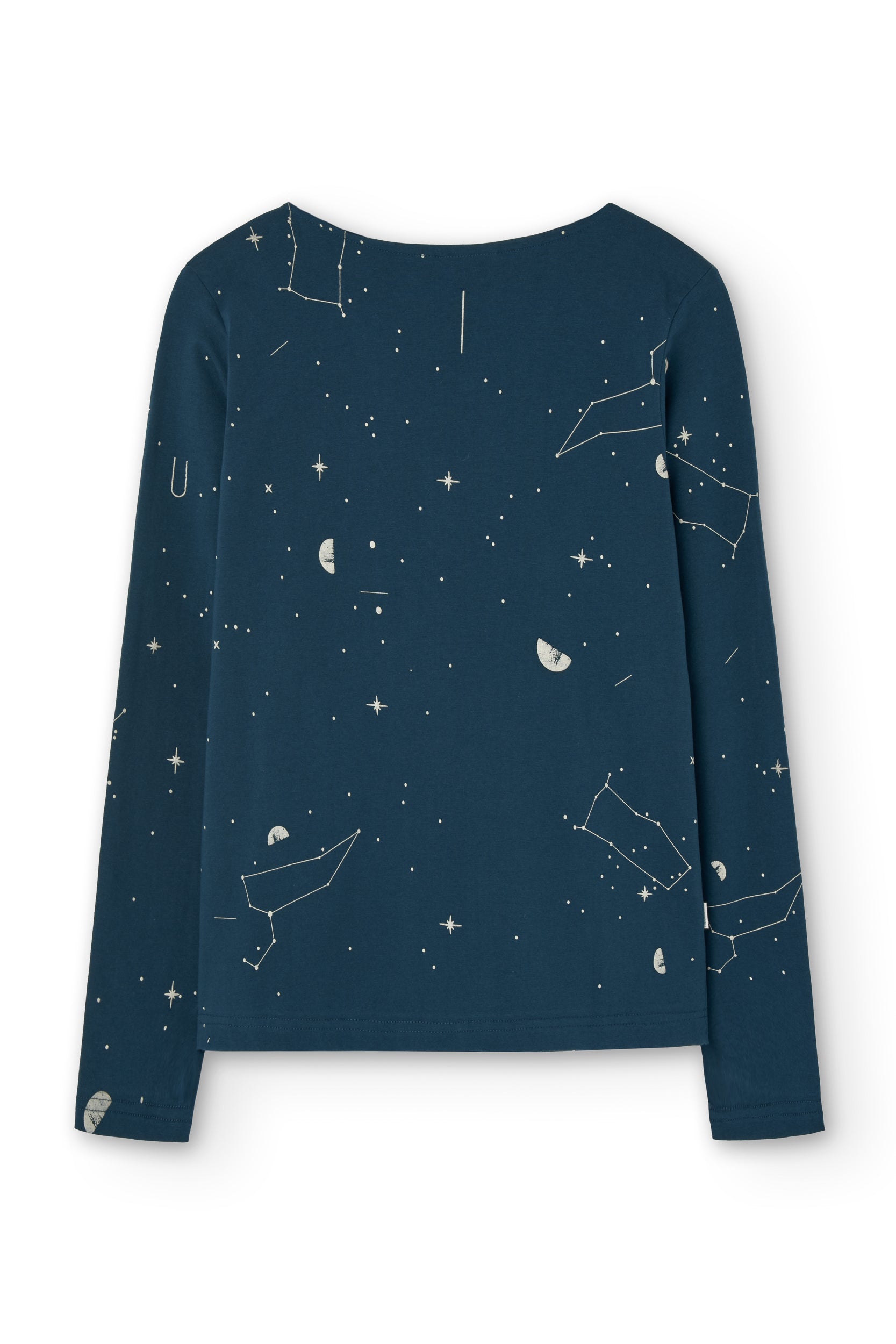 Gina is a crossover top with long sleeves in organic cotton fabric. Very feminine and flattering with a lacing on the inside so you can adjust it to your size according to your preference. A timeless basic that you’ll want to own in a variety of colours. Get the perfect look by combining it with the new Gueda Denim trousers. The midnight blue constellation print, from the AURA collection, conveys strength and light and gives a special and exclusive touch to the garment. This garment has a very soft and pleasant touch on the skin. All our garments are made free of toxins and are hypoallergenic.
