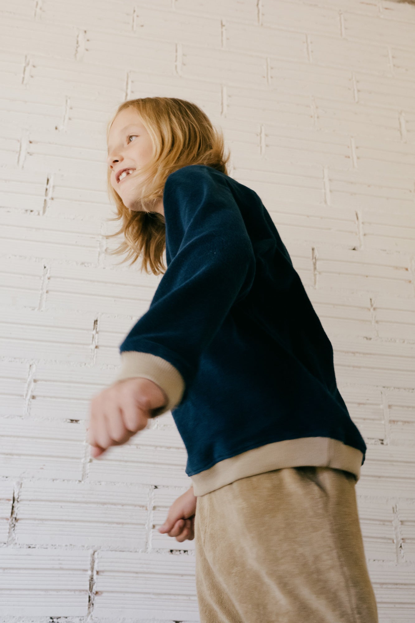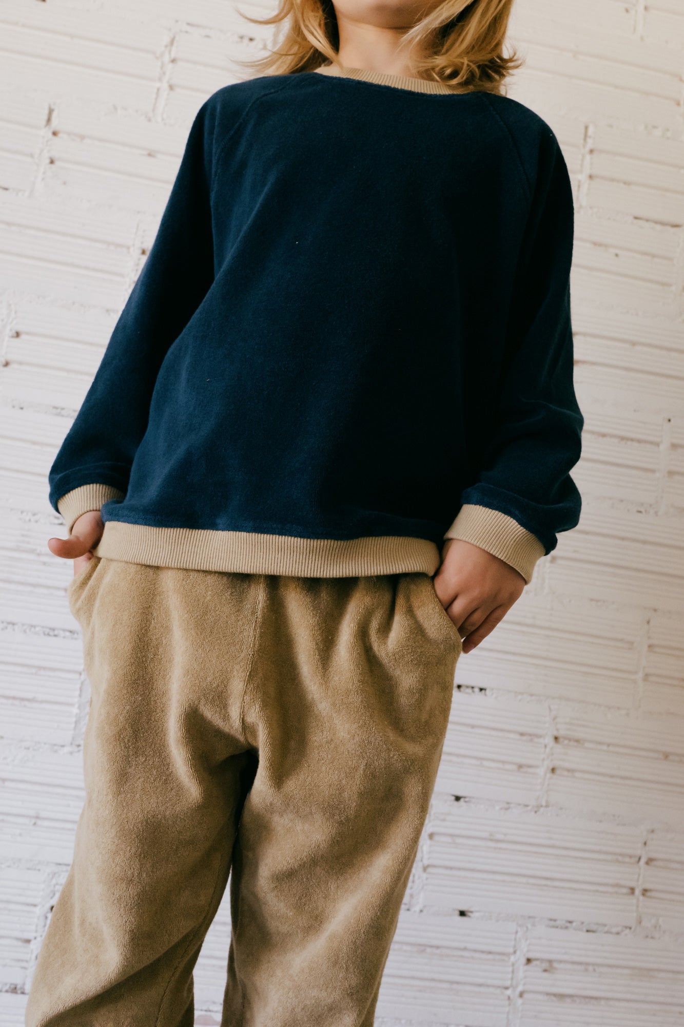 Ginger is an oversized terry sweatshirt with long raglan sleeves. An original model with contrasting ribbing on the collar, sleeves and hem. Very comfortable and soft to the touch. Ideal for the mid-season months that can be combined with the Galina pant to create multiple combinations. A basic Origin in midnight blue with beige trims, from the AURA collection, which conveys strength and light and gives a special and exclusive touch to the garment. All our garments are made free of toxins and are hypoallergenic for the soft and delicate skin of your little ones.