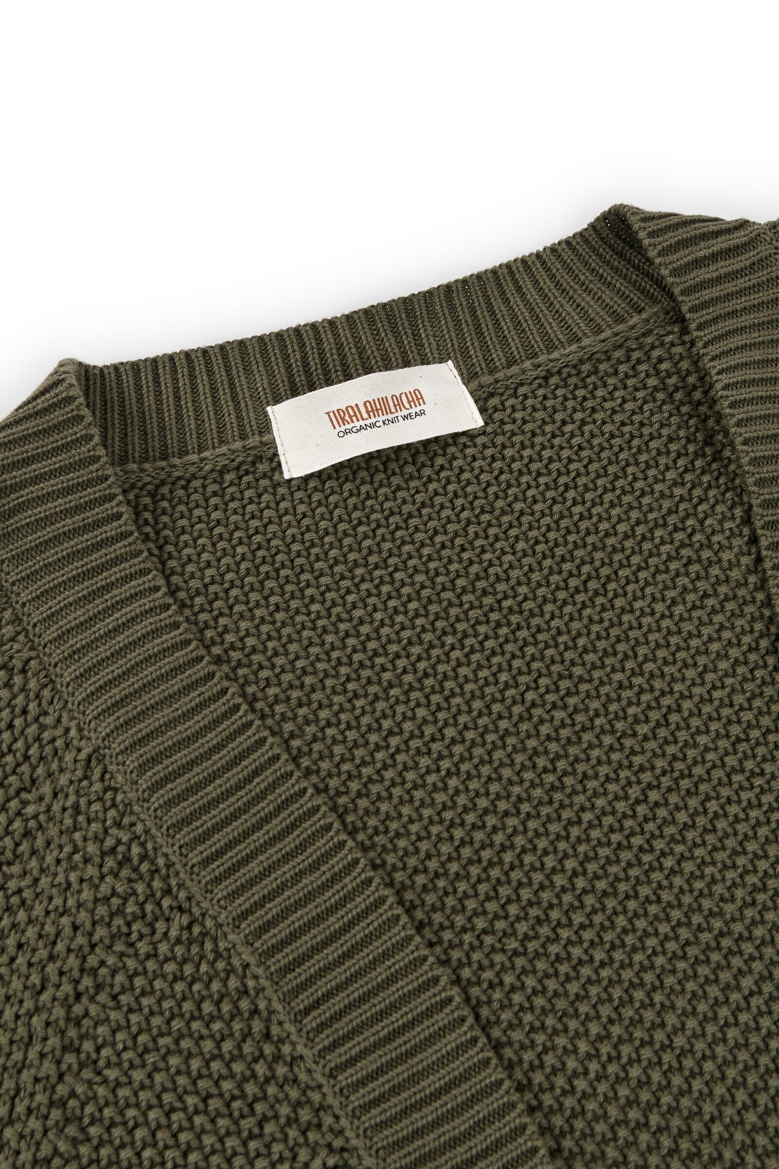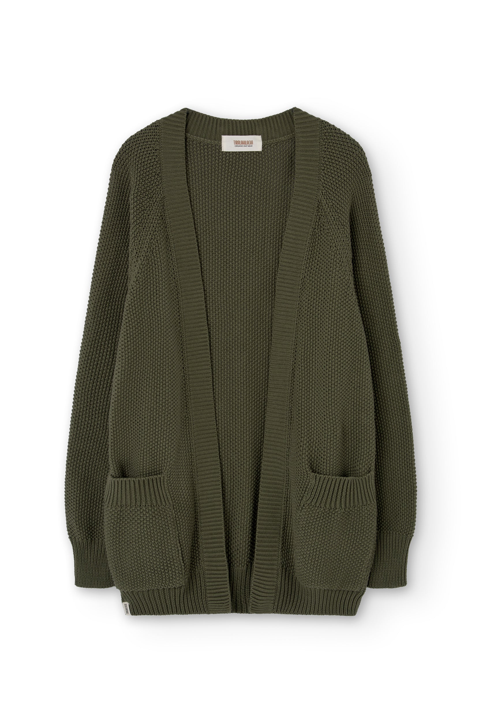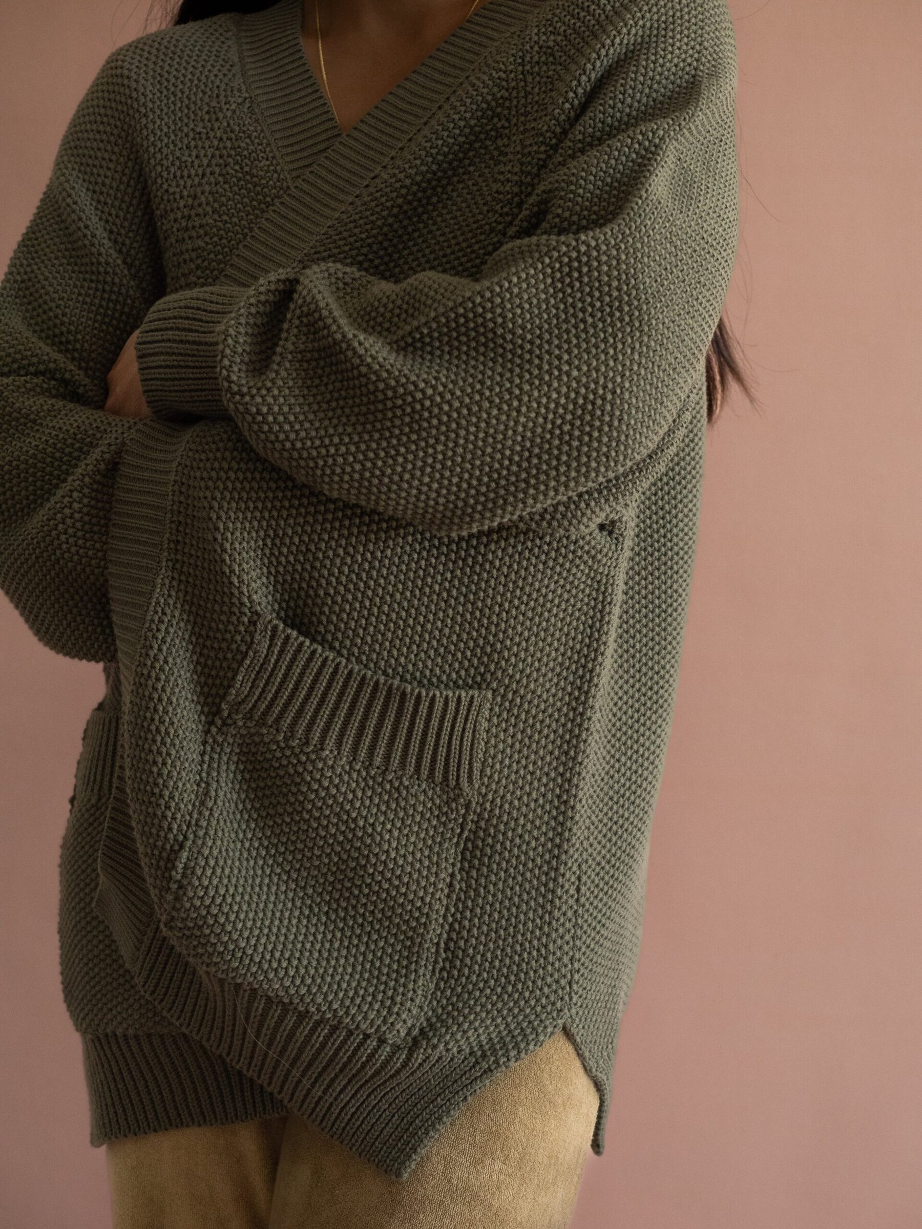 Giola is a long oversized knit cardigan with raglan sleeves you won’t be able to stop wearing. It adapts to any silhouette and is available in two sizes. A long cardigan that you can find in several colours, a timeless basic and a must-have for your sustainable wardrobe that you can wear from autumn to spring! This boreal green model is made with high quality GOTS certified organic cotton, which makes it so soft and respectful with your skin. 0 km production made in Spain and without waste.