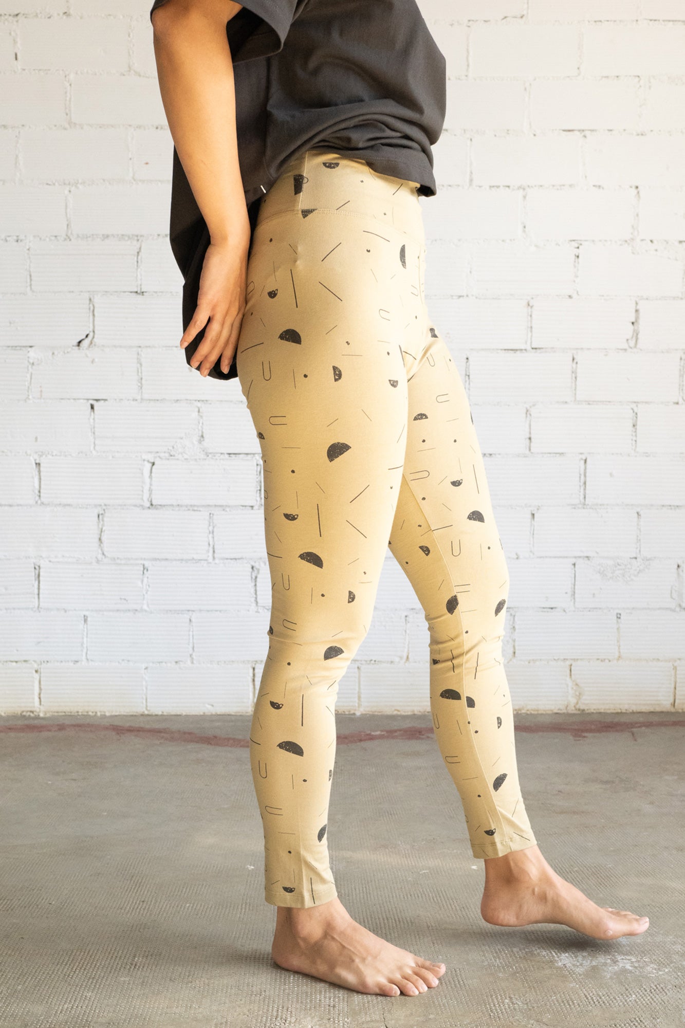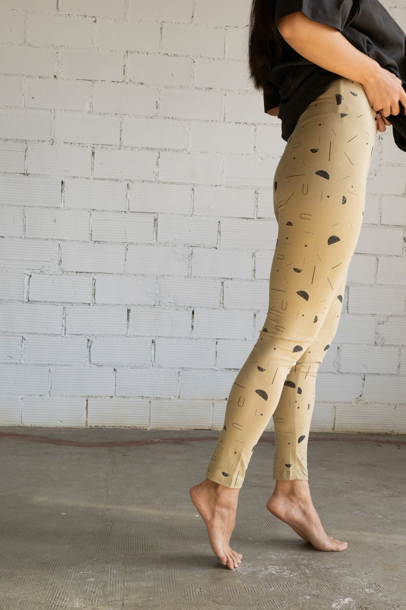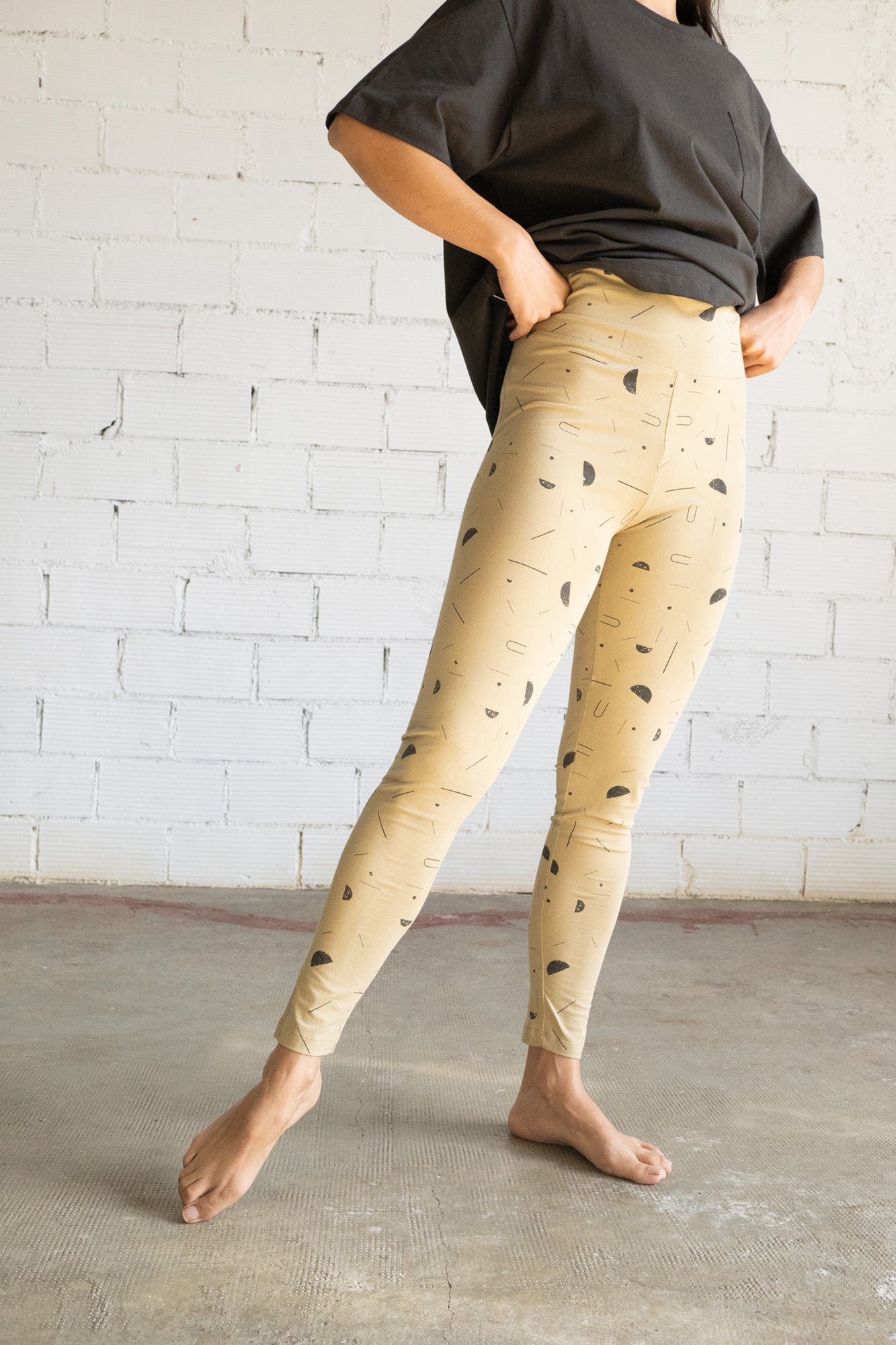 The Gleda leggings have a high waist that adapts to your silhouette. Made of knitted organic cotton, they are the perfect outfit to feel comfortable at home, exercise, meditate or simply go for a walk. They match very well with our Gilda and Gabriela sweatshirts giving a unique style to your look. An ideal garment to wear during pregnancy and after birth. Our Gleda leggins fits quite a bit, so we recommend choosing a smaller size than usual. The sidereal rain print in beige, from the AURA collection, conveys strength and light and gives a special and exclusive touch to the garment. All our garments are made free of toxics and are hypoallergenic.