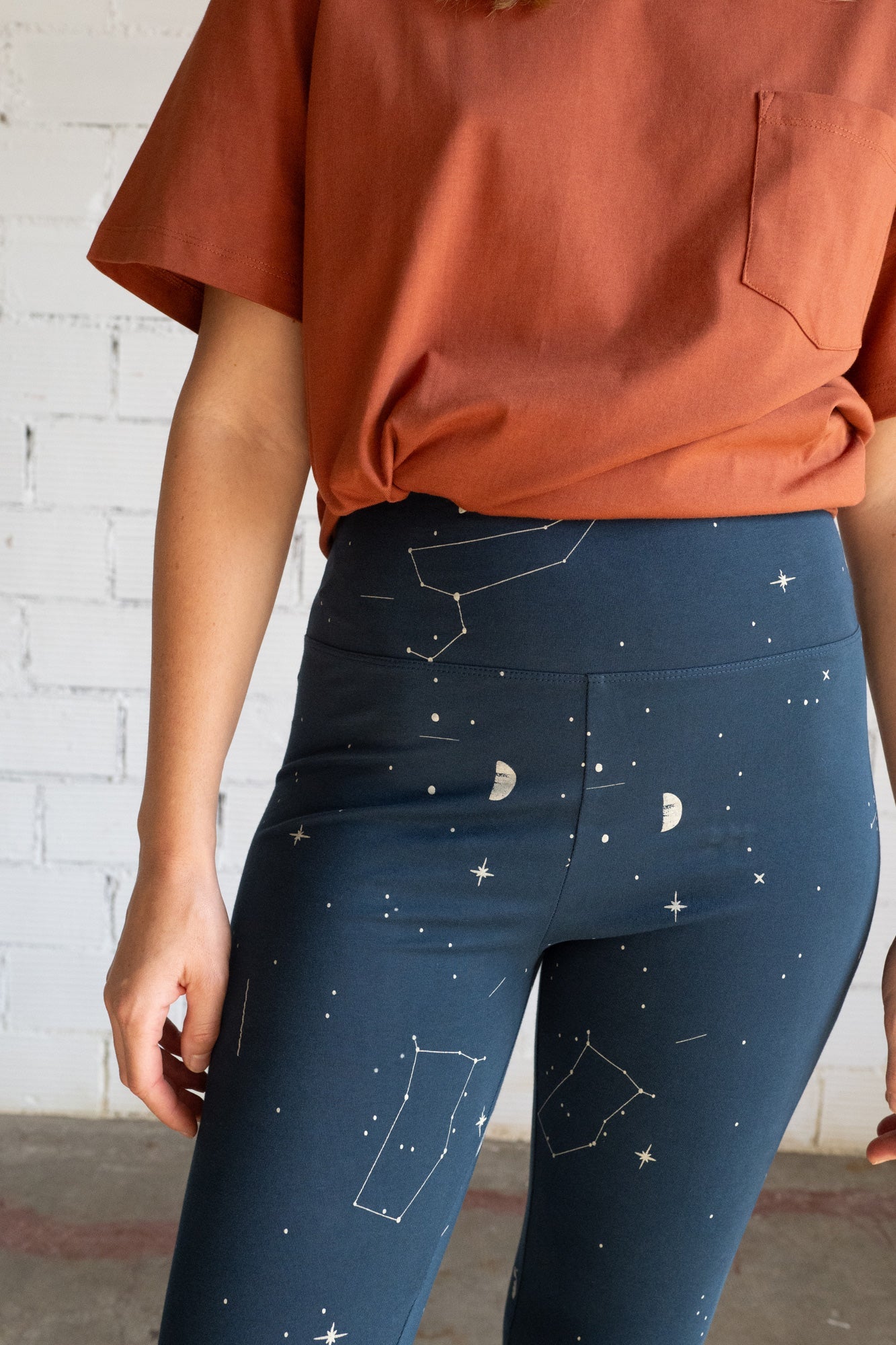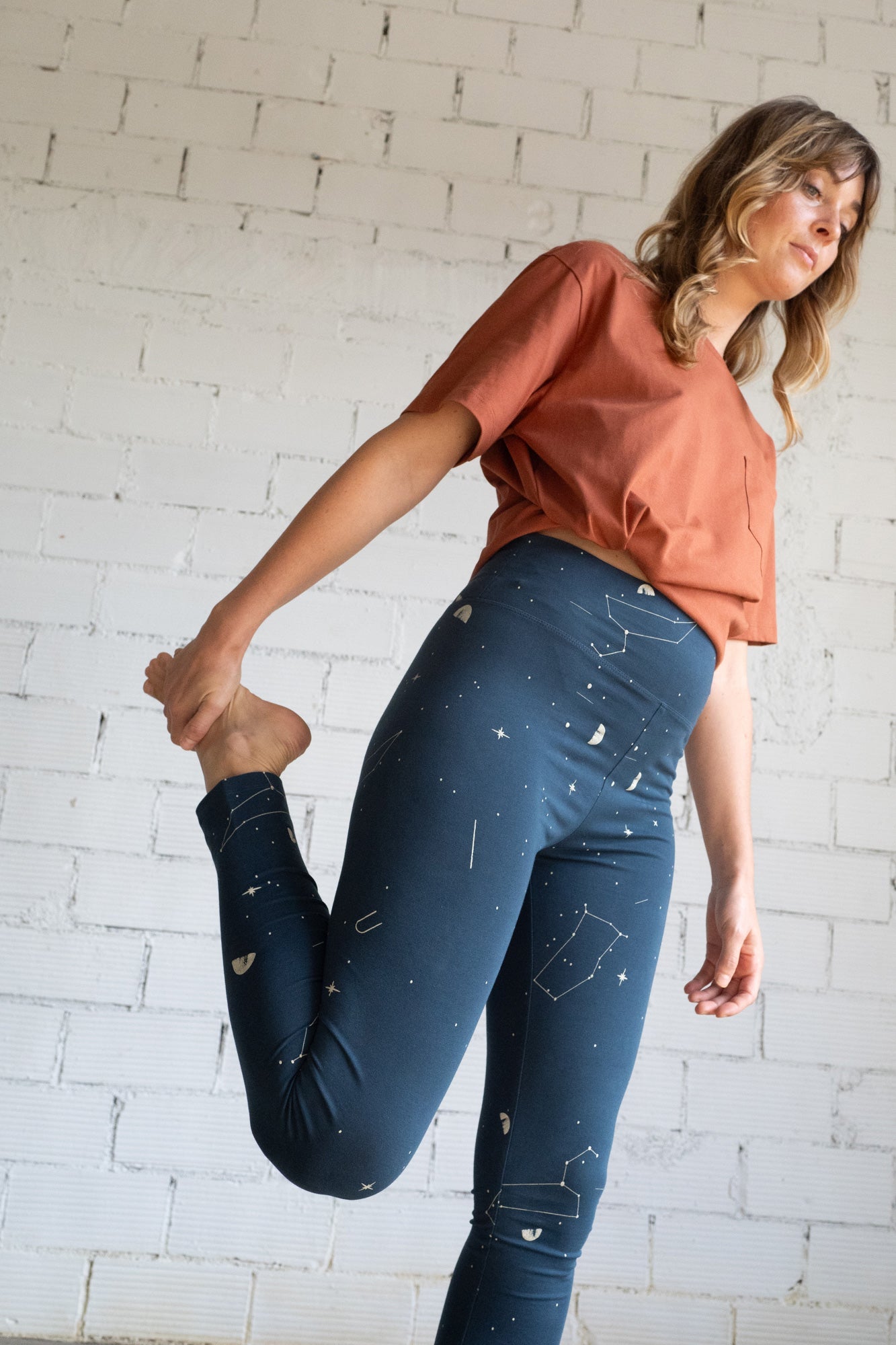 The Gleda leggings have a high waist that adapts to your silhouette. Made of knitted organic cotton, they are the perfect outfit to feel comfortable at home, exercise, meditate or simply go for a walk. They match very well with our Gilda and Gabriela sweatshirts giving a unique style to your look. An ideal garment to wear during pregnancy and after birth. Our Gleda leggins fits quite a bit, so we recommend choosing a smaller size than usual. The midnight blue constellation print, from the Aura collection, conveys strength and light and gives a special and exclusive touch to the garment. All our garments are made free of toxins and are hypoallergenic.
