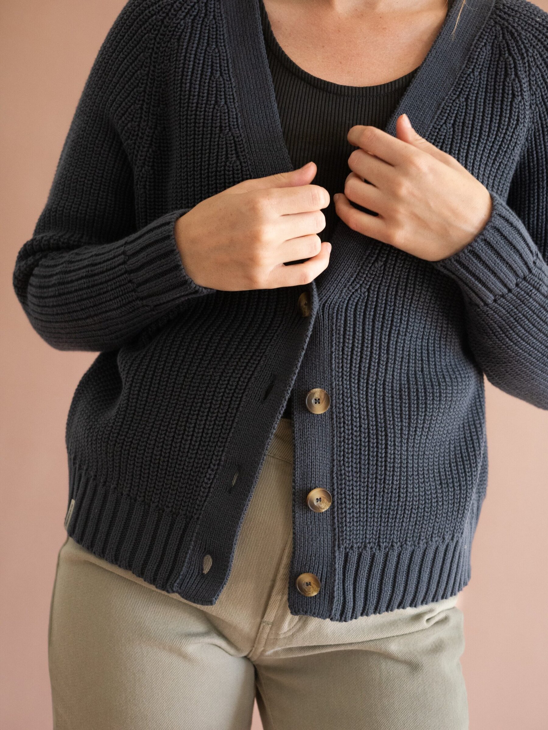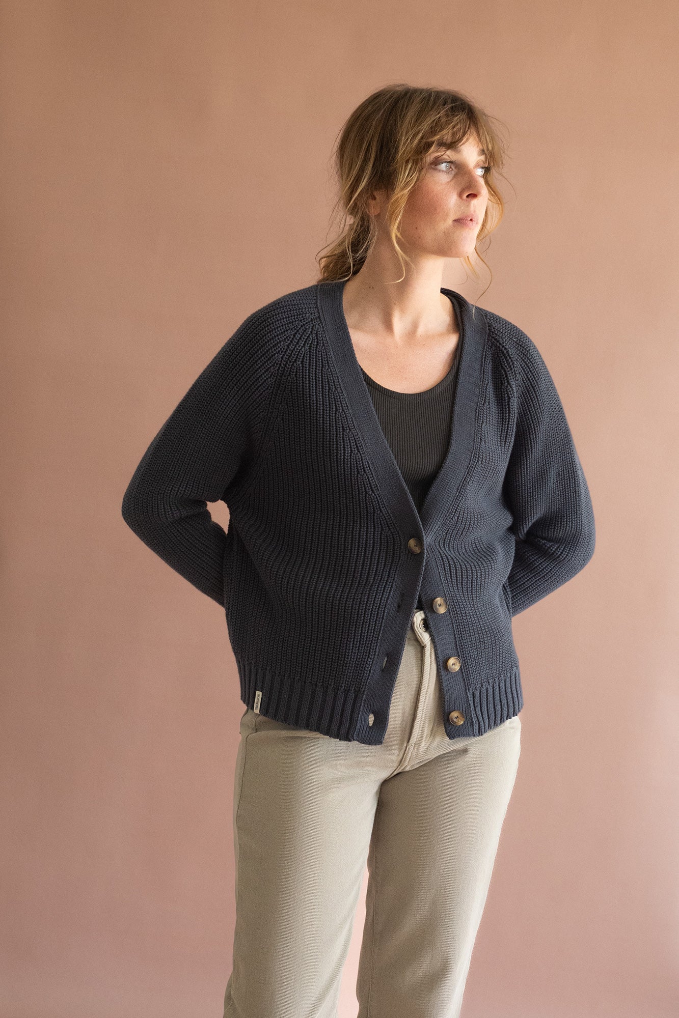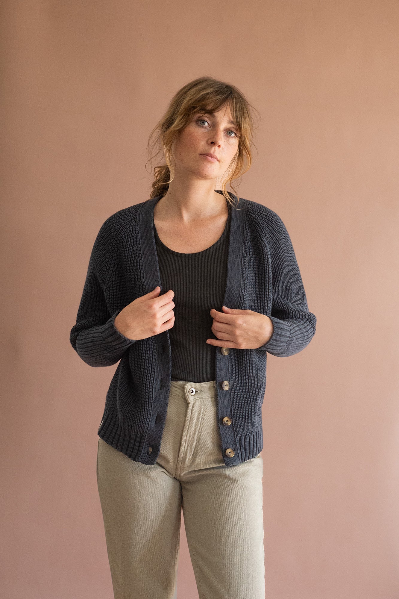 Golah is a ranglan sleeve knit cardigan that you will wear over time. It adapts to any silhouette and has beautiful functional buttons made of corozo wood. A short cardigan in various colors, an essential garment for your sustainable wardrobe. Depending on the size you choose, it will fit more or less loose (size ML goes up to a size 44-46). A timeless blue-grey basic that you can wear from autumn to spring. It is made from high quality GOTS certified organic cotton, making it so soft and kind to your skin. 0 km production made in Spain and without waste.