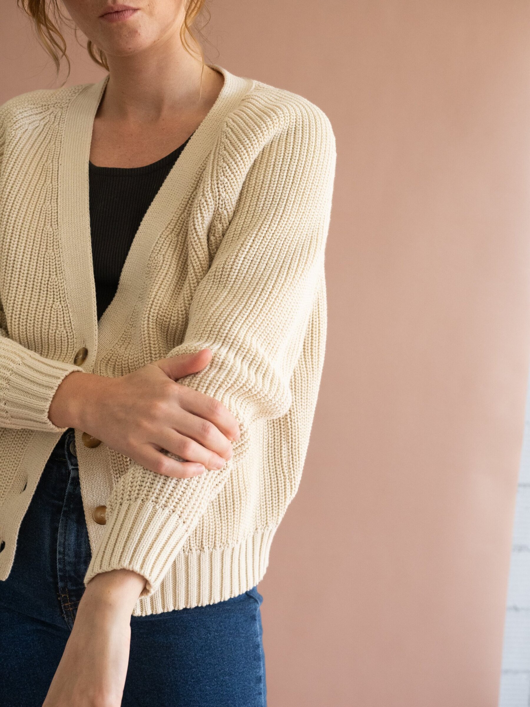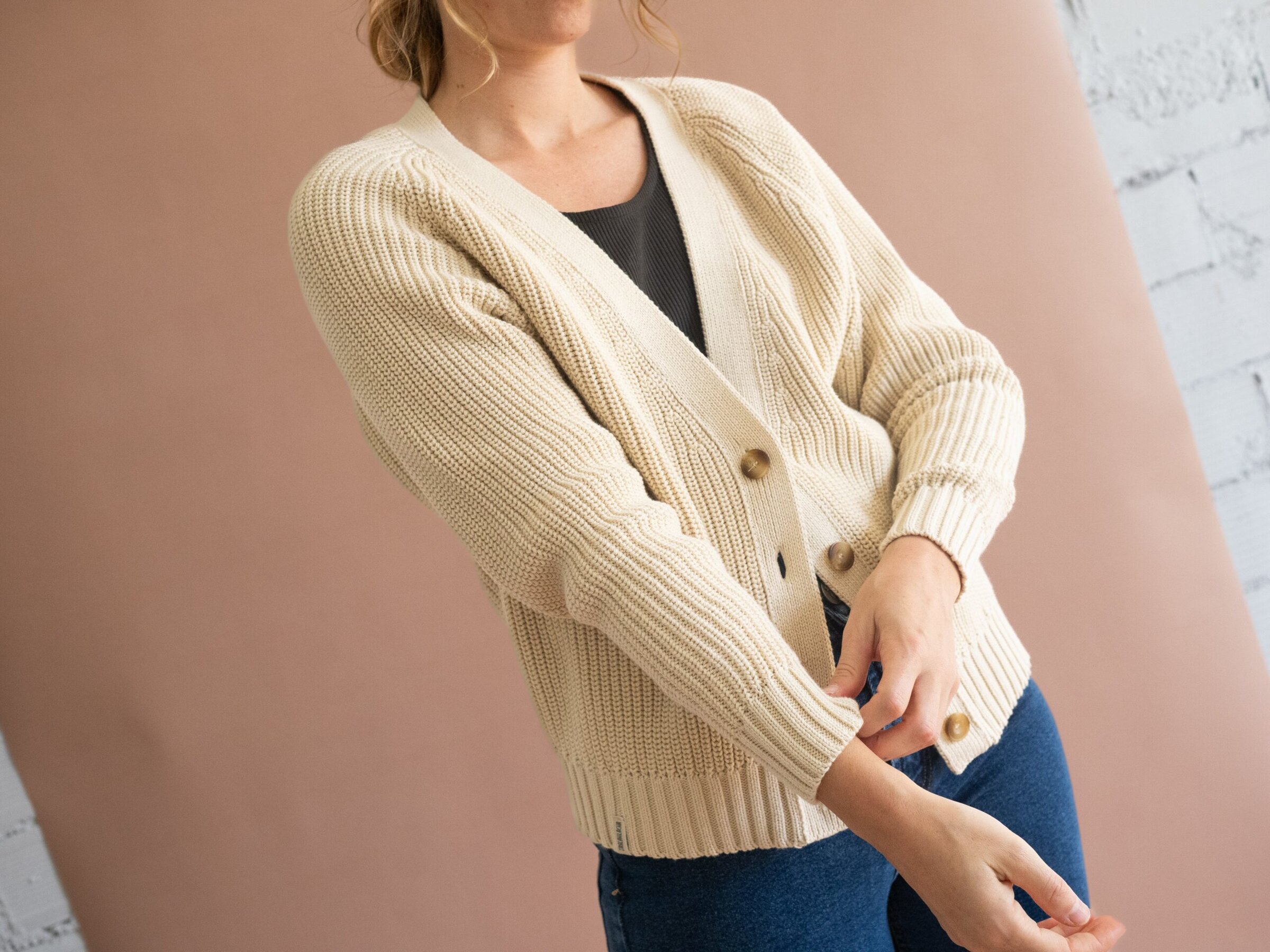 Golah is a ranglan sleeve knit cardigan that you will wear over time. It adapts to any silhouette and has beautiful functional buttons made of corozo wood. A short cardigan in various colours, an essential garment for your sustainable wardrobe. Depending on the size you choose, it will fit more or less loose (size ML goes up to a size 44-46). A timeless natural white basic that you can wear from autumn to spring. It is made from high quality GOTS certified organic cotton, making it so soft and kind to your skin. 0 km production made in Spain and without waste.