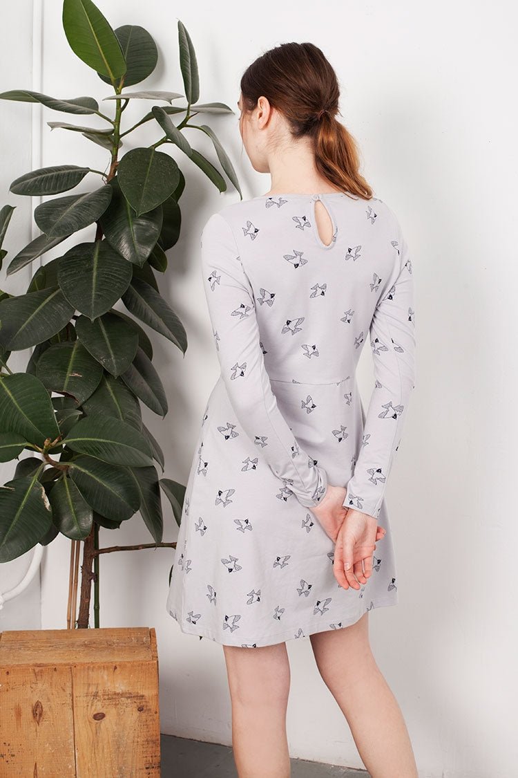 Flared dress in grey with birds prints and bow detail. 95% Fair Trade Organic Cotton 5% Lycra. Designed with ♥ in Barcelona. Ethically made in India.