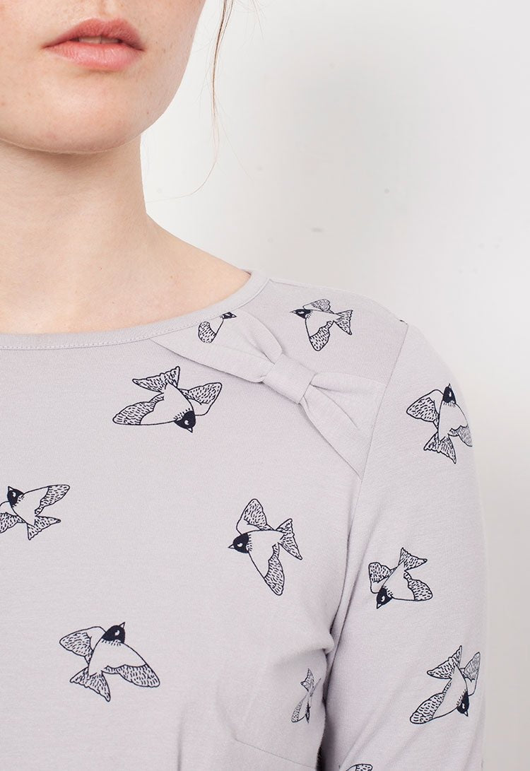 Flared dress in grey with birds prints and bow detail. 95% Fair Trade Organic Cotton 5% Lycra.