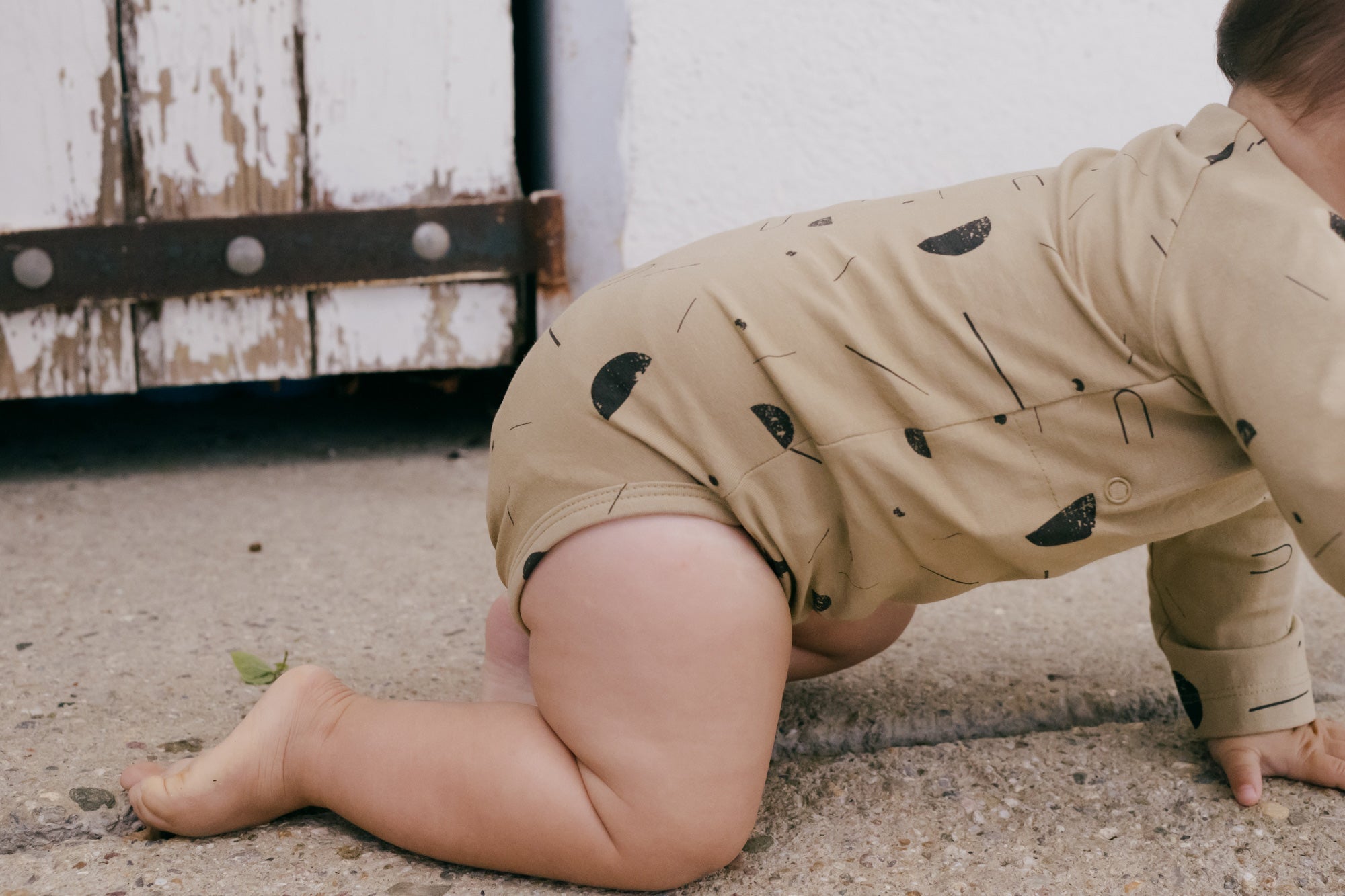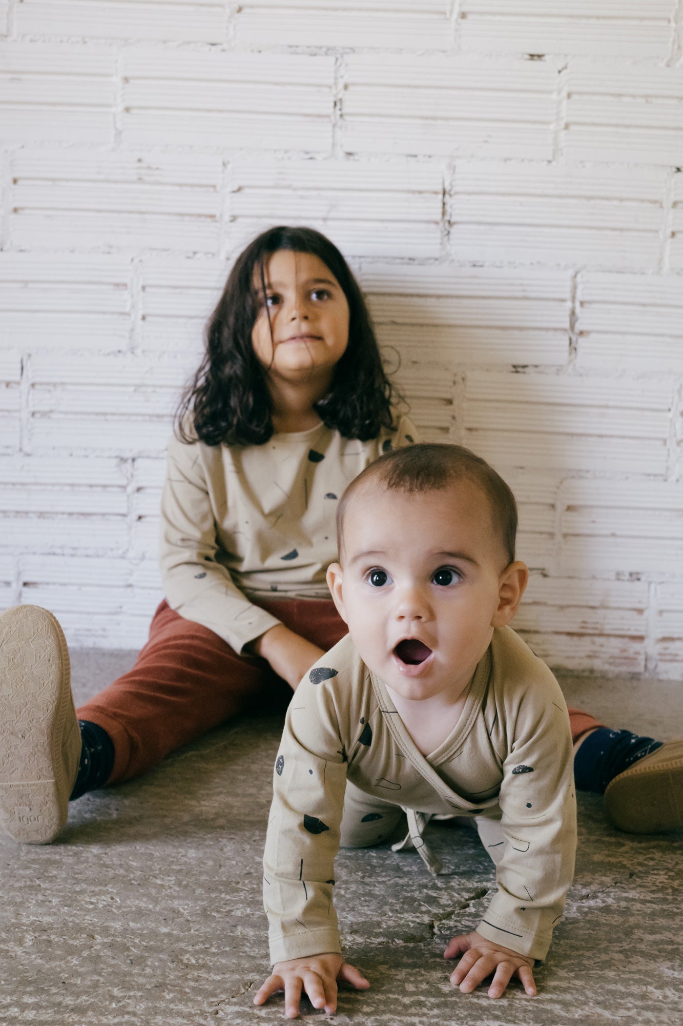 Griselle is a baby bodysuit with long sleeves made of organic cotton. It has nickel-free clasps at the neckline and bottom so that you can easily dress your baby. It is a comfortable and warm garment, very soft and pleasant to the touch. The sidereal rain print in beige, from the AURA collection, conveys strength and light and gives a special and exclusive touch to the garment. All our garments are made free of toxins and are hypoallergenic for your little one’s soft and delicate skin.