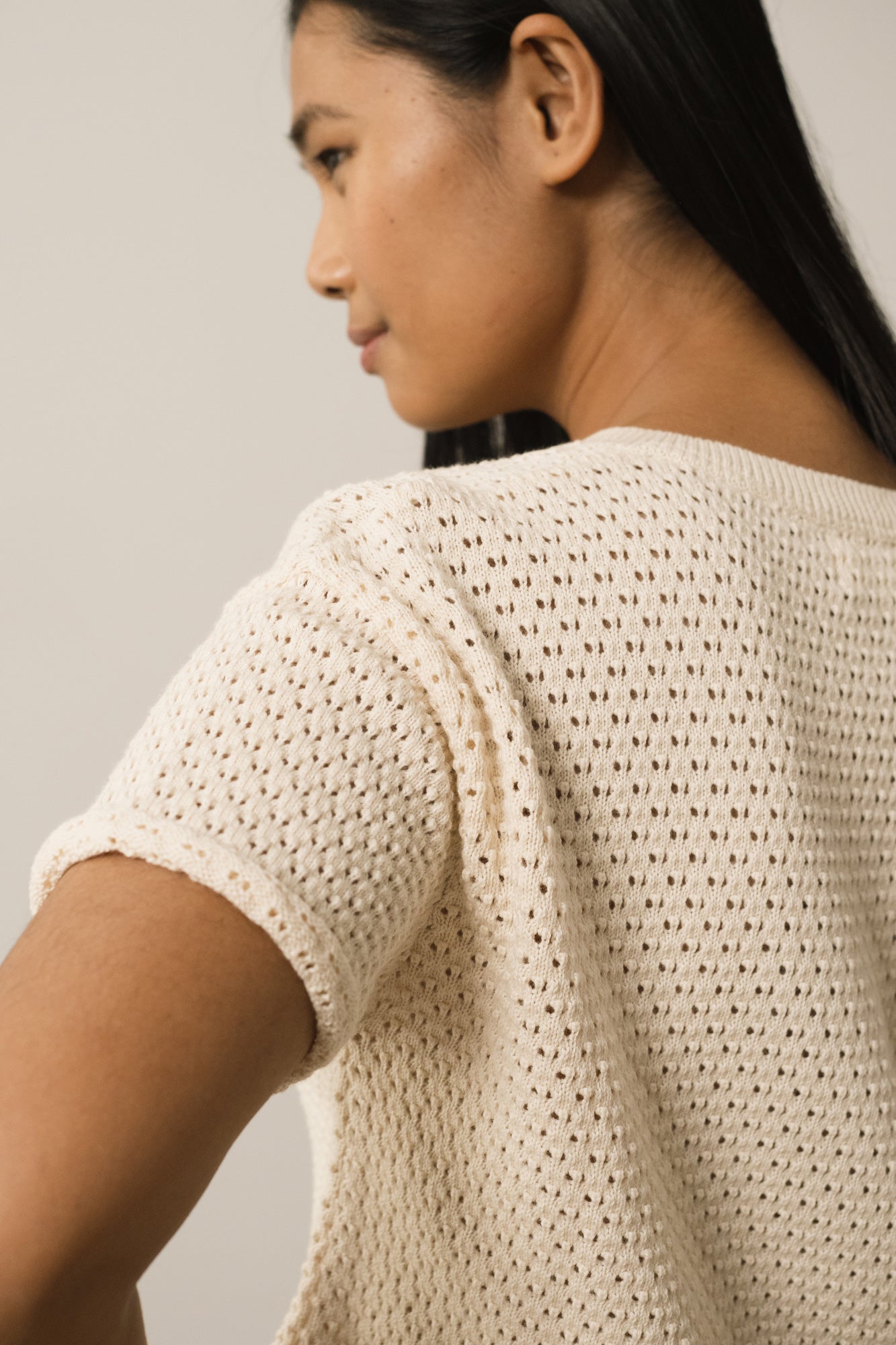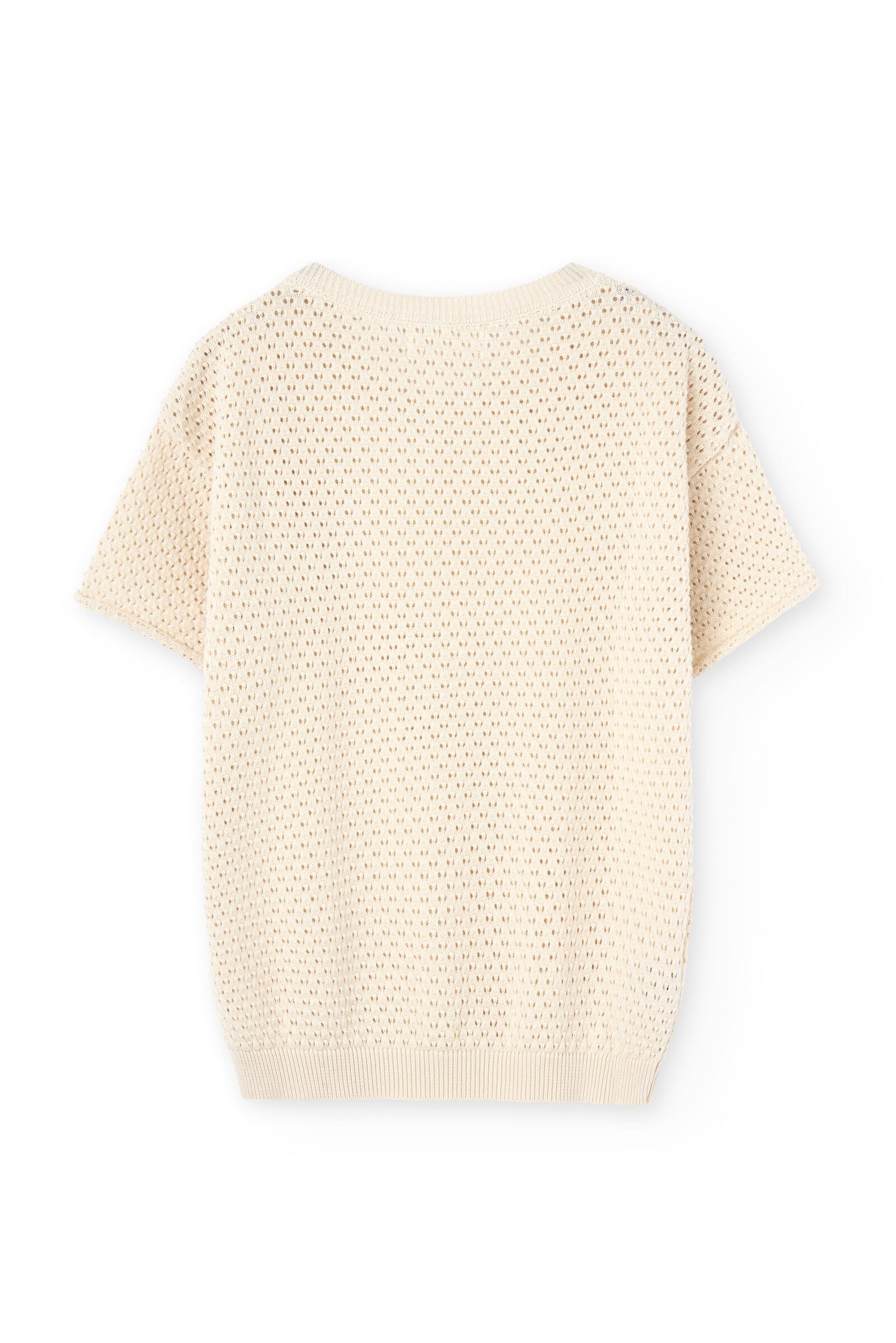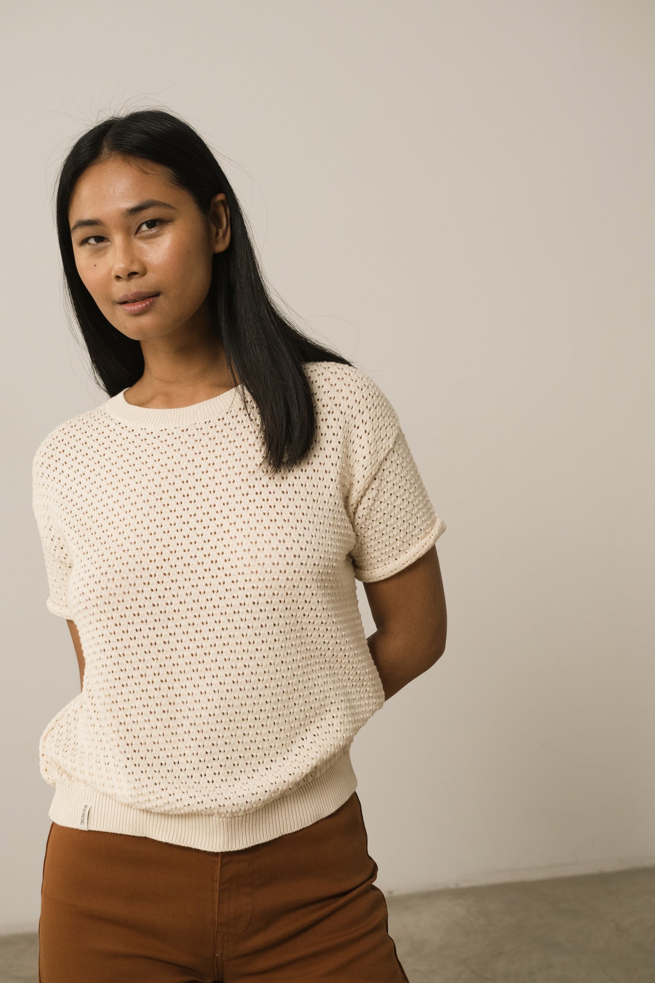 This vintage top with openwork stitch is your great ally for the transitional seasons. Carefully made of premium organic cotton yarn and handcrafted in a family workshop in Cuenca (Spain). A cute basic for your sustainable wardrobe and very combinable with our Henar trousers in terracotta color.