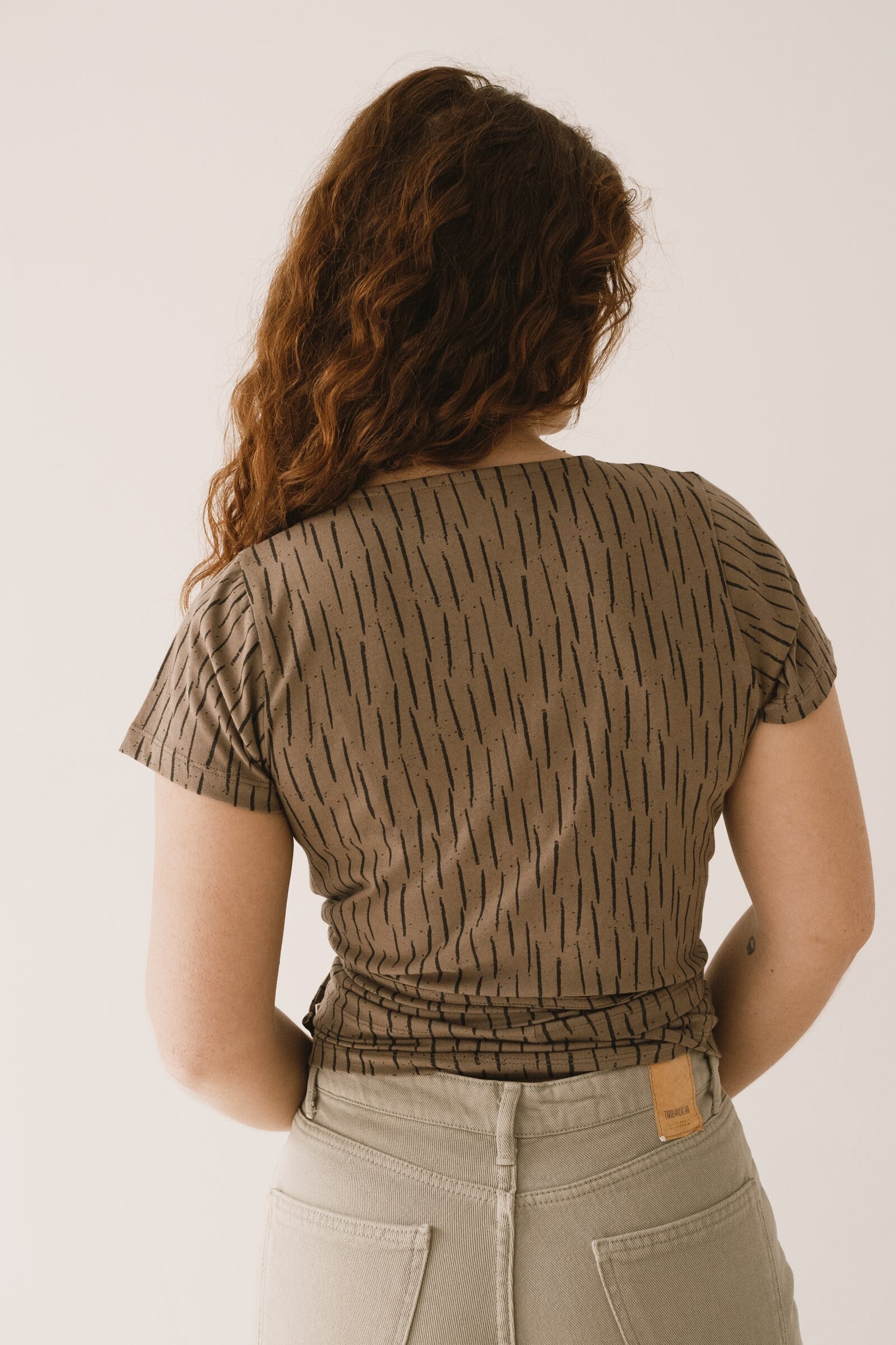 Hagne is that T-shirt that wraps you in a soft, warm hug. It’s the perfect garment that you can adapt to your silhouette however you like—adjust the tie or knot in the front, back, or on the side, wear it long to the hips or hike it up to the waist. It’s versatility taken to the next level! Pair it with our Halia skirt in black or the Henar pants in beige for a more relaxed look. Crafted from high-quality organic cotton knit and printed with eco-friendly dyes. The rustic brown bark print from our DREAM collection takes you back to nature’s roots, inspired by trees and their protective «skin,» ensuring a natural and eco-conscious style for you and the planet.