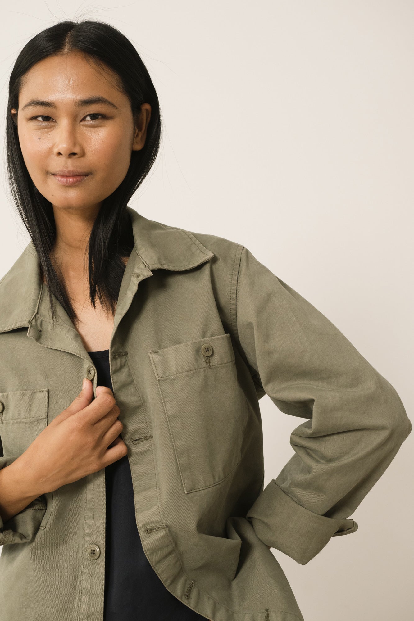 Helmut is the perfect unisex overshirt for any outfit or season of the year. A fundamental piece in your sustainable wardrobe that will stand the test of time. Inspired by the classic workwear of the 1950s, it is crafted from premium 325 g/m2 fabric and softened with an eco-friendly wash. Made with 100% organic cotton twill in a family workshop in Albacete (Spain). This oversized garment features a straight cut, patch pockets, and French flaps with natural corozo buttons, dyed to match. Note: We recommend you to choose one size smaller than usual. The green color of the Origen Basics collection conveys serenity and reminds us of the exuberance and lushness of a forest.