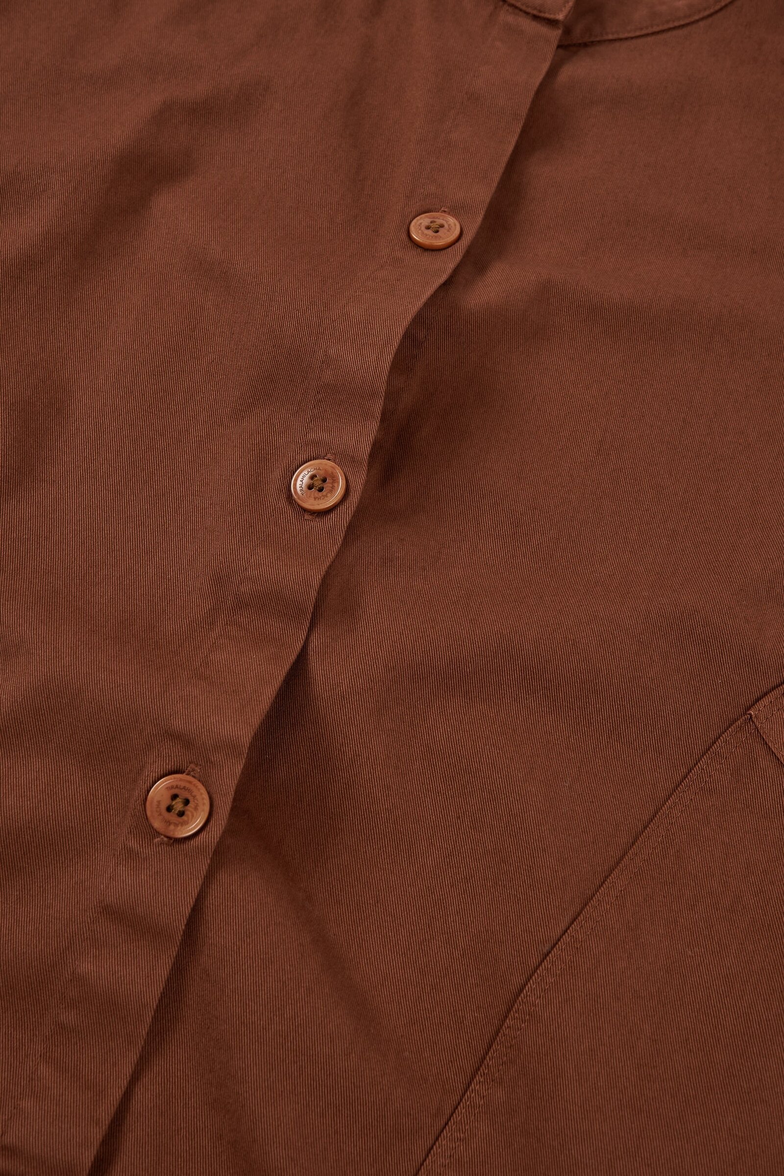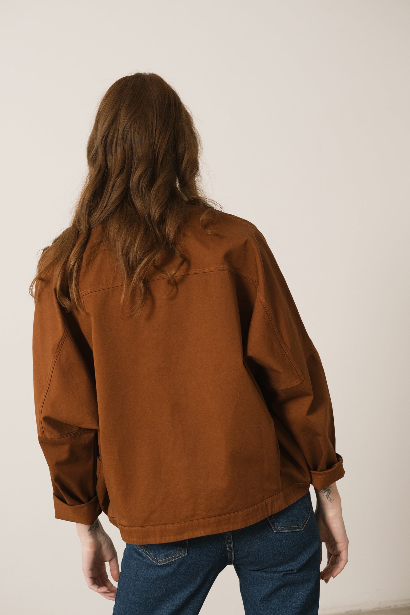 Henny is a must in your sustainable wardrobe. A unique jacket to wear in between seasons with an endless number of outfits. It has an oversized fit with drop sleeves and adapts beautifully to all silhouettes. With a mao neckline and wide pockets. It has tone-on-tone dyed biodegradable natural corozo buttons. This garment is made in our own factory and is limited edition, only a few units of each colour are available! Made from a fine organic cotton twill and sewn with french seams on the inside. A quality garment that will last over time. Its terracotta color of the Origin Basics collection evokes the warmth of sunsets.