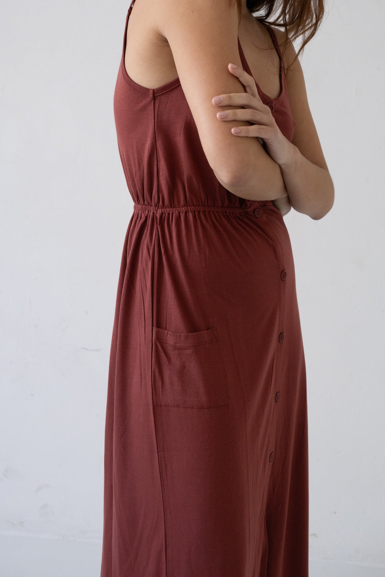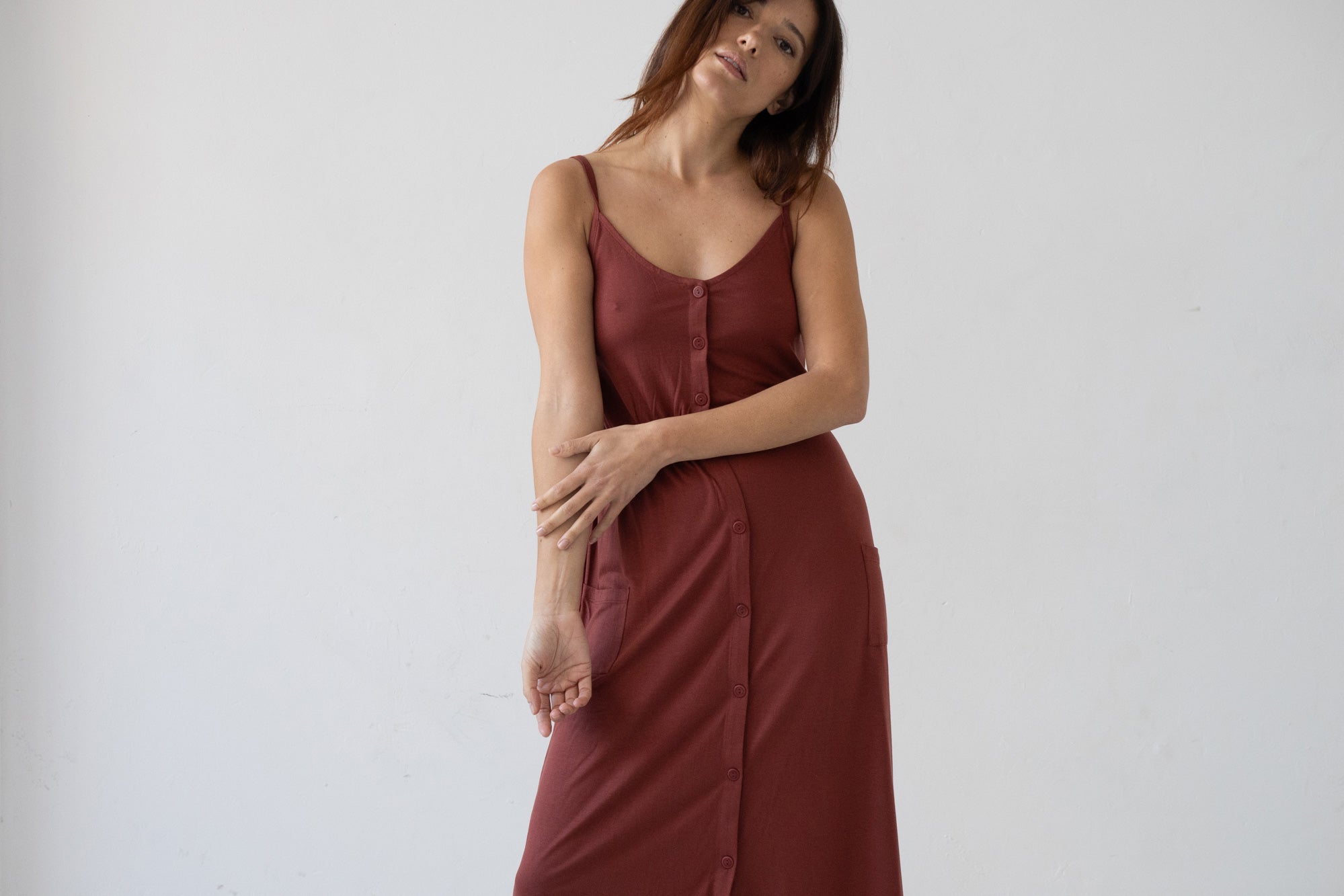 The dress you’ve been searching for is here. Meet Hiara, featuring the perfect midi cut with a button-down front adorned with functional buttons made from naturally dyed corozo nuts. Designed with a waist cut to flatter your silhouette and elastic for comfort. It’s an elegant dress that will be by your side all summer long. Crafted from high-quality TENCEL™ Lenzing fabric and eco-friendly dyes, it’s irresistibly soft and gentle on the skin. You can complete the look with our Giola jacket in black for cooler evenings. The ruby red color from our Origin Basics collection radiates vitality, passion, and confidence.