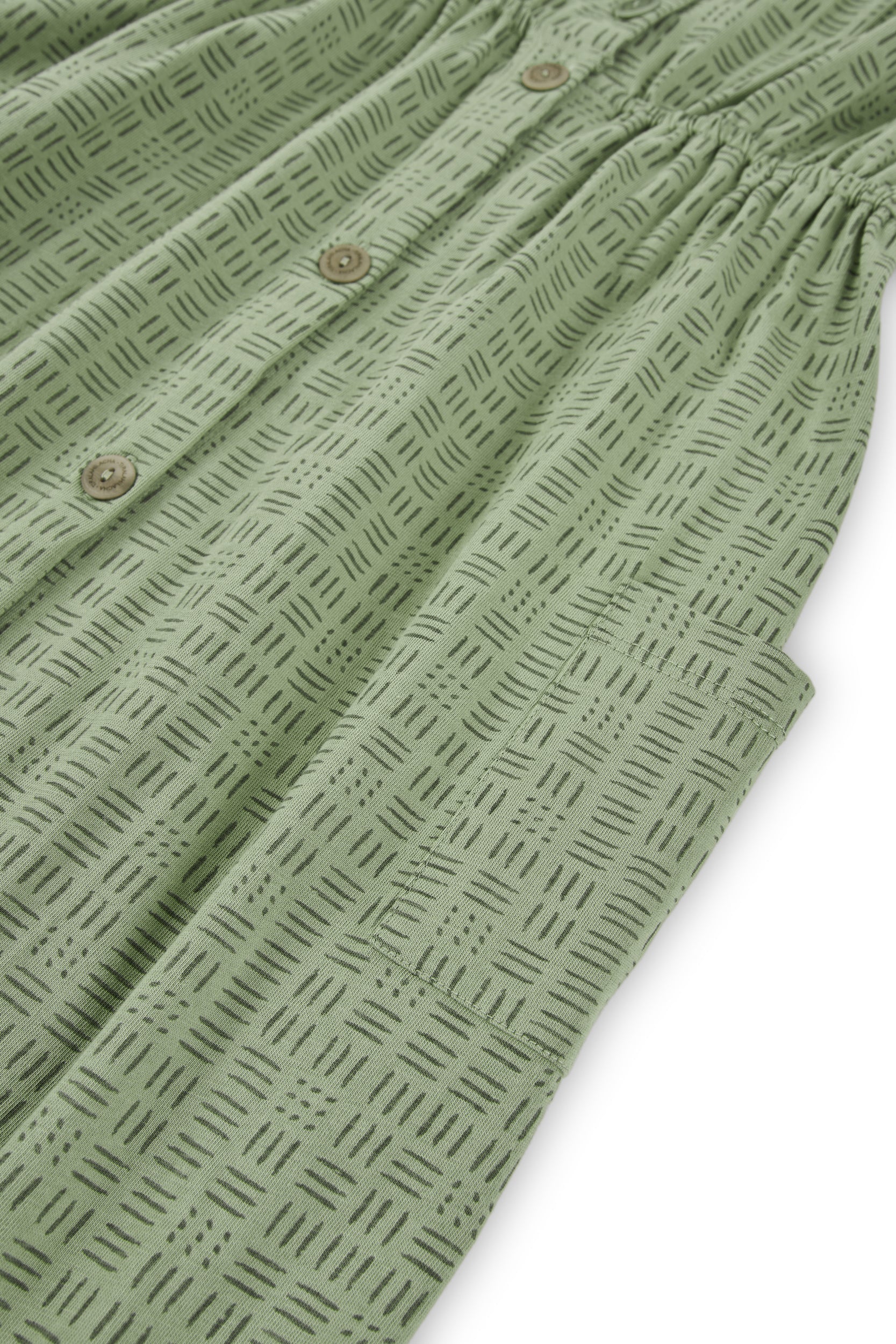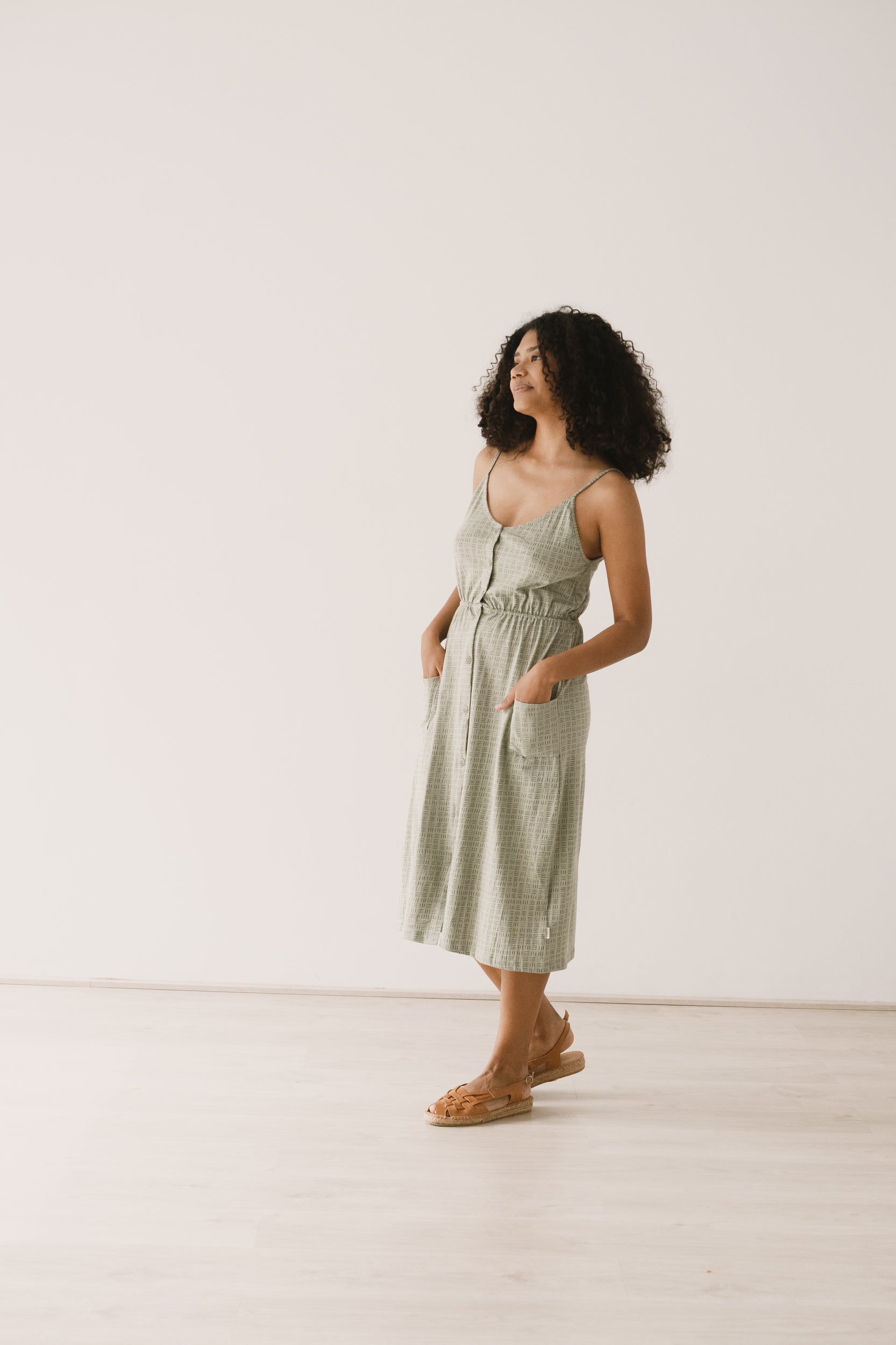 The dress you’ve been searching for is here. Meet Hiara, featuring the perfect midi cut with a button-down front adorned with functional buttons made from naturally dyed corozo nuts. Designed with a waist cut to flatter your silhouette and elastic for comfort. It’s the go-to casual dress for your summer adventures. Crafted from high-quality organic cotton knit and printed with eco-friendly dyes, it’s irresistibly soft and gentle on the skin. Pair it with our Giola jacket in beige for those cooler nights. The wicker print from our DREAM collection draws inspiration from the intricate weaving and bonds we create with our artisan partners, who meticulously craft and cherish every detail of your garments. A tapestry of cultures!