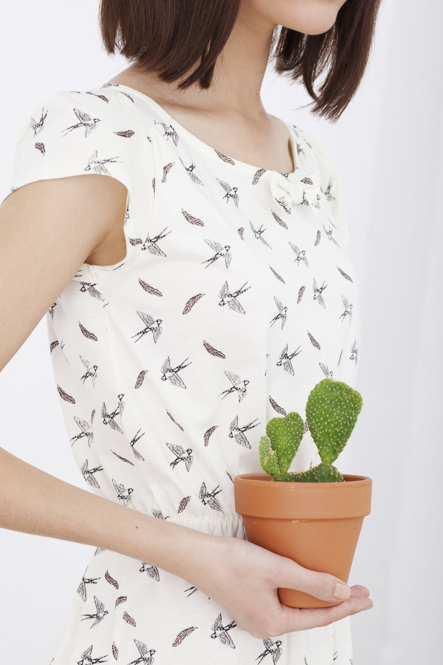 Bird and feather print dress. Elastic on the waist and small bow on the neck line. 100% Organic Fairtrade Certified Cotton.