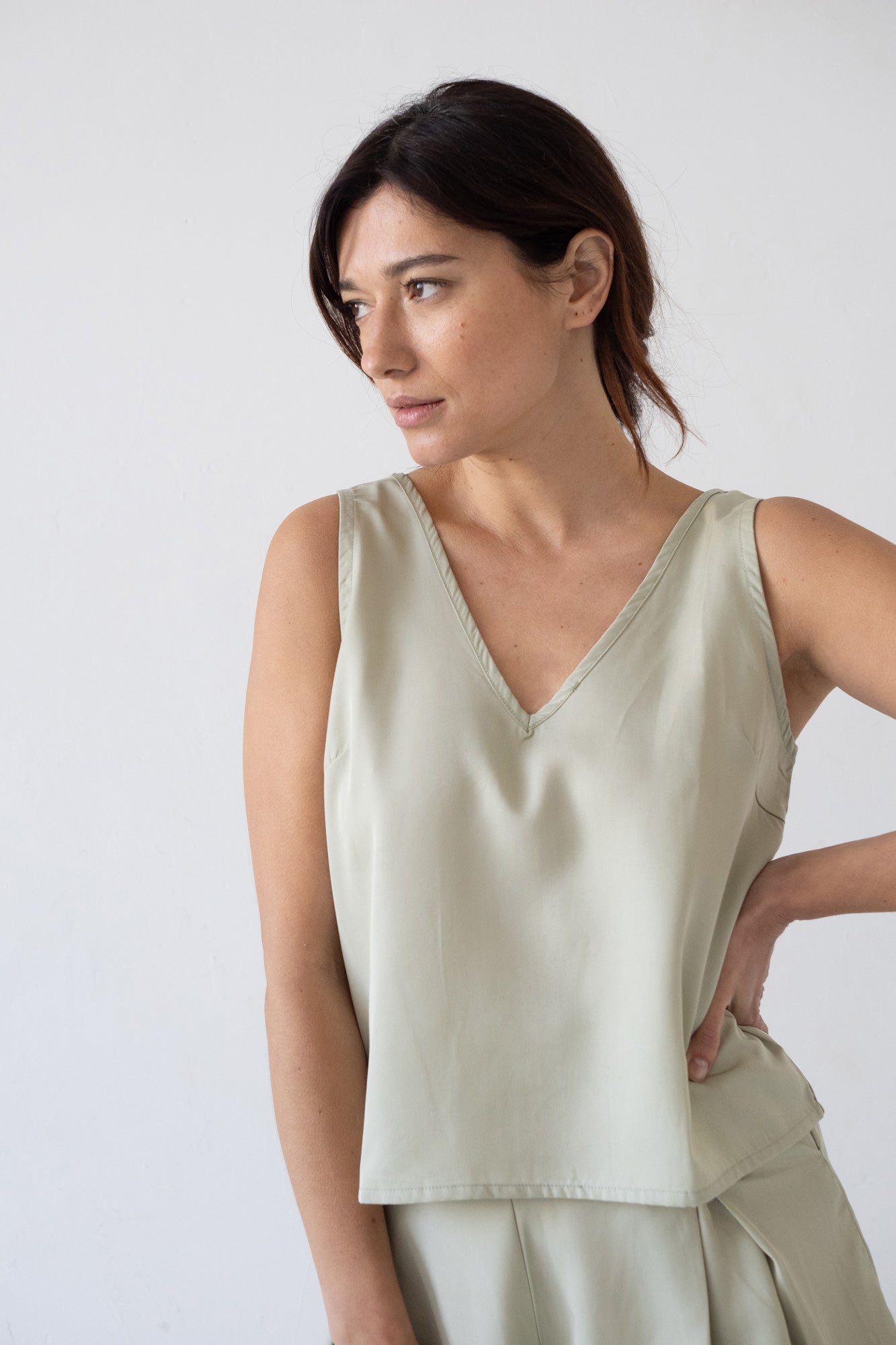 The trendy crop top and its endless styling possibilities. A summer essential. Fresh, light, and comfortable. Slightly loose straight fit with a V-neckline in the front and back. You can pair it with the Halia skirt or the Hannia shorts for a complete look. Crafted from premium TENCEL™ Lenzing twill and dyed with eco-friendly dyes. The Jade green color from our Origin Basics collection evokes harmony, tranquility, and confidence, along with a sense of freshness and lightness.