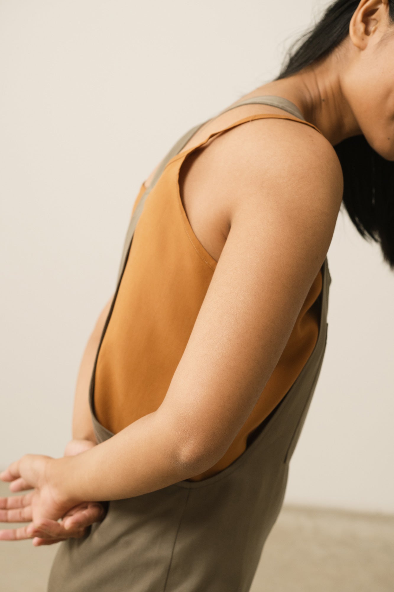 Hyuna is a long, loose-fitting jumpsuit made from TENCEL™ fabric. The fabric is high quality, light, cool and very draping. You’ll be able to wear this versatile garment on countless occasions. It is elegant, sophisticated and casual at the same time. A unique and exclusive limited edition model made in our own factory, only a few units of each colour available! Its green color of the Origin Basics collection conveys serenity and connects us with the exuberance and lushness of a forest.