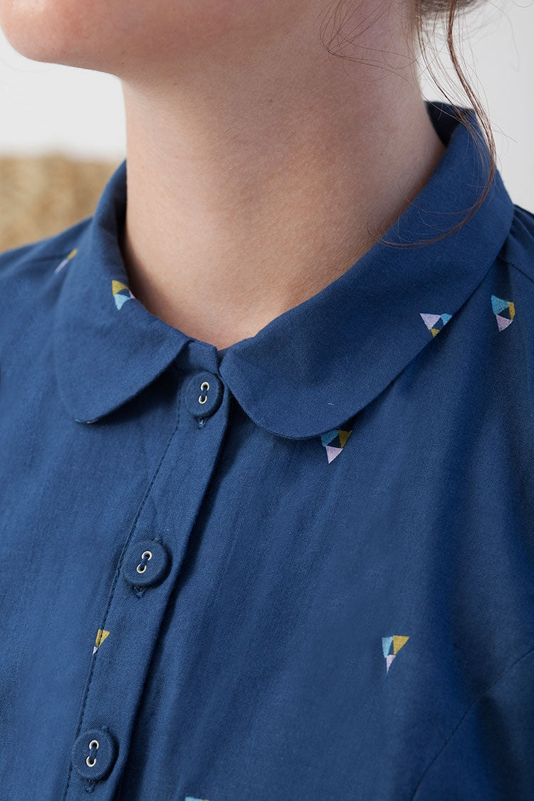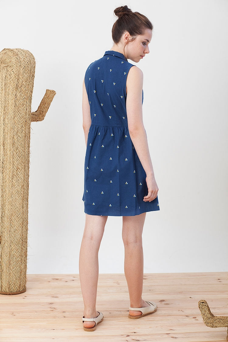 Shirt dress with triangles print. Waist seam and covered buttons. Invisible zip on the side. 100% Fair Trade Organic Cotton.