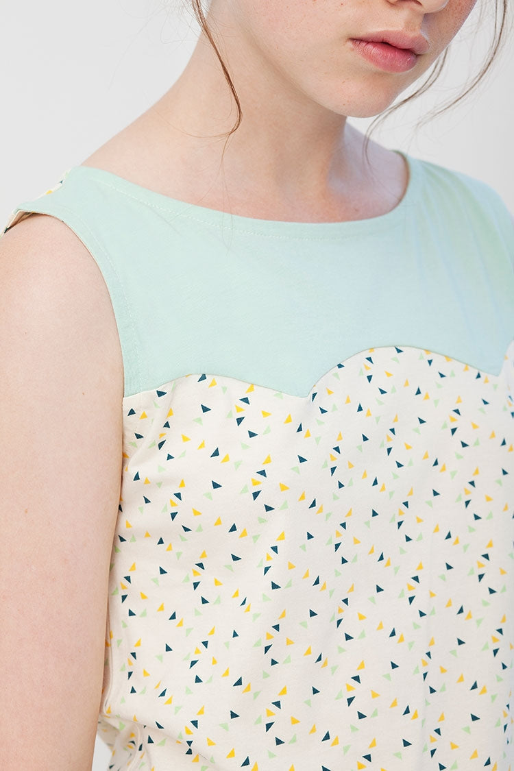 Print t-shirt with yoke detail combined with light green. 100% Fair Trade Organic Cotton. Designed with ♥ in Barcelona. Ethically made in India. What Size am I?