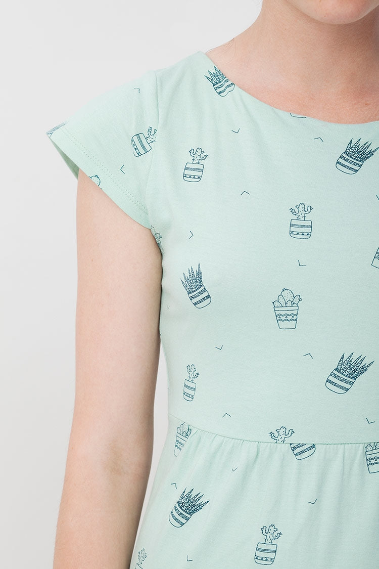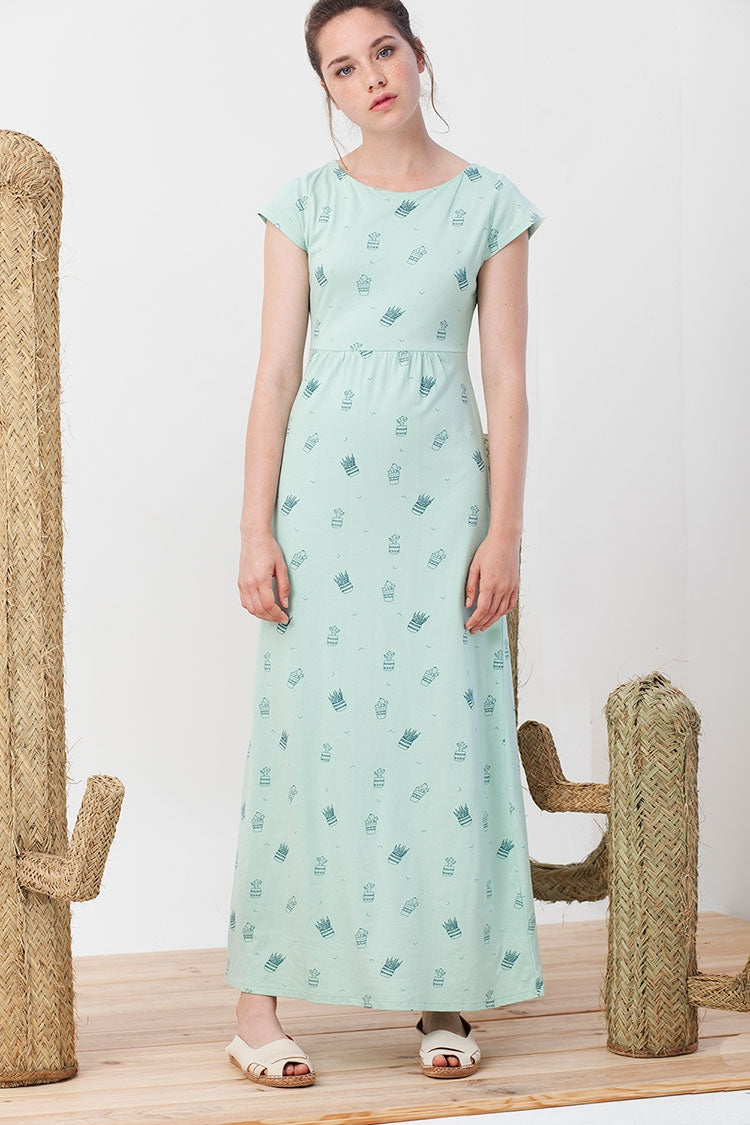 Maxi dress in light green with cactus print. 100% Fair Trade Organic Cotton.