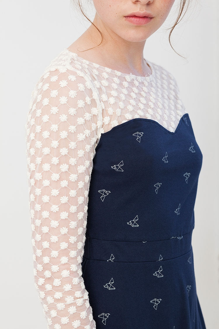 Dress in navy blue with origami print. Beautiful embroidery net detail. Elastic on the waist. 100% Fair Trade Organic Cotton.