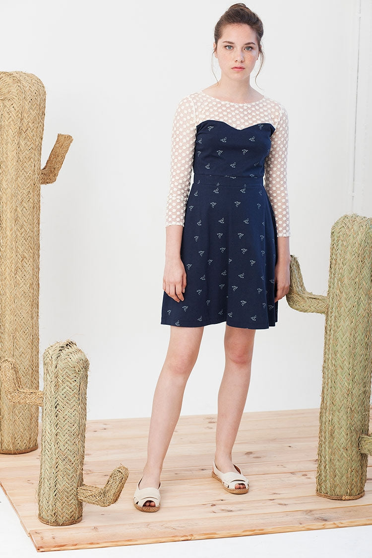 Dress in navy blue with origami print. Beautiful embroidery net detail. Elastic on the waist. 100% Fair Trade Organic Cotton. Designed with ♥ in Barcelona. Ethically made in India. What…