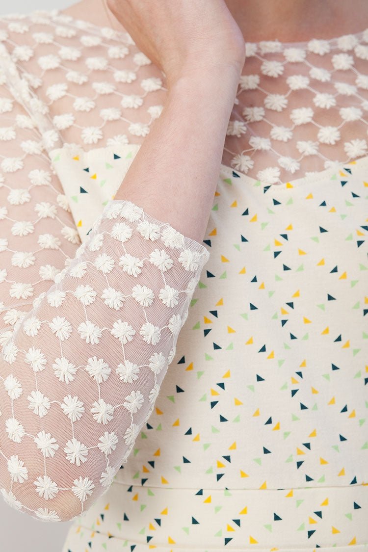 Dress in ecru with triangles print. Beautiful embroidery net detail. Elastic on the waist. 100% Fair Trade Organic Cotton. Designed with ♥ in Barcelona. Ethically made in India.