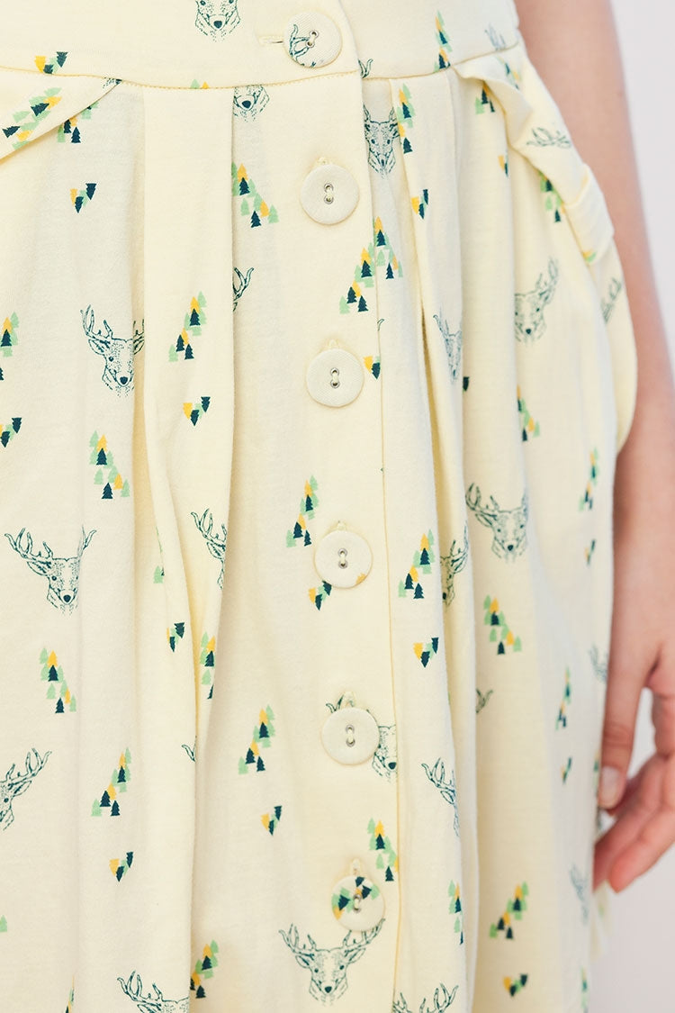 Short skirt in yellow with deer print. Two side pockets and covered buttons. 100% Fair Trade Organic Cotton.
