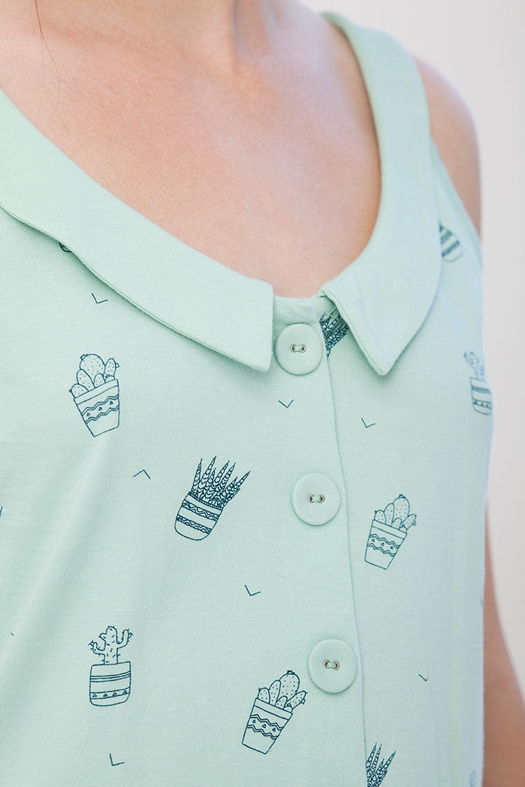 REVERSIBLE t-shirt in light green with cactus print and covered buttons. 100% Fair Trade Organic Cotton.