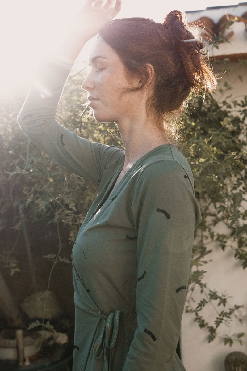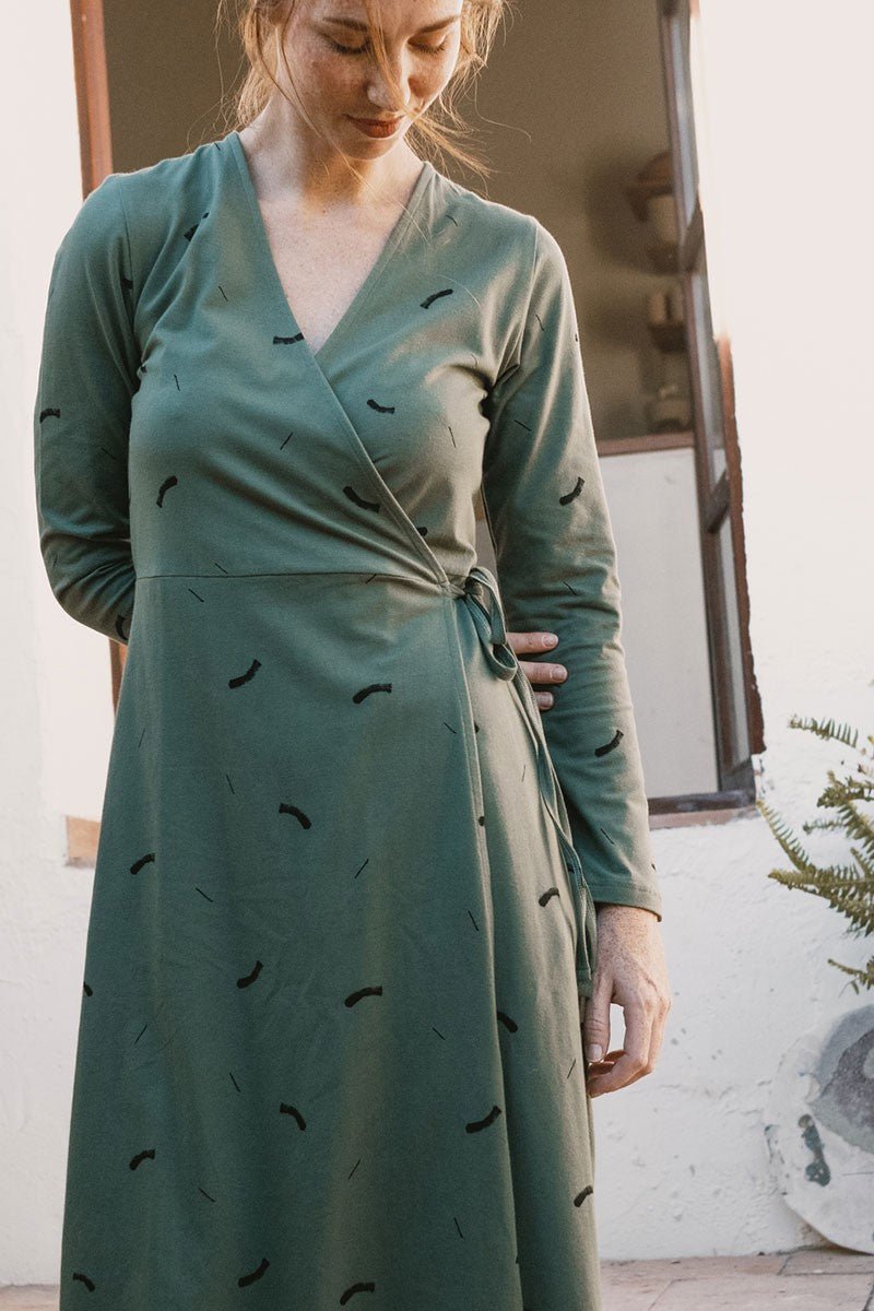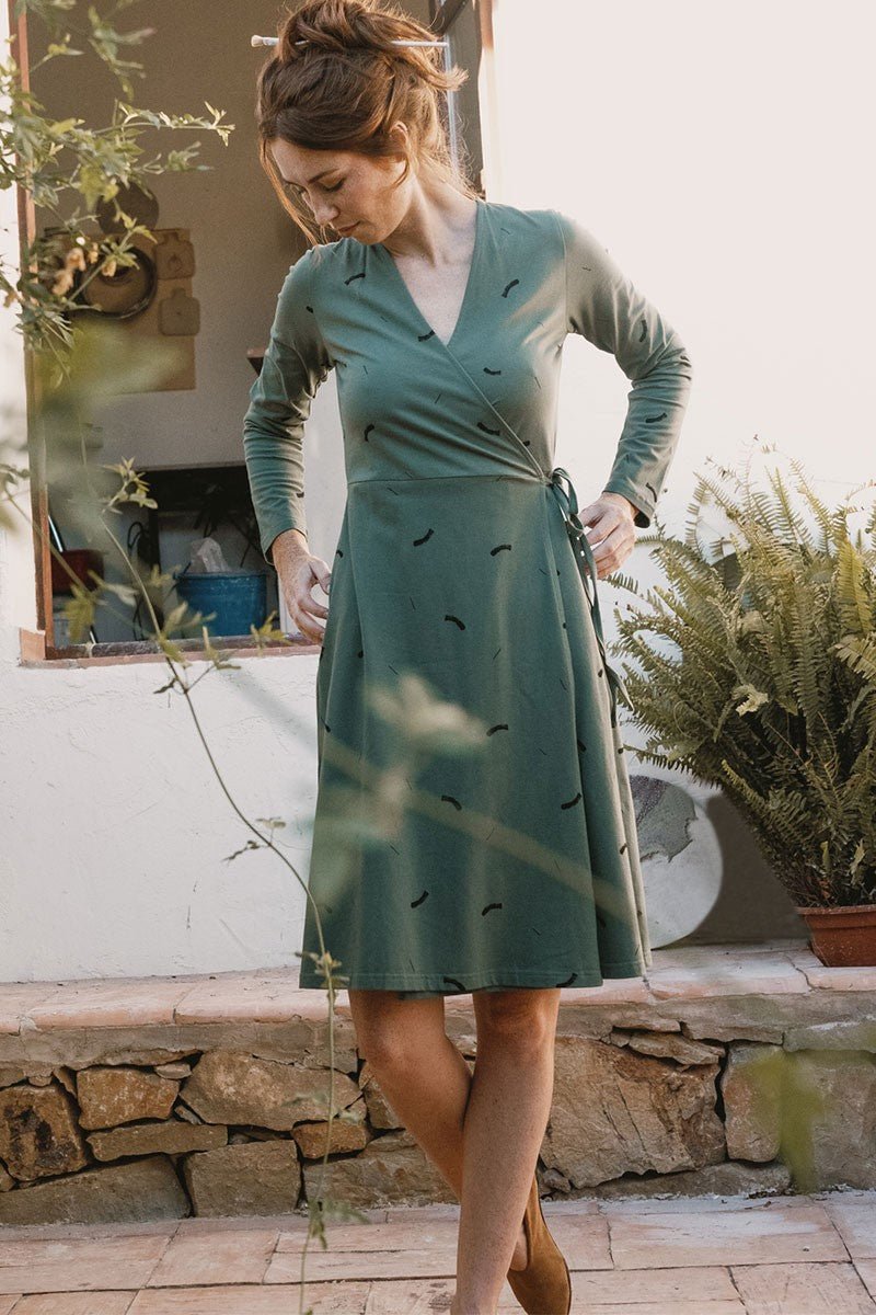 Janette is a long-sleeved knitted crossover dress. A tight-fitting dress with an inner lacing and a belt that allows you to adjust it to your waist size. At the back, it has an elastic for a perfect fit to your silhouette. Comfortable, versatile and elegant at the same time. The rupestrian strokes print in beige of the Earth collection, inspired by mother earth, gives a unique and special touch to the garment. This garment has a very soft and pleasant feel on the skin. It is hypoallergenic and free of chemicals. Sarah is 1,81cm and wears size S, Raquel is 1.68 cm and wears size S, Monica is pregnant, she is 1.57 cm and wears a size S.